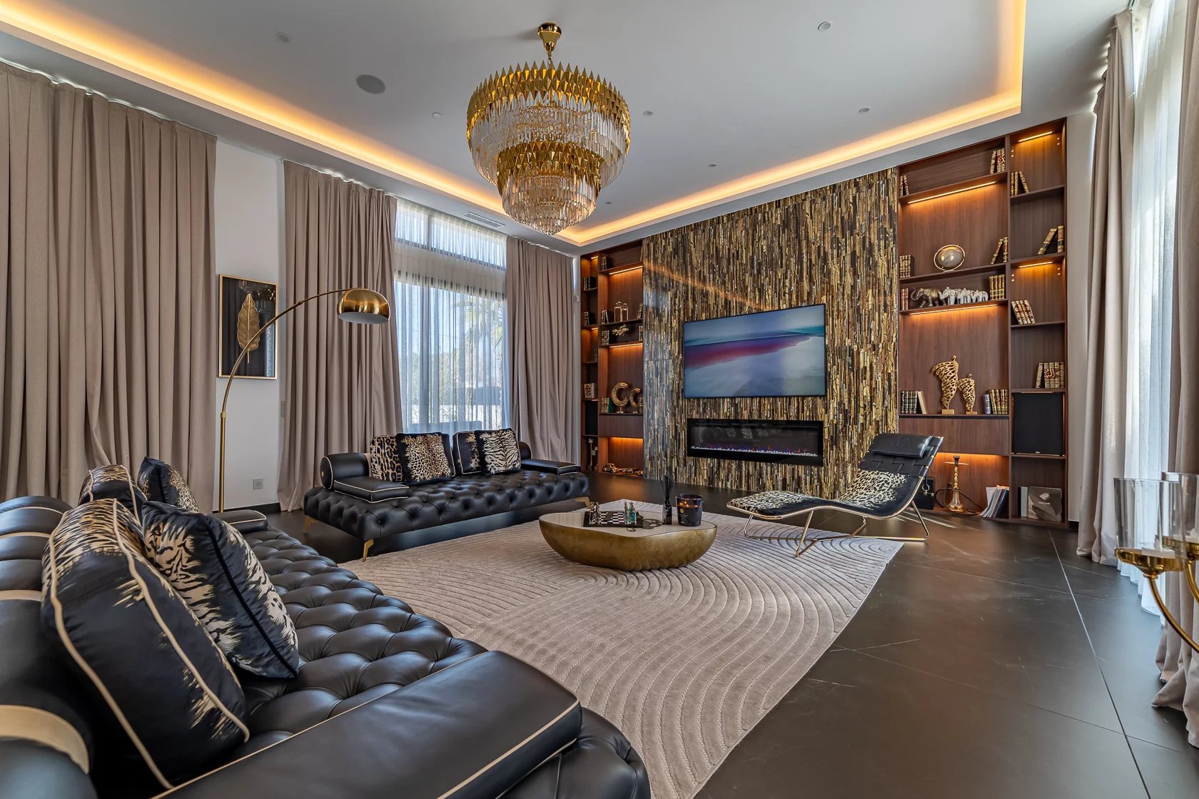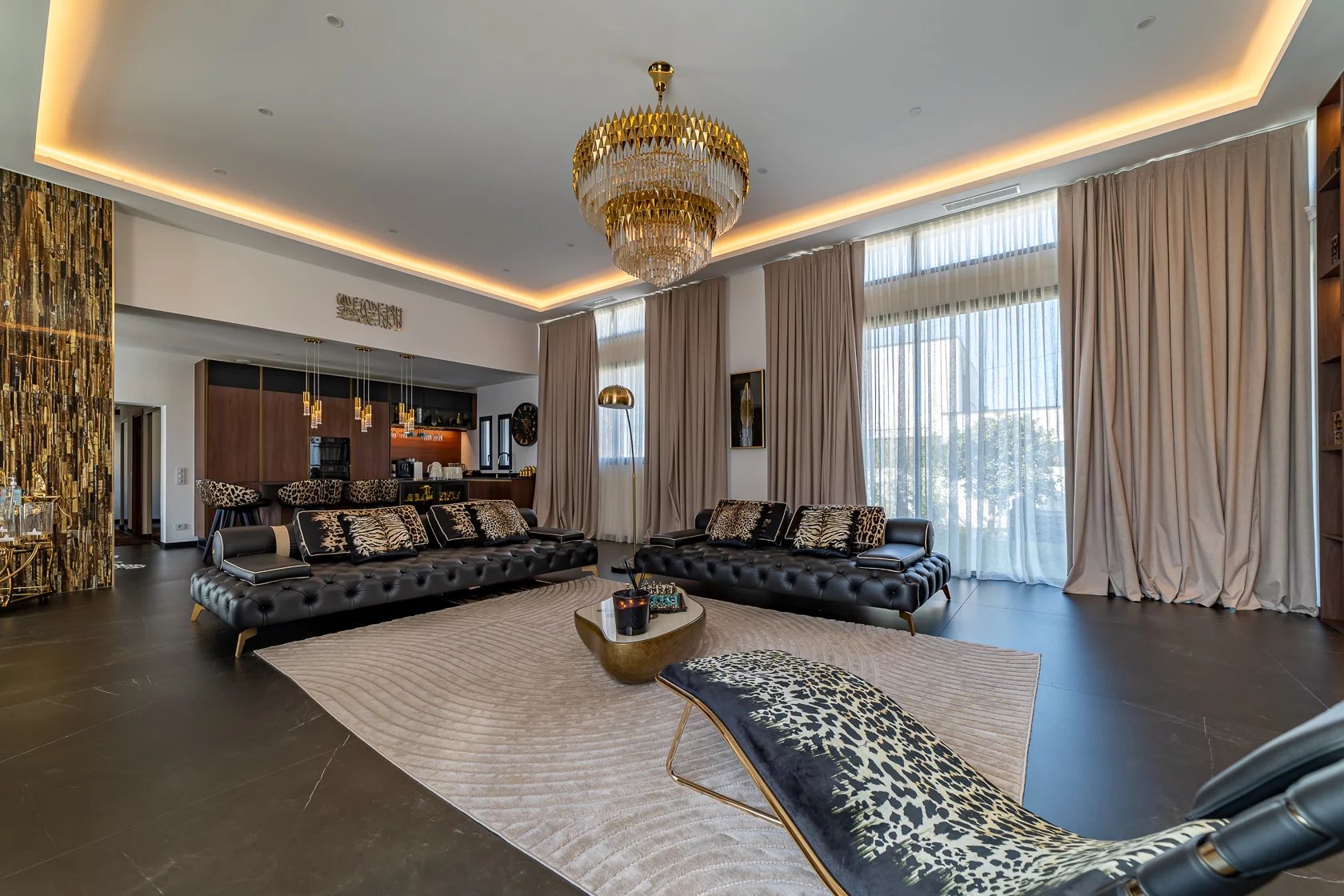 Le rez-de-chaussée offre une entrée spacieuse menant vers une pièce de vie spectaculaire de 100 m² avec 5 mètres de hauteur sous plafond, comprenant un séjour, une salle à manger et une cuisine américaine ultra-équipée. Cet espace baigné de lumière bénéficie de larges baies vitrées donnant directement sur le jardin et la piscine.