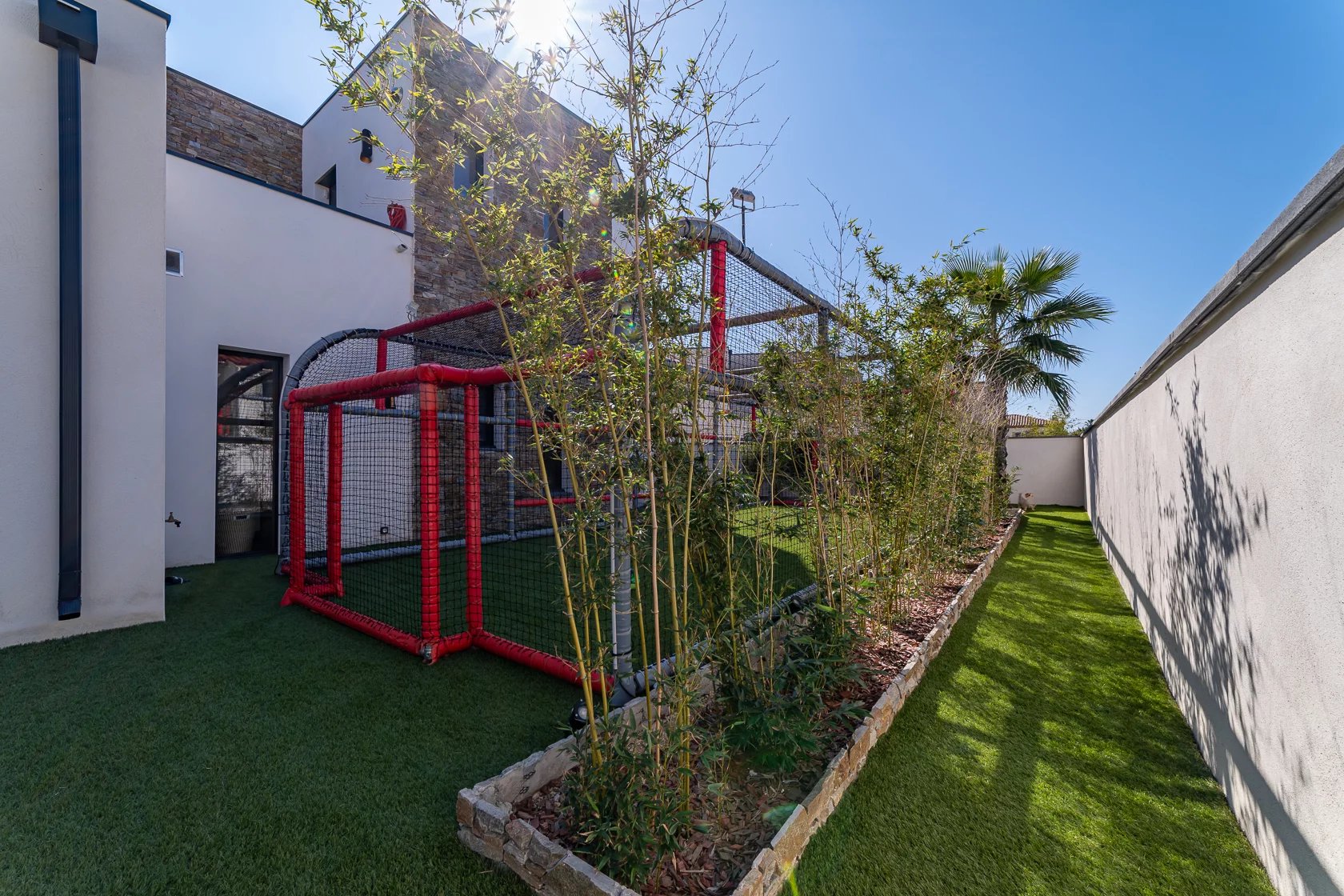Les extérieurs disposent d’un jardin paysagé, d’une piscine moderne et de deux terrasses, idéales pour la détente et les réceptions.