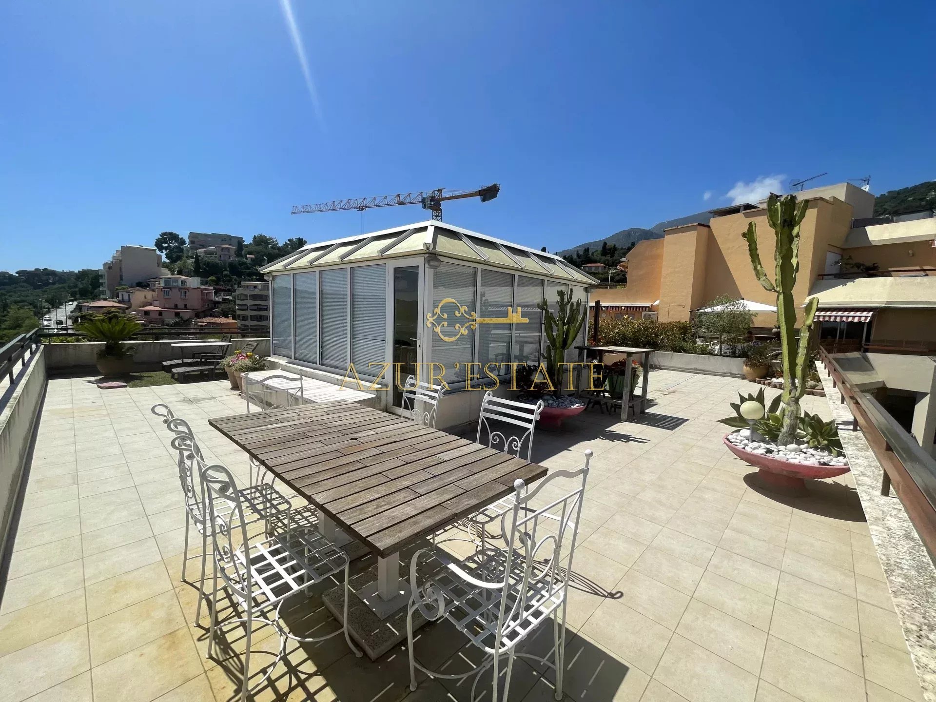 Situé dans Carnoles à proximité immédiate de la gare SNCF et de tous les commerces, dans une copropriété bien entretenue en dernier étage bénéficiant d'un toit terrasse d'environ 108 m2 avec vue panoramique sur la mer, 2 balcons, appartement traversant, lumineux, climatisé, d'environ 72m2, il se compose : d'une entrée, d'un séjour avec cuisine semi-ouverte ouvrant sur balcon, de 2 chambres avec dressing et balcons, d'une salle de douche, d'un WC séparé, à l'étage se trouve la cuisine d'été et la terrasse. Une cave et un garage fermé en sous-sol complètent ce bien.