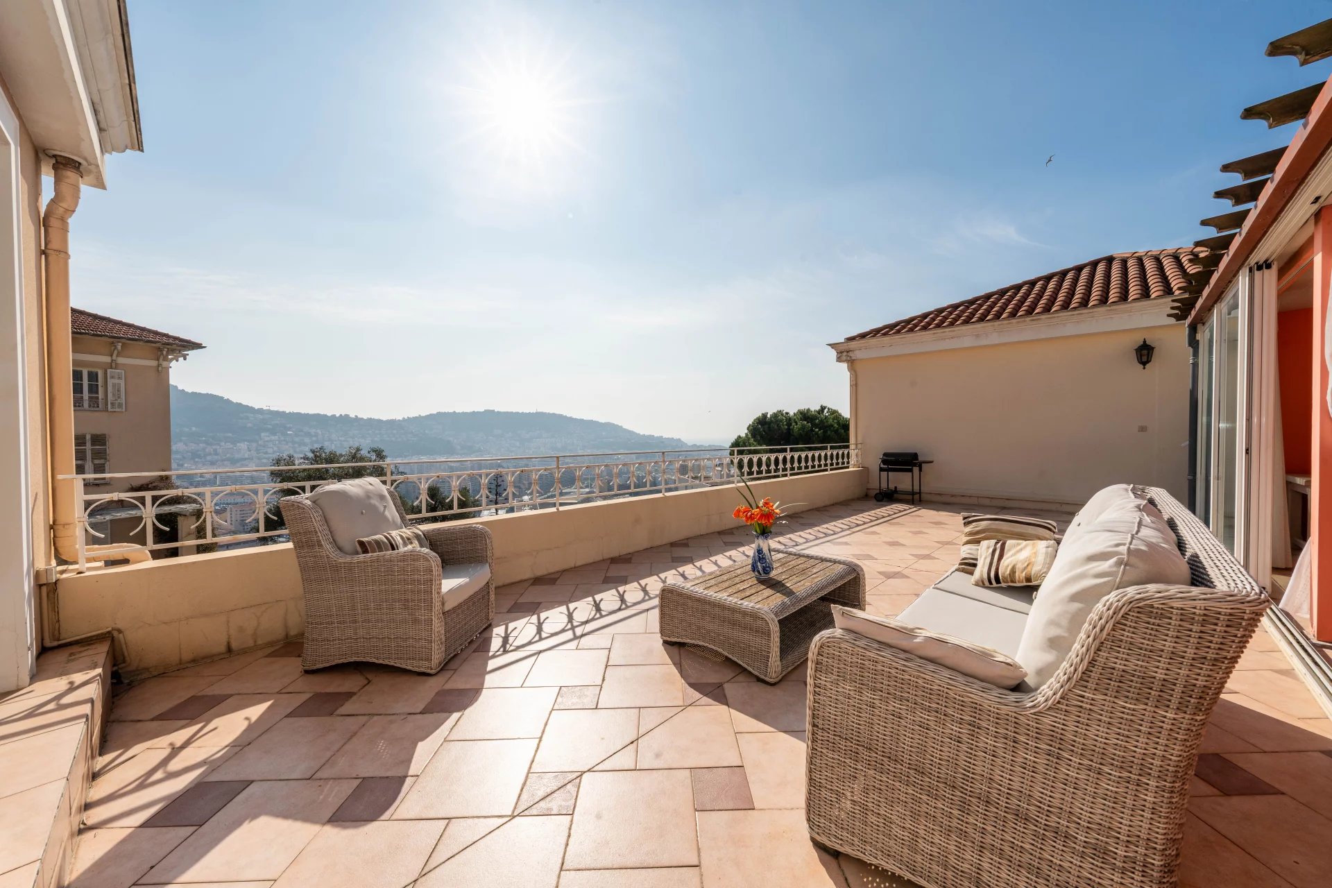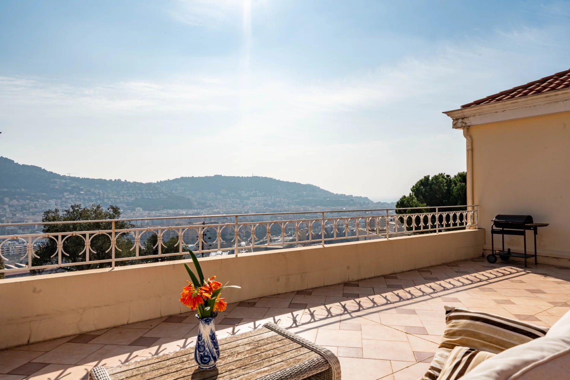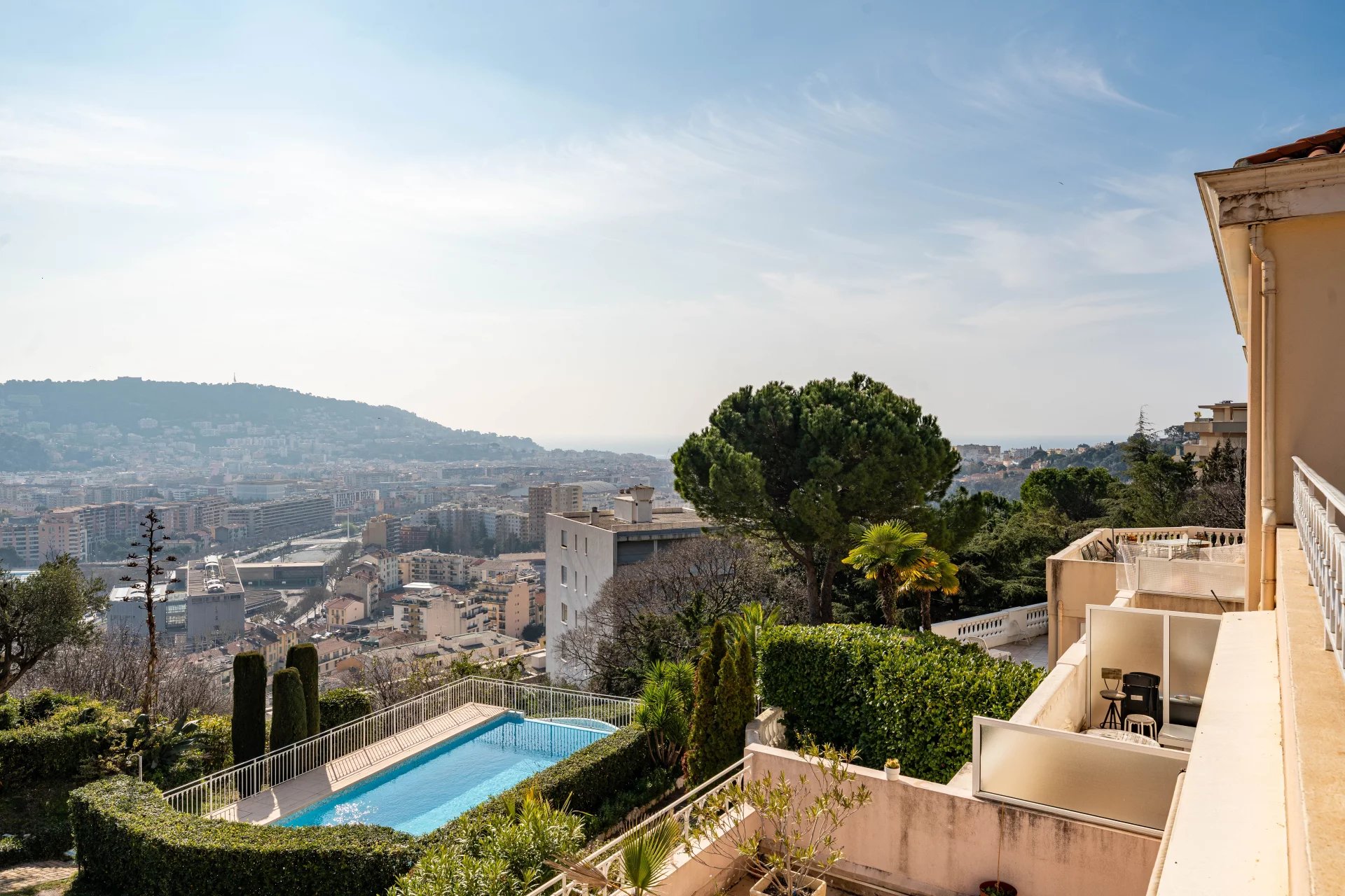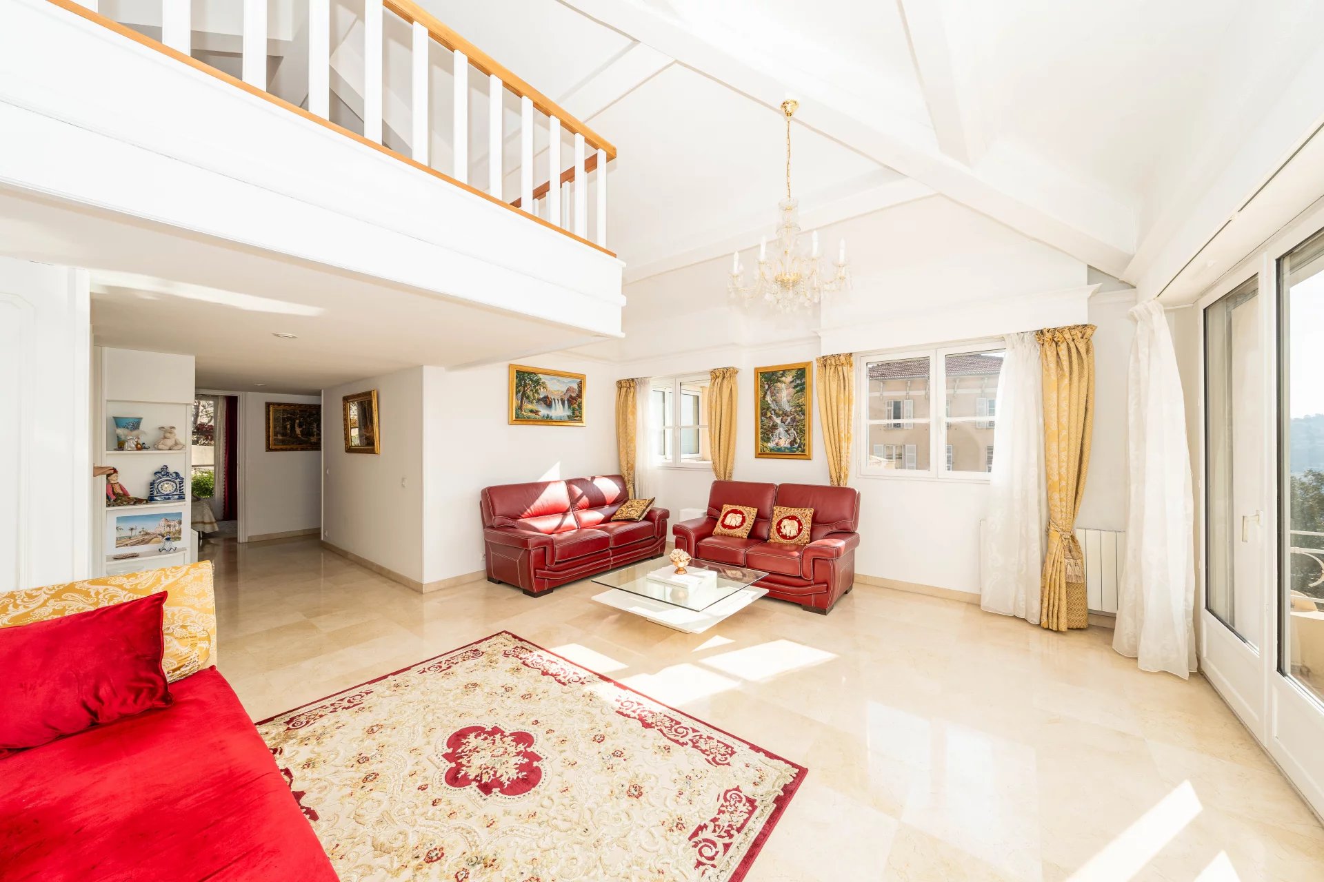 RARE! Appartement "Villa sur le toit" de 130 m2² avec un grand jardin de 180 m2 et ses arbres fruitiers, une terrasse de 46 m², une véranda de 29 m2, au dernier étage d'une belle résidence sécurisée de standing de 1994, parfaitement entretenue, avec piscine. Vue mer et colline du Château, exposition sud-est. Cet appartement se situe dans l'un des secteurs les plus résidentiels de Cimiez, tout proche des jardins du Monastère de Cimiez. Il se compose d’un grand hall d’entrée avec coin bureau, un séjour lumineux s’ouvrant sur une grande terrasse avec accès au jardin, une cuisine équipée donnant sur une véranda, deux chambres, dont une avec patio privatif et accès jardin, une troisième petite chambre/bureau, une mezzanine de 12 m2, une salle de bain, une salle de douche avec wc, un wc séparé, un dressing. Appartement en excellent état avec climatisation dans toutes les pièces, marbre et parquet au sol. L’appartement pourrait être vendu meublé. Vous apprécierez son environnement calme et verdoyant. Un grand garage fermé en sous-sol ainsi qu'une cave accompagnent ce bien. Charges annuelles: 7.200 euros (comprenant eau froide, chauffage, entretien espaces verts et piscine, ascenseur…) Nombre de lots: 114 Les informations sur les risques auxquels ce bien est exposé sont disponibles sur le site Géorisques.