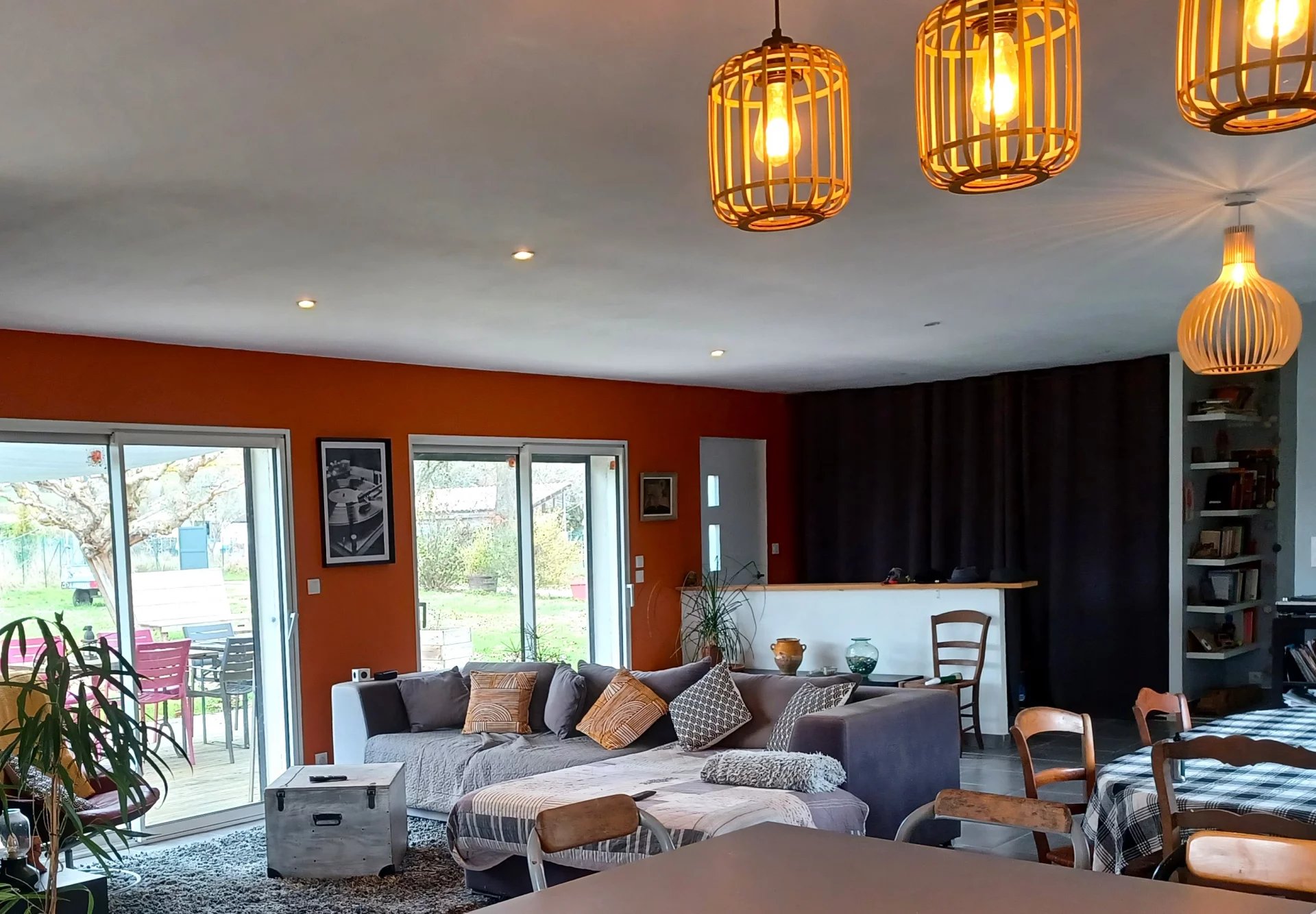Grande pièce de vie lumineuse de 65m² avec baie vitrée double vitrage donnant sur la terrasse