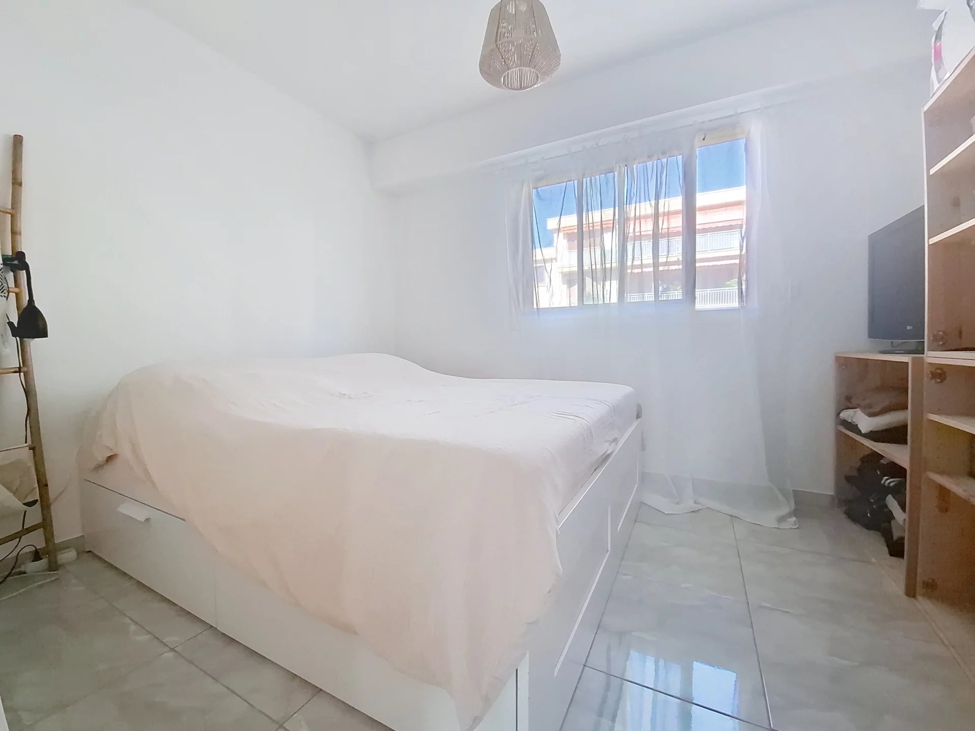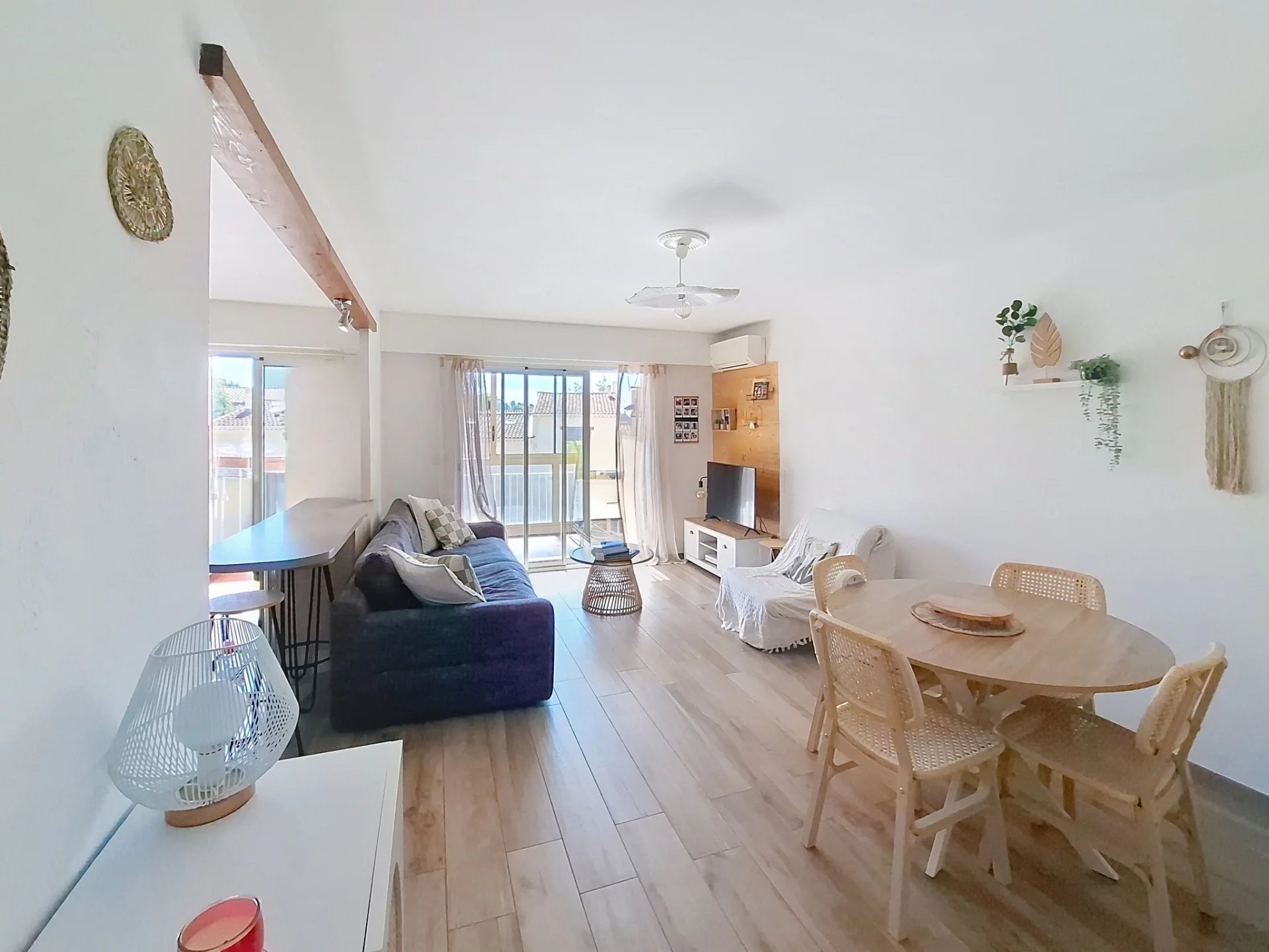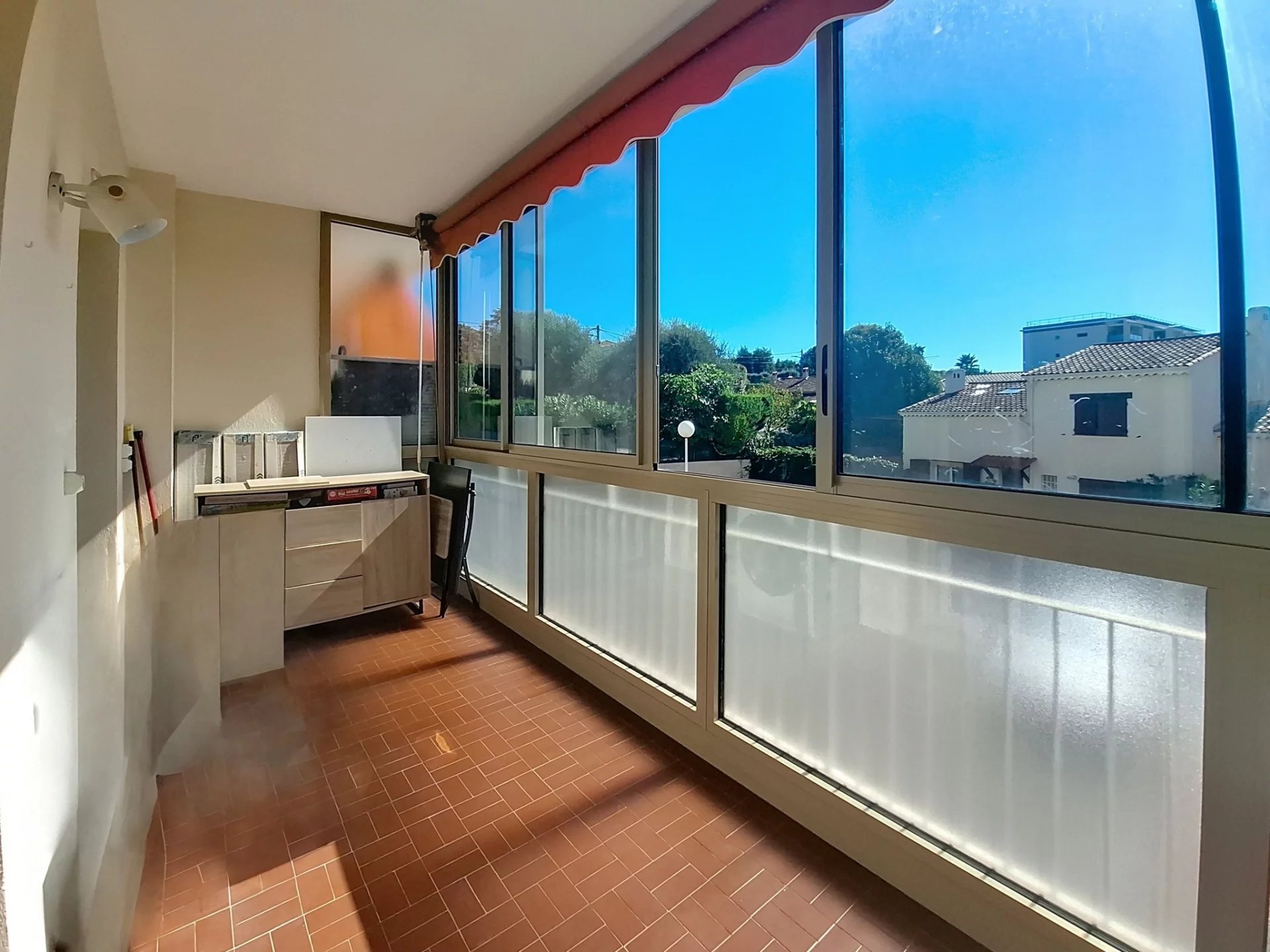 ANTIBES hauteurs dans petite résidence calme Bel appartement traversant de 3 Pièces composé d'une grande entrée séjour cuisine américaine 2 chambres salle d'eau et wc séparés. nombreux placards. parfait état le tout ouvrant sur grande terrasse fermée en véranda. cave et grand garage de plain-pied possibilité de garer une deuxième voiture facilement. à visiter