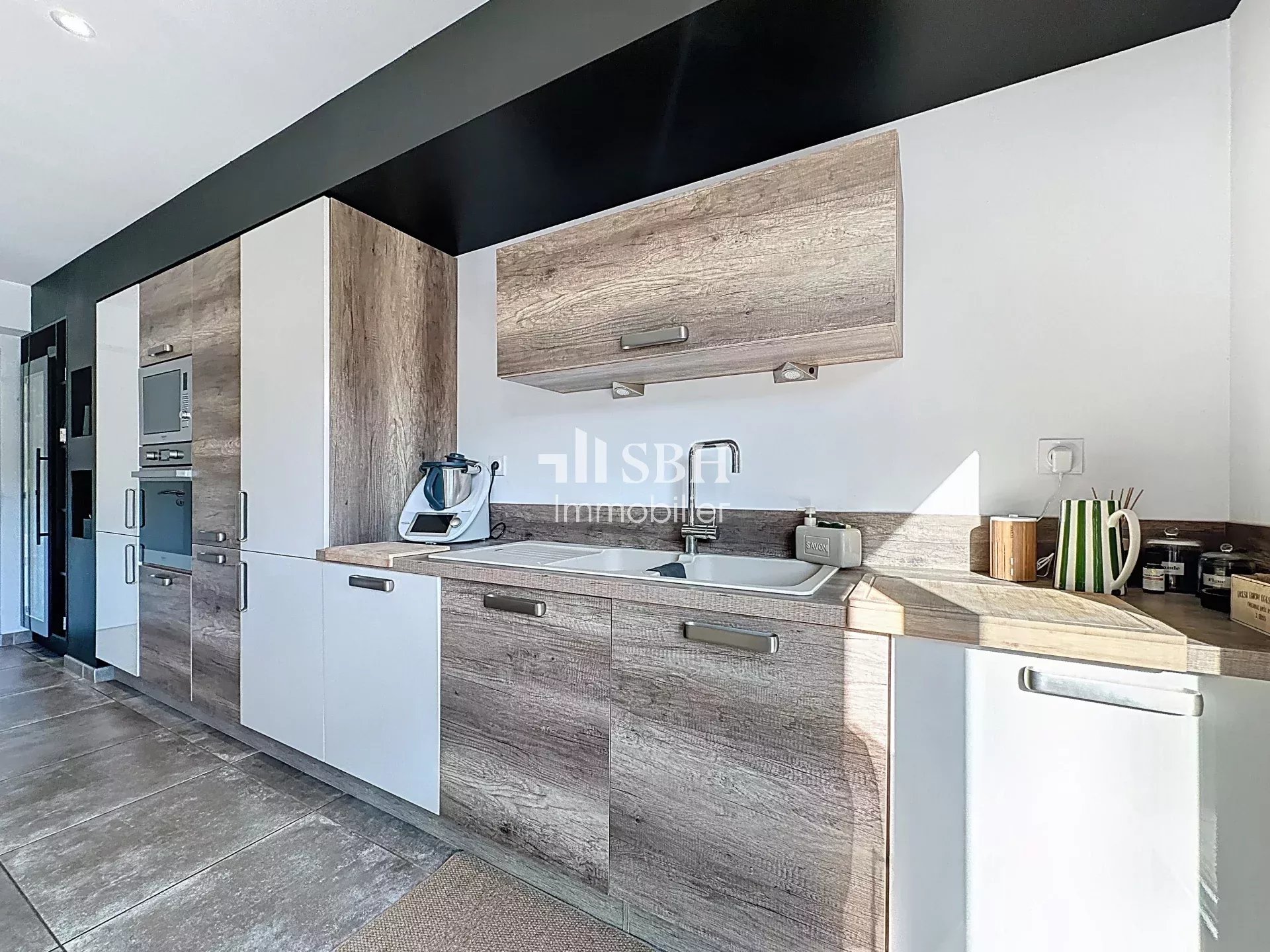 La pièce de vie, d’une surface de plus de 50 m², séduit d’emblée par ses volumes et sa luminosité. Elle s’organise autour d’une cuisine sur mesure entièrement équipée, ouverte sur un vaste salon-séjour où chaque espace a trouvé naturellement sa place. Une atmosphère chaleureuse, conviviale, idéale pour les moments en famille comme pour recevoir.