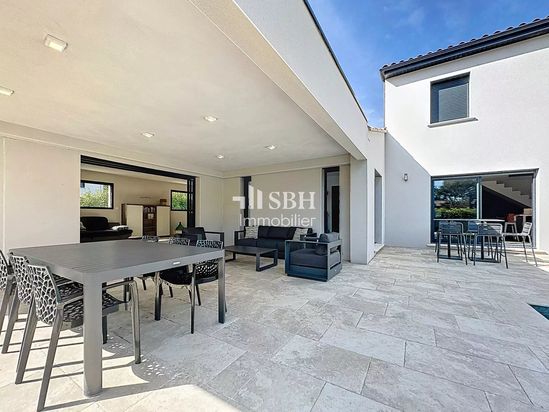 À l’extérieur, la terrasse d'environ 200 m² prolonge naturellement les espaces de vie. Elle s’ouvre sur un jardin paysager sans aucun vis-à-vis, soigneusement entretenu et parfaitement exposé. Véritable prolongement de la maison, c’est un lieu de vie à part entière, idéal pour profiter des repas en plein air, se détendre au bord de la piscine ou simplement savourer le calme ambiant.