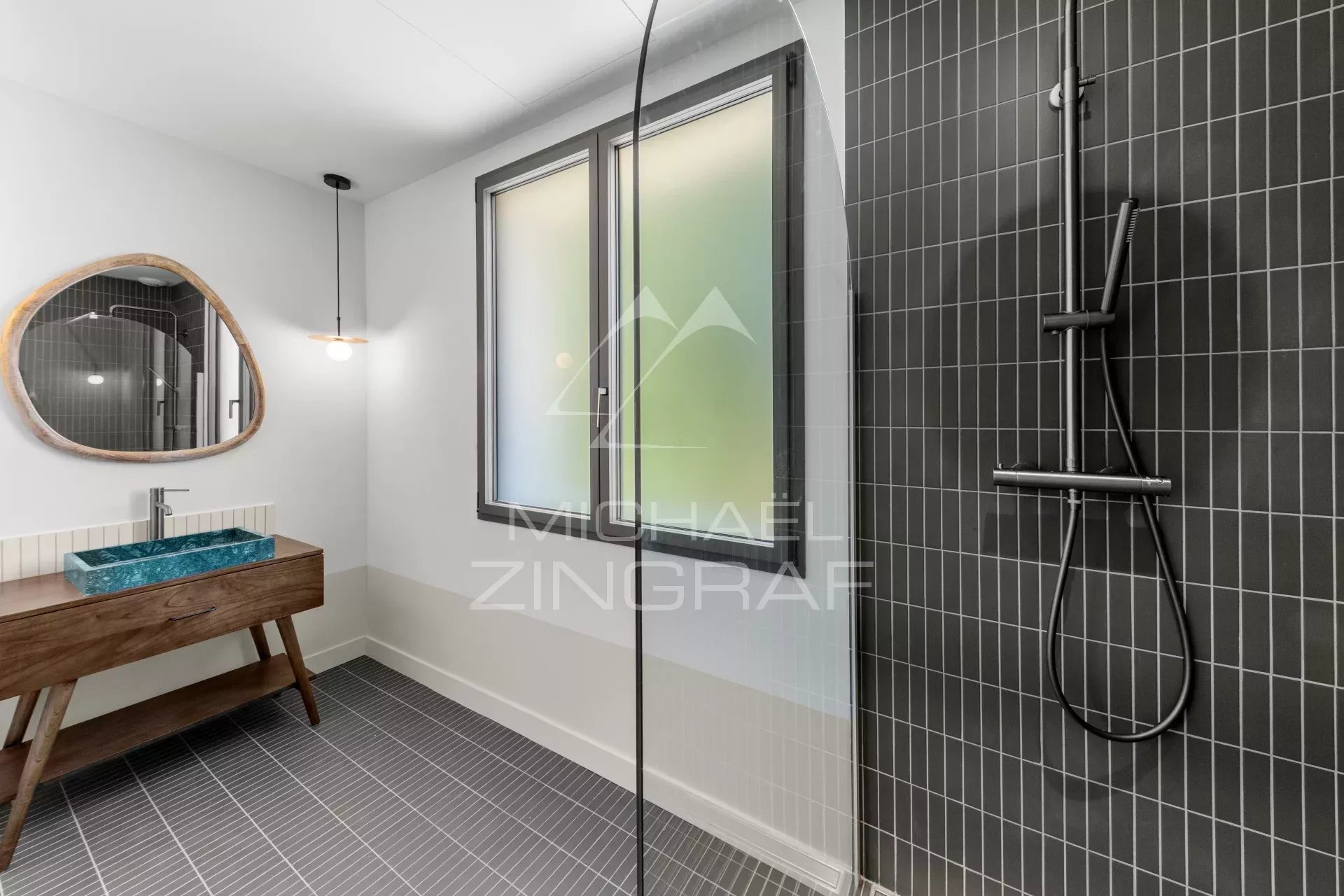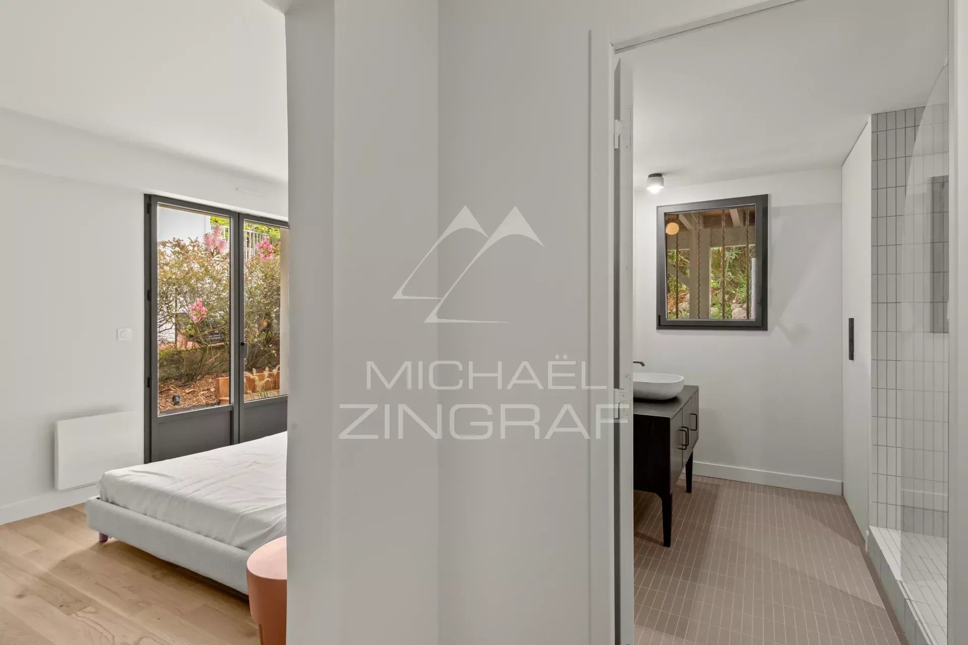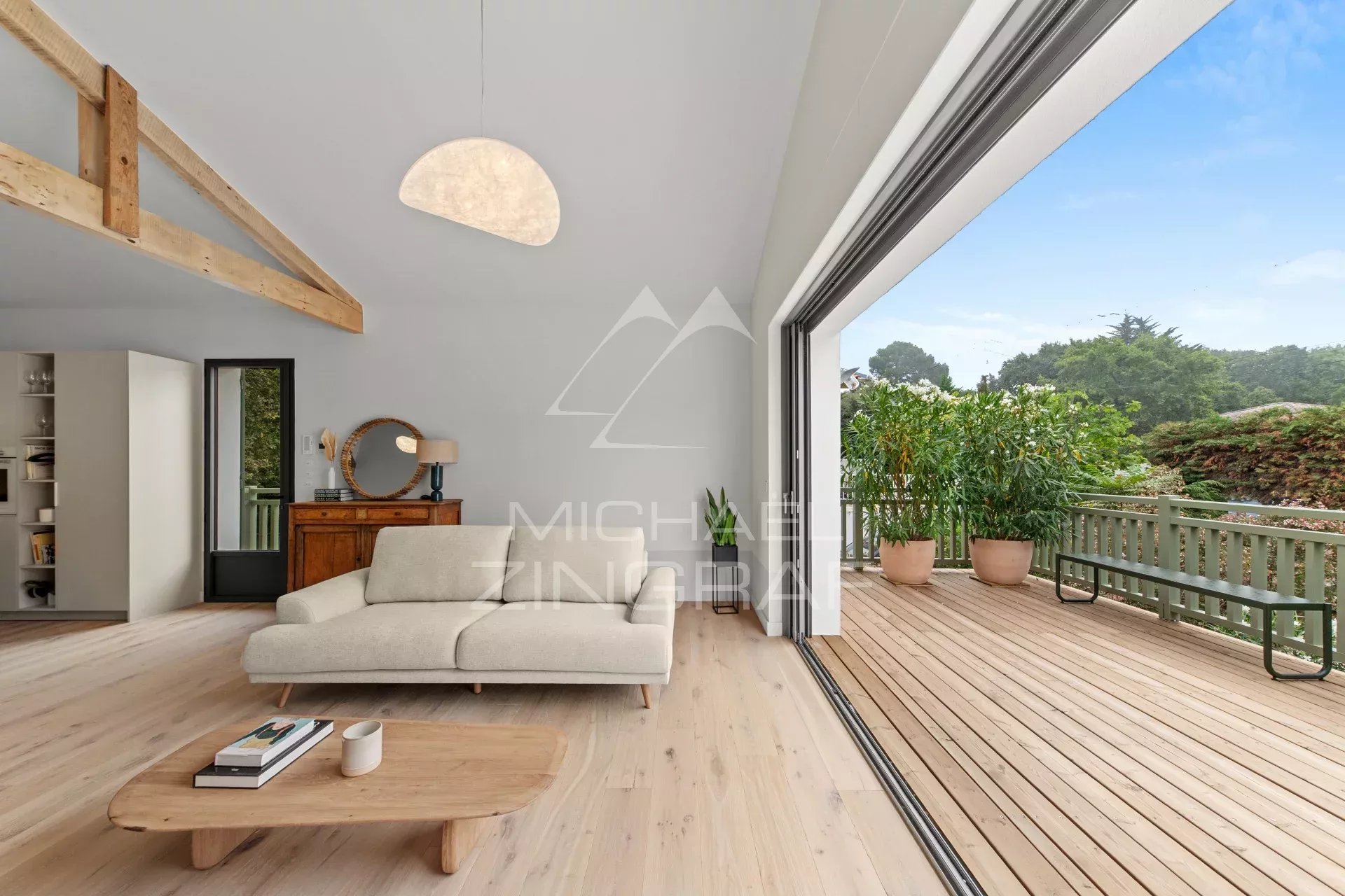 Michael Zingraf Real Estate vous propose cette maison idéalement située, aux portes du Moulleau, à seulement 7 minutes à pied de la plage des Arbousiers et à 4 minutes à pied des premiers commerces. Entièrement rénovée avec des matériaux nobles et une décoration raffinée, elle offre une surface habitable d’environ 124 m². Le premier niveau se compose d'un vaste séjour cathédrale baigné de lumière, une cuisine ouverte entièrement aménagée et équipée, une suite parentale avec placard et salle d’eau privative, ainsi qu’un WC indépendant. Au rez-de-jardin, une seconde suite parentale avec salle d’eau et rangements, deux chambres supplémentaires, une salle de bains, un WC indépendant et un espace buanderie. Chaque chambre bénéficie d'une ouverture sur le jardin. À l’extérieur, le jardin paysager soigneusement pensé dispose de deux terrasses et d’un espace de stationnement.
