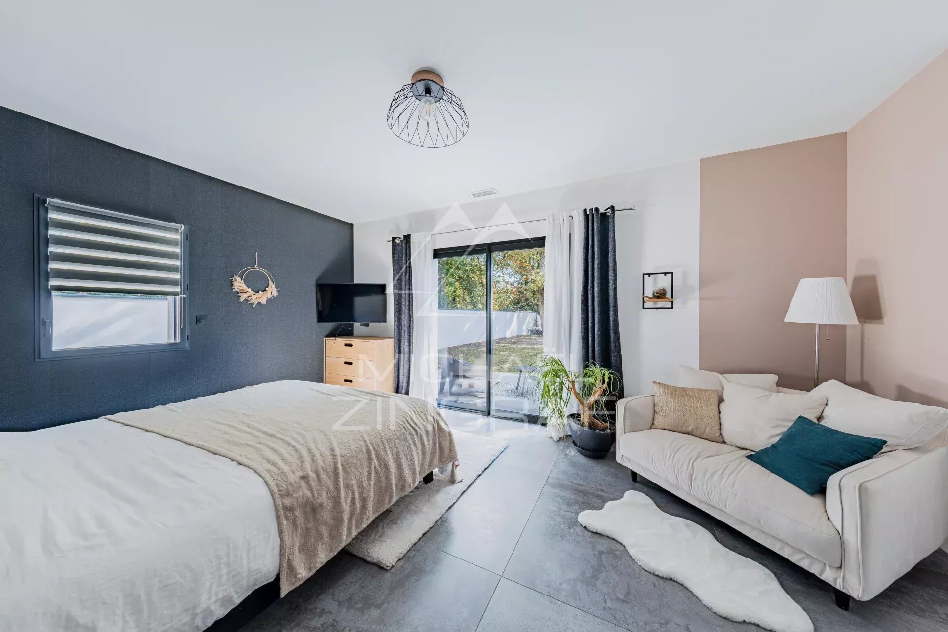 La villa principale, d’environ 210 m², s’organise autour d’un vaste espace de vie ouvert sur la nature : salon, salle à manger et cuisine se prolongent vers les terrasses et la piscine, effaçant les frontières entre intérieur et extérieur. La suite parentale, élégante et apaisante, s’accompagne de deux chambres supplémentaires, pensées dans le même esprit de confort.