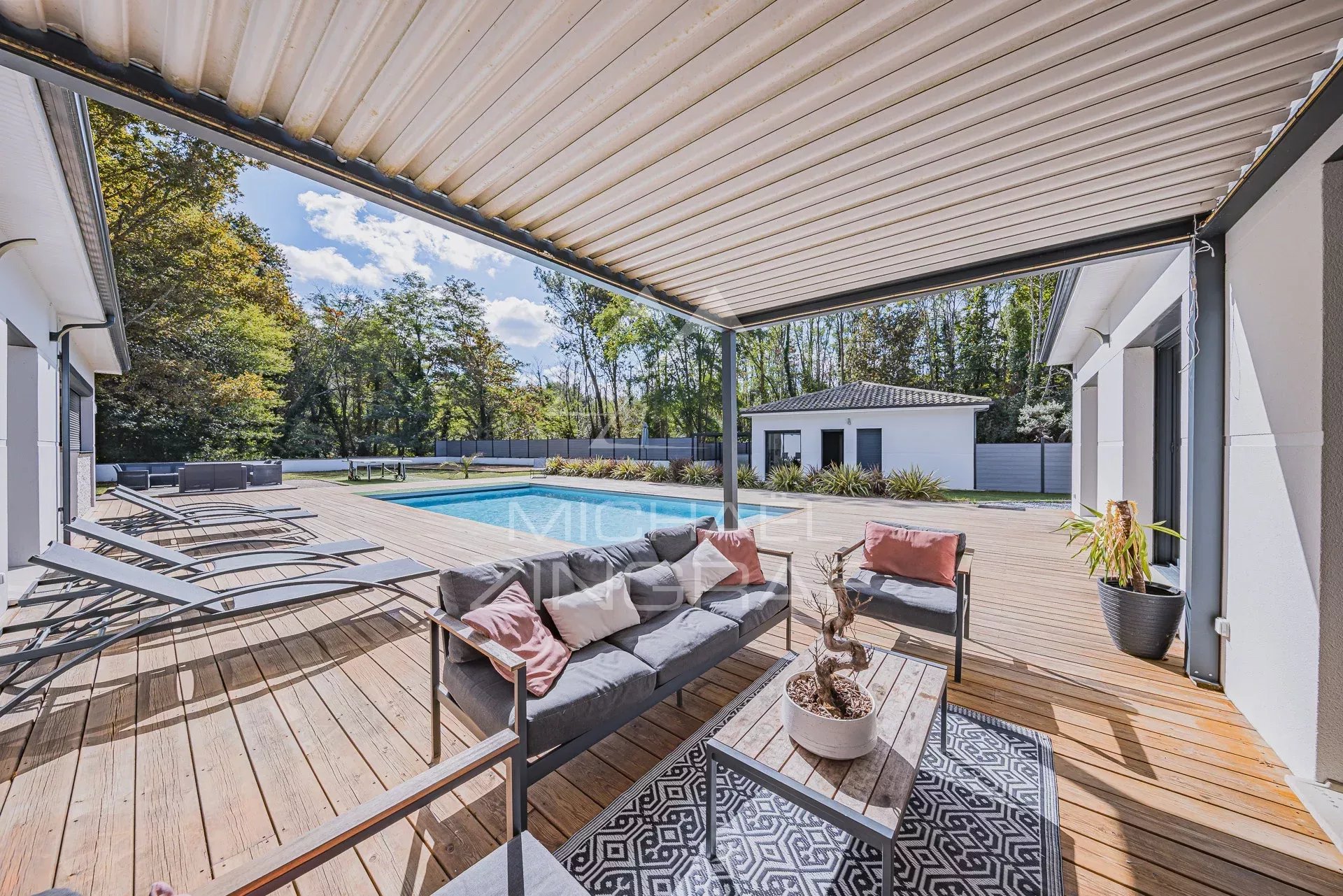 À l’extérieur, la vie s’organise autour d’une vaste terrasse de 300 m², d’une piscine chauffée, d’un pool house avec cuisine d’été et d’un espace bien-être couvert avec spa, pour profiter pleinement des beaux jours comme des soirées d’hiver.