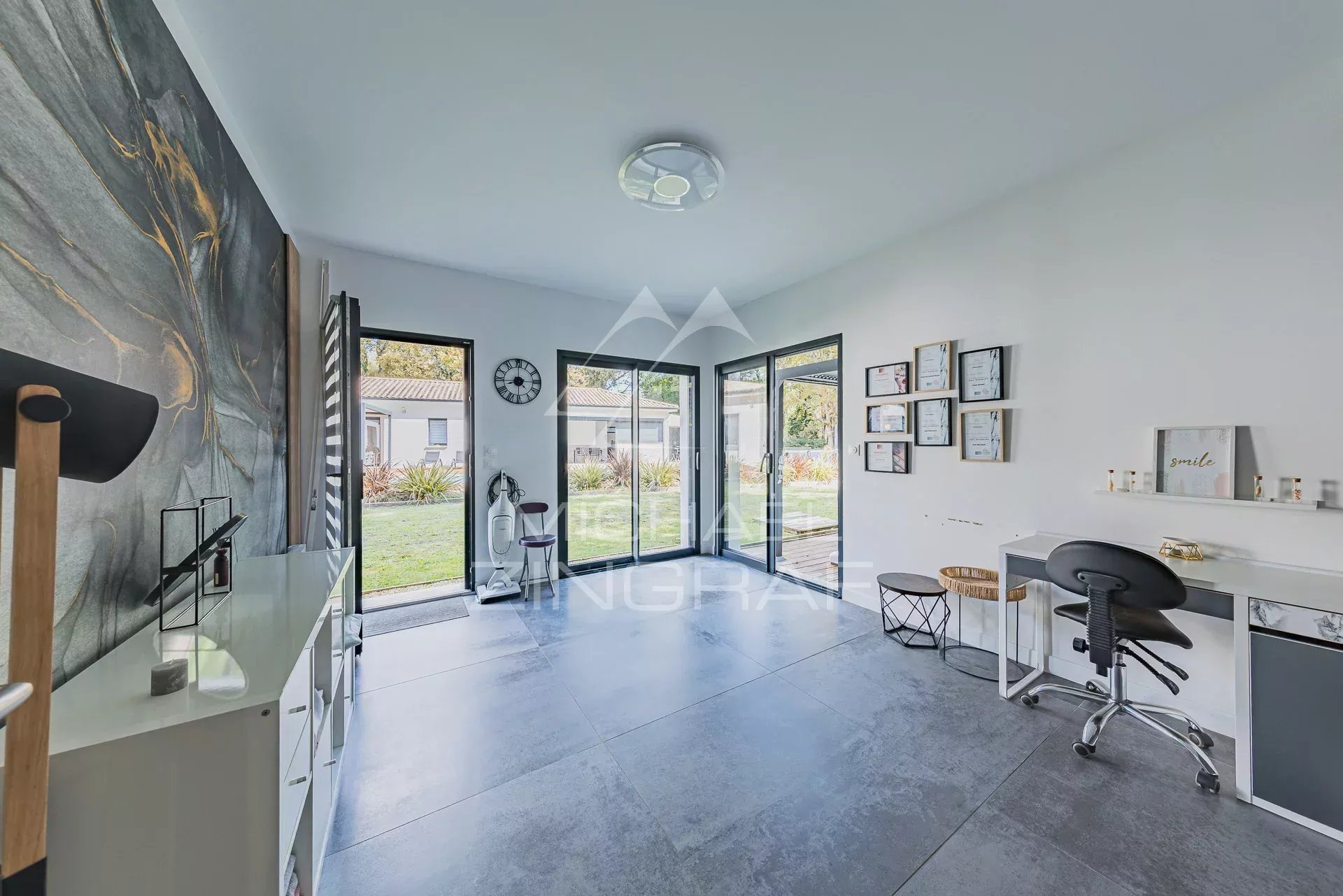 Une maison d’invités indépendante vient parfaire l’ensemble. Deux chambres, un salon-cuisine et un bureau ou chambre d’appoint permettent d’accueillir famille et amis en toute intimité, ou d’envisager une location saisonnière à forte rentabilité.