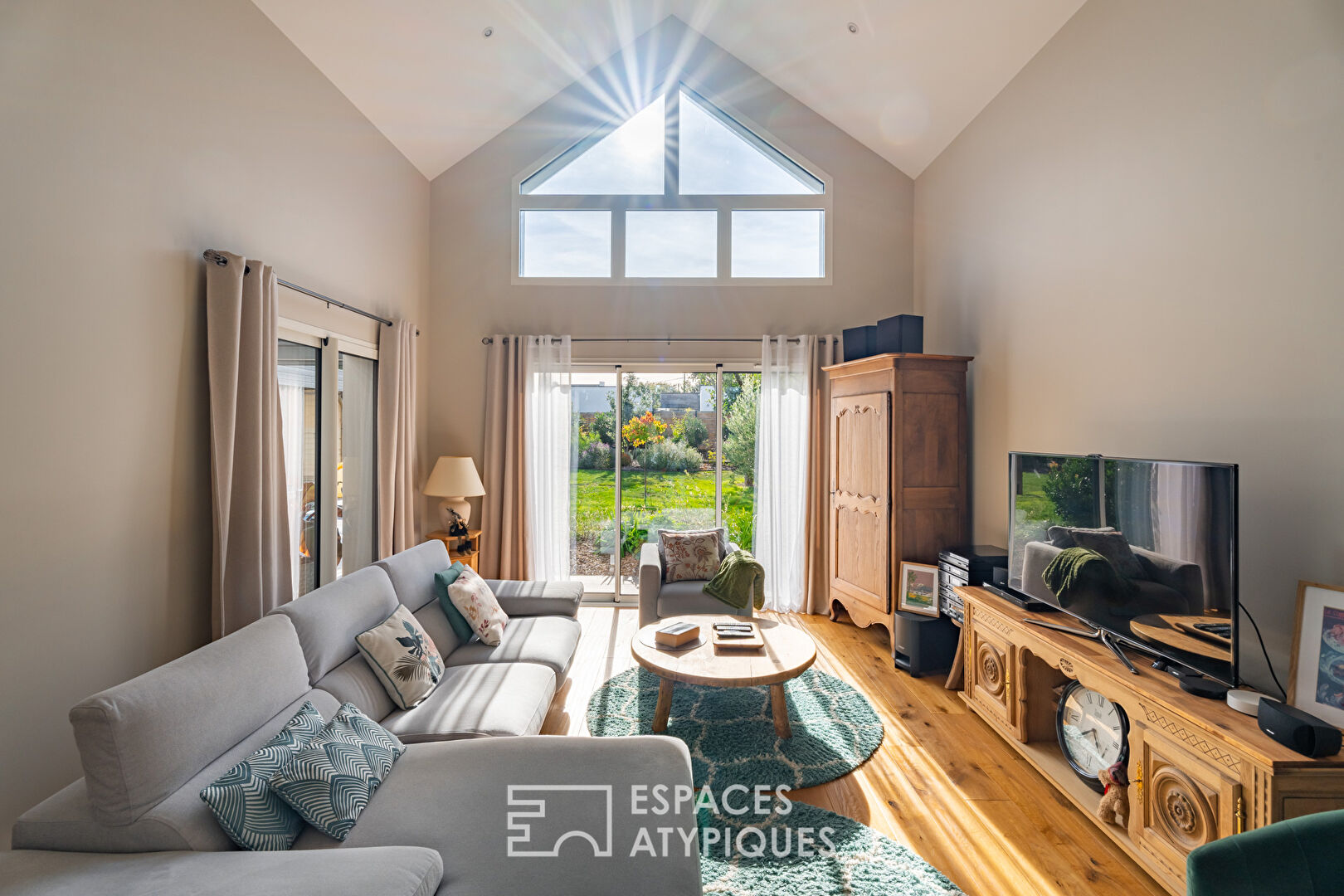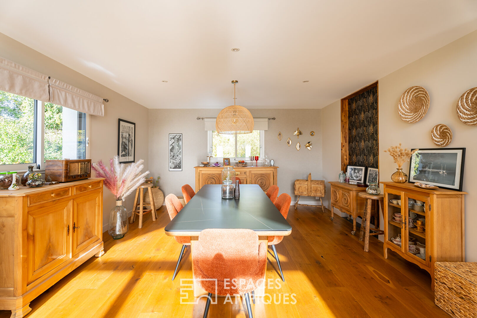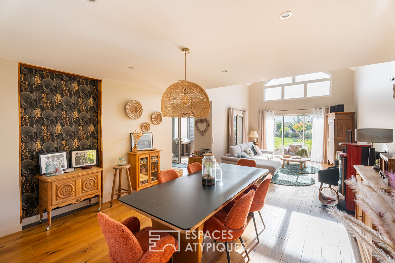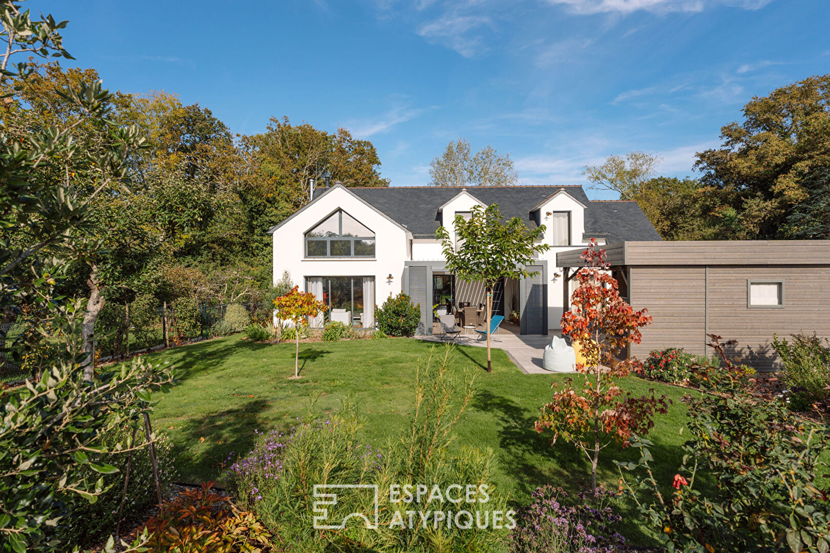 EXCLUSIVITÉ ESPACES ATYPIQUES Découvrez cette magnifique contemporaine d'environ 160m2 entièrement rénovée, située dans un cadre paisible à Saint-Armel au bord du golfe du Morbihan proche des sentiers côtiers et du centre bourg. A seulement 15 minutes de Vannes et 10 minutes de Sarzeau, ce bien allie confort moderne et proximité avec les commerces. Dès l'entrée, vous serez séduit par la lumière naturelle qui baigne cet espace de vie. Le rez-de-chaussée comprend une vaste entrée, une cuisine aménagée et équipée, ainsi qu'un grand salon séjour avec plafond cathédrale, idéal pour accueillir vos proches et profiter de moments conviviaux. Une suite parentale vient compléter ce niveau pour une vie de plain-pied. A l'étage, vous trouverez deux chambres, une salle de bain avec douche et baignoire, ainsi qu'une mezzanine ouverte sur le salon, apportant une atmosphère chaleureuse à cette maison. A l'extérieur, cette propriété propose une pergola bioclimatique, parfaite pour profiter des doux moments de lumière en soirée. Le jardin paysager et arboré est un véritable havre de paix, incluant une cuisine d'été et un espace jacuzzi pour des instants de détente privilégiés. Un garage accessible depuis le cellier, des dépendances ainsi qu'une serre viennent compléter cette propriété. Un lieu idéal pour allier confort, sérénité et commodité. CLASSE ENERGIE : A / CLASSE CLIMAT : A Montant moyen estimé des dépenses annuelles d'énergie pour un usage standard : 364 euros pour 2019 Les informations sur les risques auxquels ce bien est exposé sont disponibles sur le site géorisques : www.georisques.gouv.fr Denise Muteau RSAC Vannes 503 556 045 Contact : 06 12 71 52 43 Denise Muteau (EI) Agent Commercial - Numéro RSAC : 503 556 045 - VANNES.