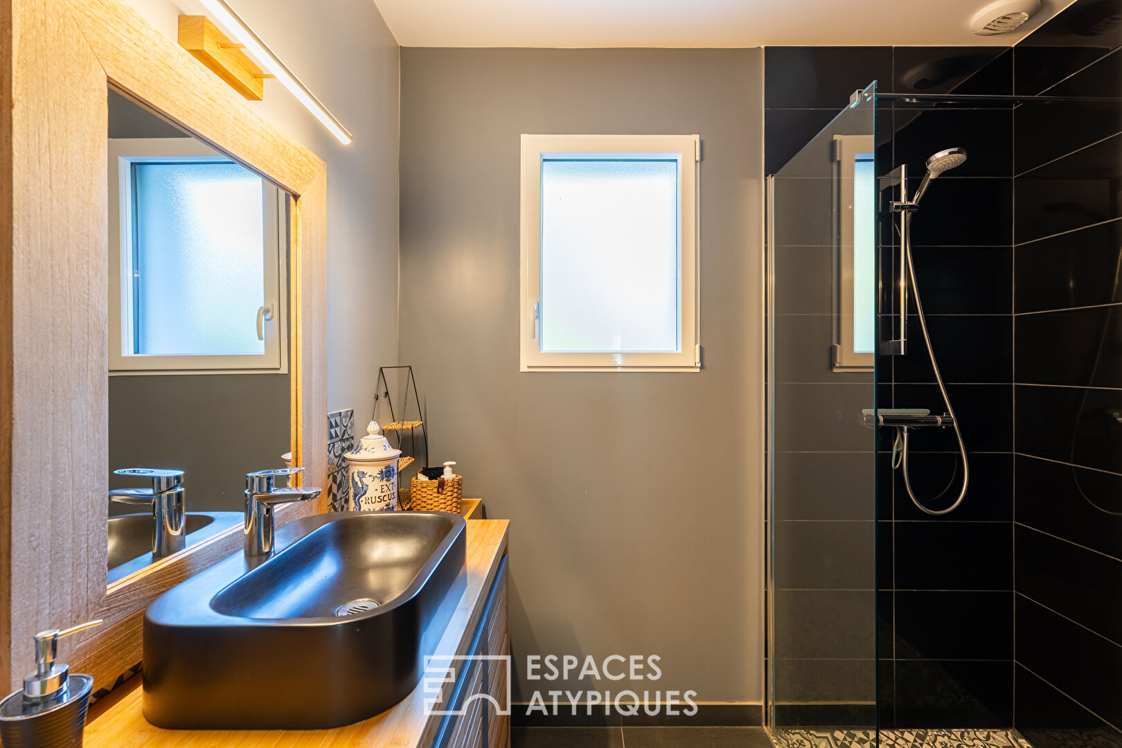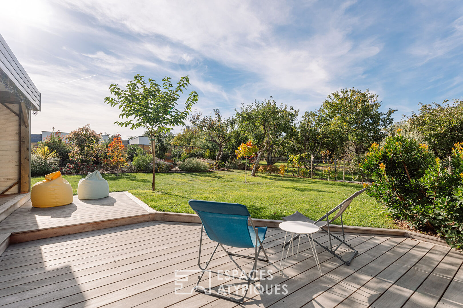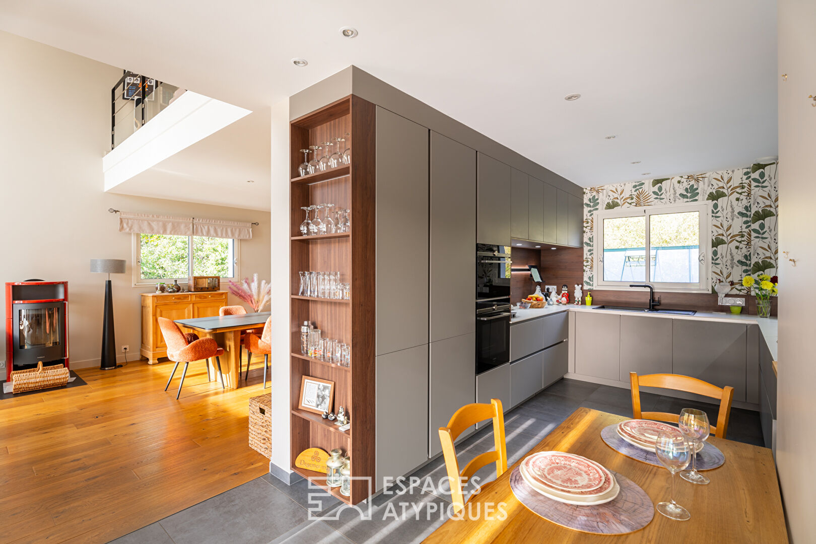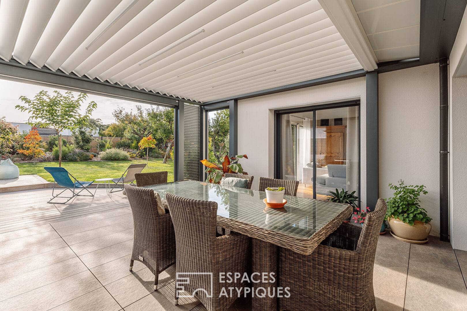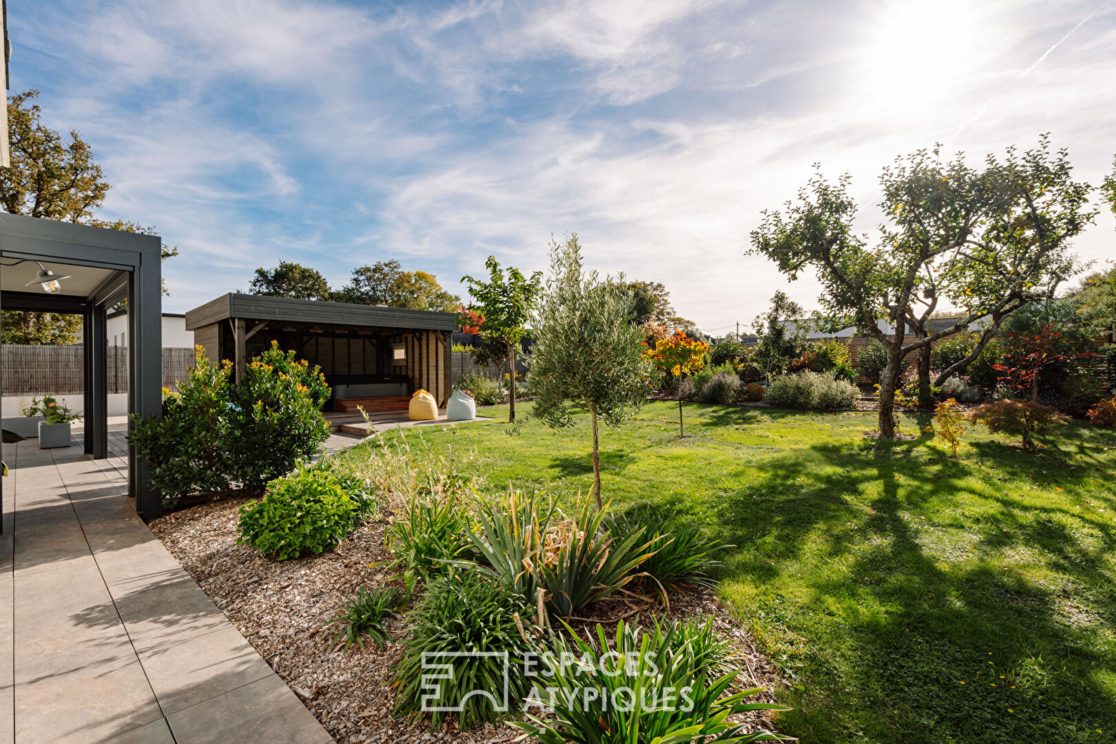 EXCLUSIVITÉ ESPACES ATYPIQUES Découvrez cette magnifique contemporaine d'environ 160m2 entièrement rénovée, située dans un cadre paisible à Saint-Armel au bord du golfe du Morbihan proche des sentiers côtiers et du centre bourg. A seulement 15 minutes de Vannes et 10 minutes de Sarzeau, ce bien allie confort moderne et proximité avec les commerces. Dès l'entrée, vous serez séduit par la lumière naturelle qui baigne cet espace de vie. Le rez-de-chaussée comprend une vaste entrée, une cuisine aménagée et équipée, ainsi qu'un grand salon séjour avec plafond cathédrale, idéal pour accueillir vos proches et profiter de moments conviviaux. Une suite parentale vient compléter ce niveau pour une vie de plain-pied. A l'étage, vous trouverez deux chambres, une salle de bain avec douche et baignoire, ainsi qu'une mezzanine ouverte sur le salon, apportant une atmosphère chaleureuse à cette maison. A l'extérieur, cette propriété propose une pergola bioclimatique, parfaite pour profiter des doux moments de lumière en soirée. Le jardin paysager et arboré est un véritable havre de paix, incluant une cuisine d'été et un espace jacuzzi pour des instants de détente privilégiés. Un garage accessible depuis le cellier, des dépendances ainsi qu'une serre viennent compléter cette propriété. Un lieu idéal pour allier confort, sérénité et commodité. CLASSE ENERGIE : A / CLASSE CLIMAT : A Montant moyen estimé des dépenses annuelles d'énergie pour un usage standard : 364 euros pour 2019 Les informations sur les risques auxquels ce bien est exposé sont disponibles sur le site géorisques : www.georisques.gouv.fr Denise Muteau RSAC Vannes 503 556 045 Contact : 06 12 71 52 43 Denise Muteau (EI) Agent Commercial - Numéro RSAC : 503 556 045 - VANNES.