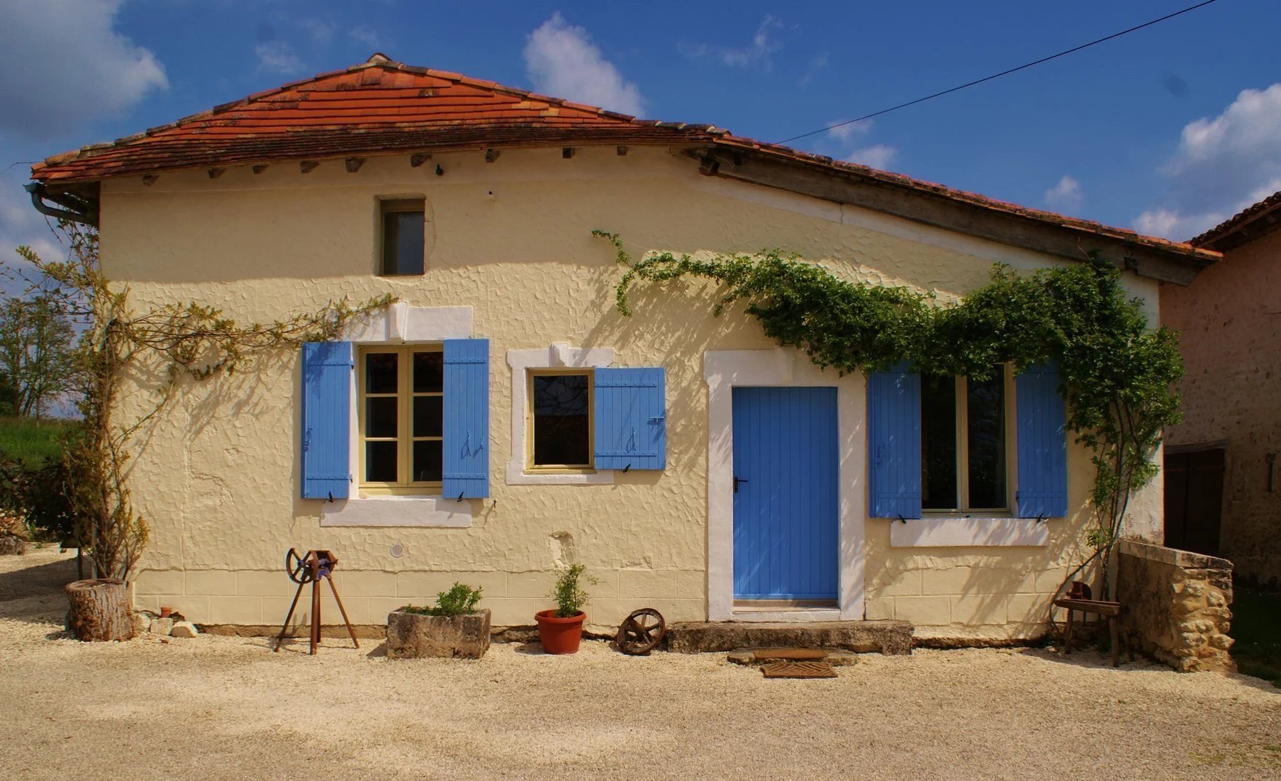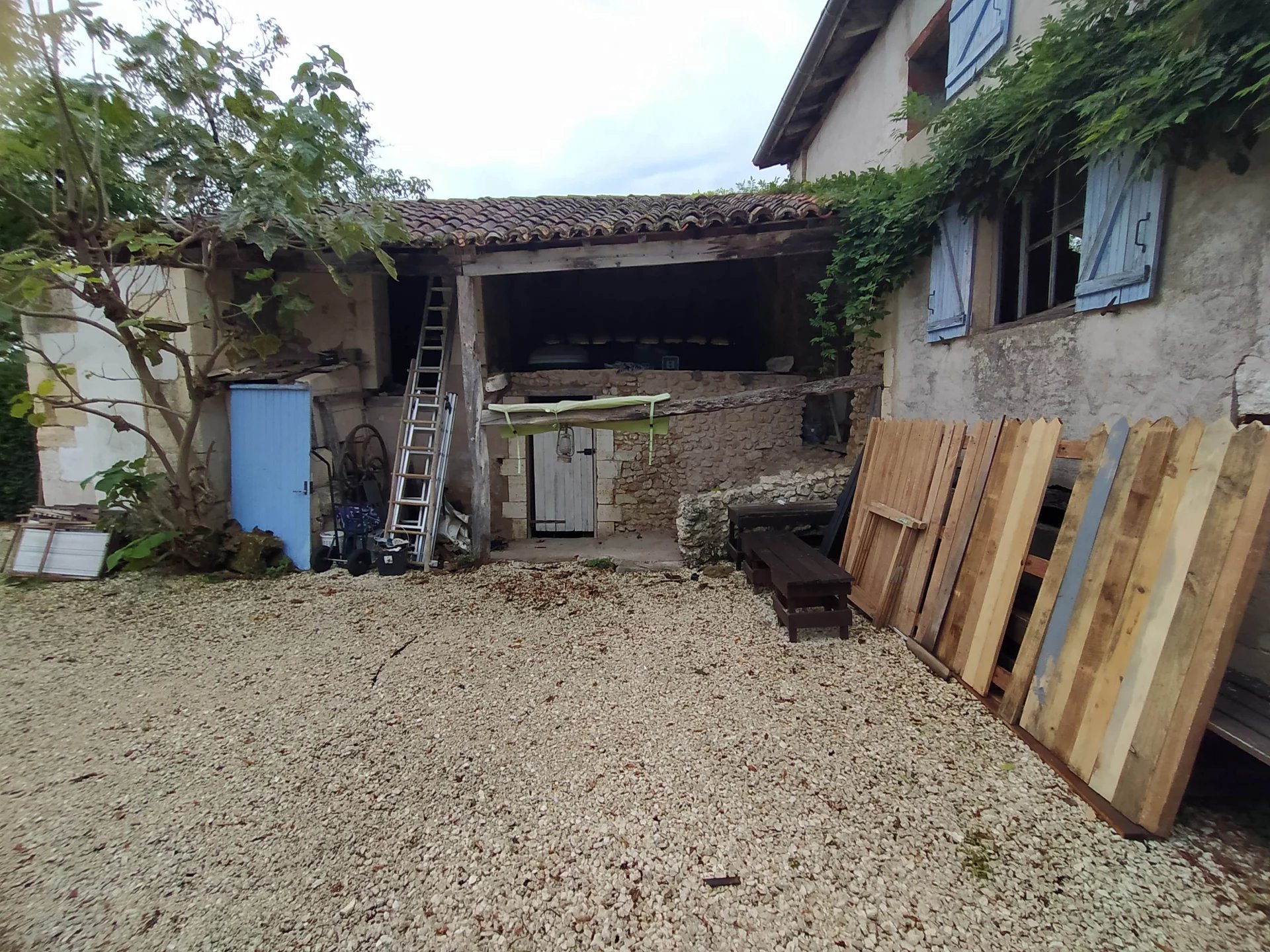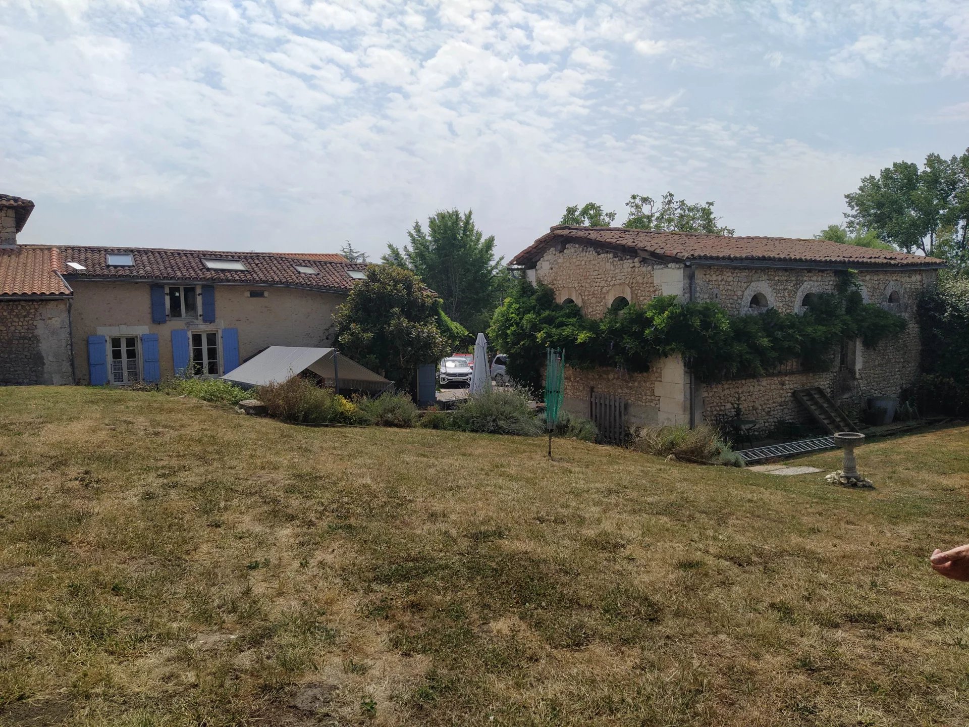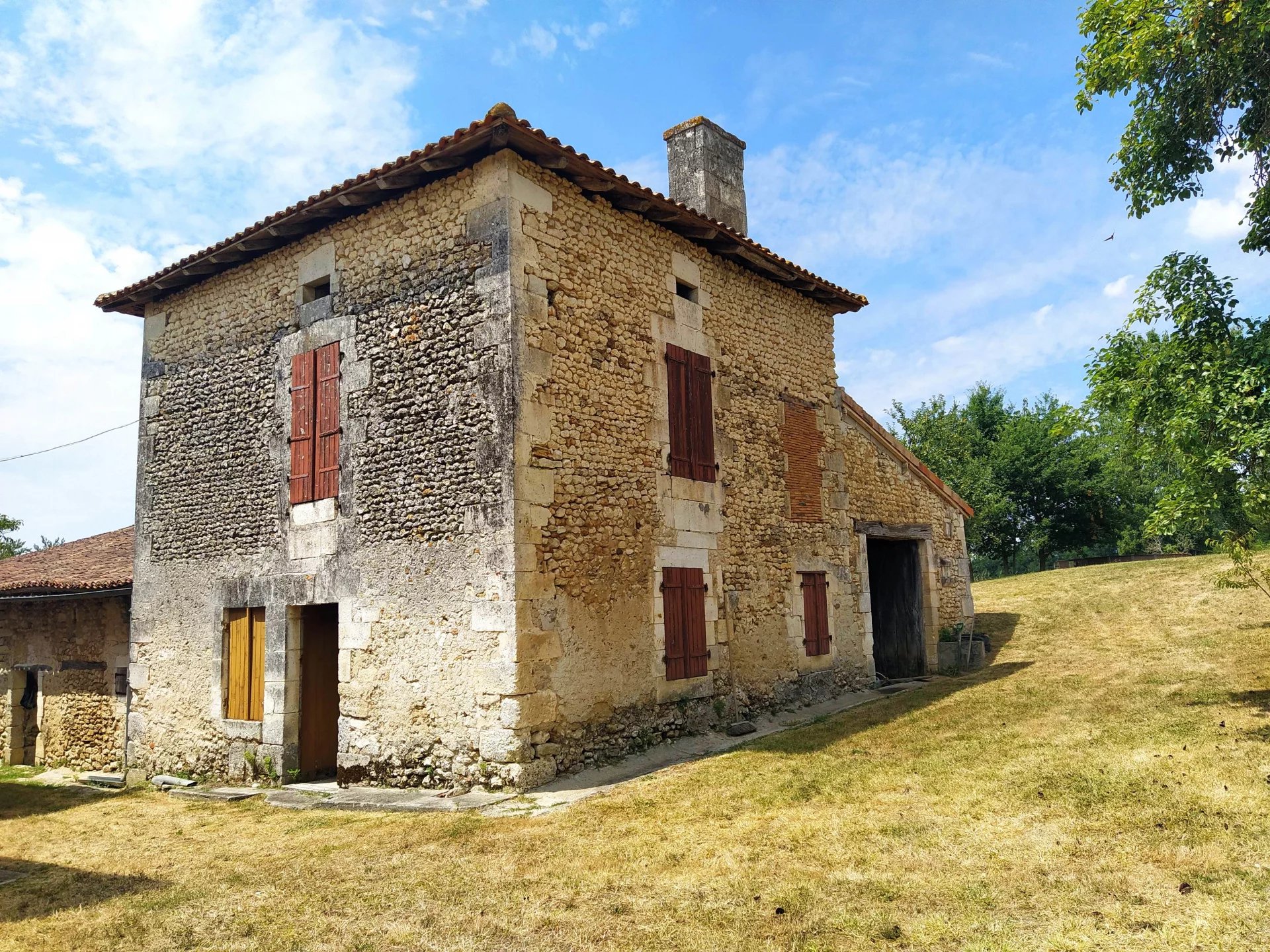 Situé dans un petit hameau de seulement quatre maisons, entouré de terres agricoles, cet ensemble de bâtiments de caractère comprend une maison principale équipée du chauffage central au gaz et d’un double vitrage partiel. Au rez-de-chaussée, la maison offre une cuisine, un salon chaleureux avec poêle à bois, une chambre principale avec salle d’eau attenante. À l’étage se trouvent une seconde chambre, une salle de bains et un grand palier pouvant faire office de troisième chambre d’appoint. À l’avant, une cour gravillonnée mène à deux petites granges, actuellement utilisées comme buanderie et atelier, offrant un potentiel intéressant d’aménagement en espace de vie supplémentaire (sous réserve des autorisations nécessaires). Un accès latéral conduit à une impressionnante propriété attenante, autrefois habitable, représentant une belle opportunité de création d’un second logement (toujours sous réserve des réglementations en vigueur). L’ensemble inclut également une grande grange et deux petits entrepôts. Le jardin, d’environ 3 159 m², est planté de pelouse, d’arbres et d’arbustes, et offre de jolies vues sur les alentours. Le village animé de Verteillac, situé à environ 11 km, dispose de nombreux commerces et services de proximité. Ribérac, à environ 23 km, propose un choix plus large avec ses commerces, écoles, restaurants et cafés. L’aéroport de Bergerac est à 79 km et la gare TGV d’Angoulême à 31 km. Prix honoraires inclus : 224 999 € Prix honoraires exclus : 210 280 € Honoraires de 7% TTC à charge acquéreur