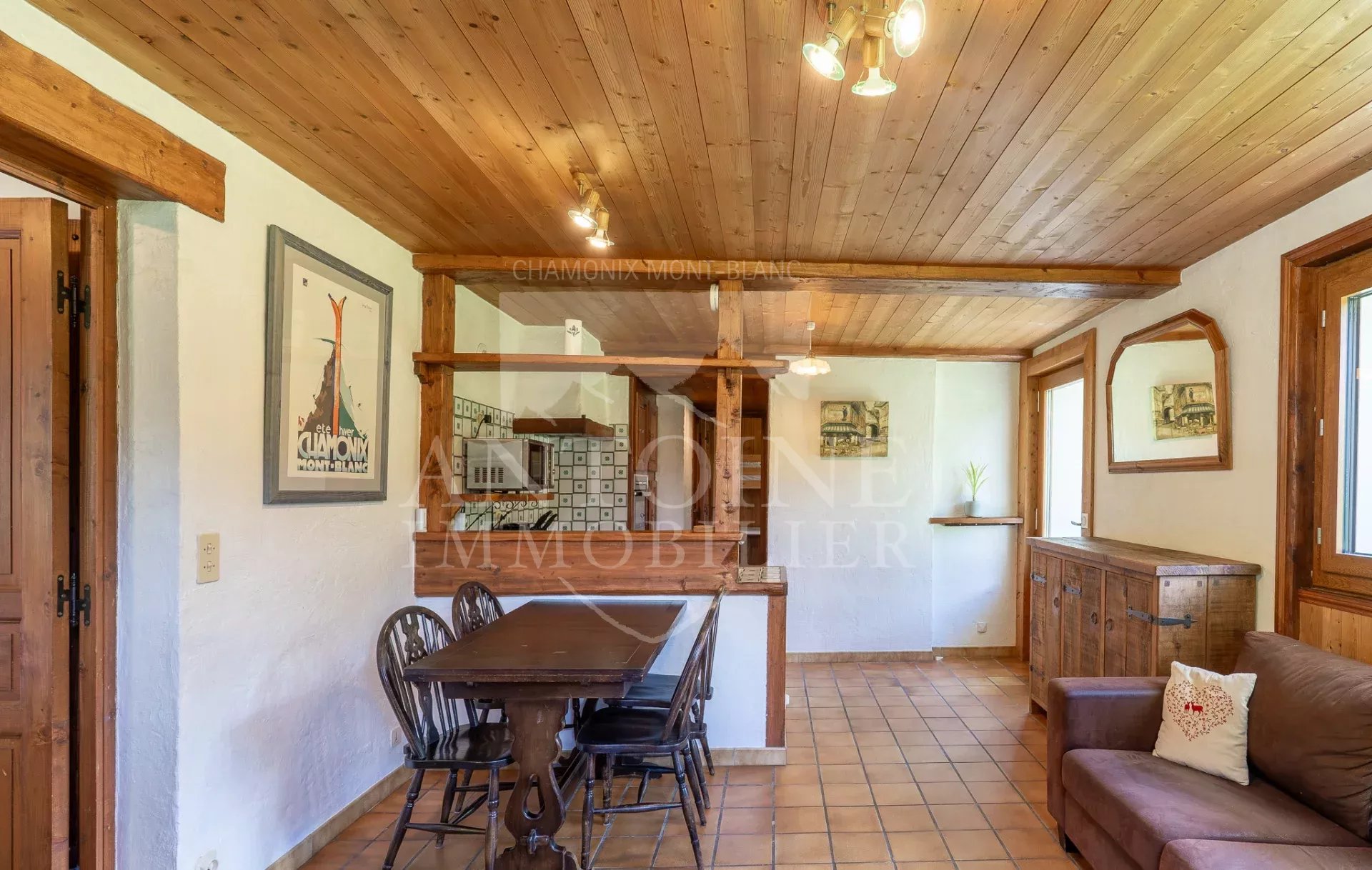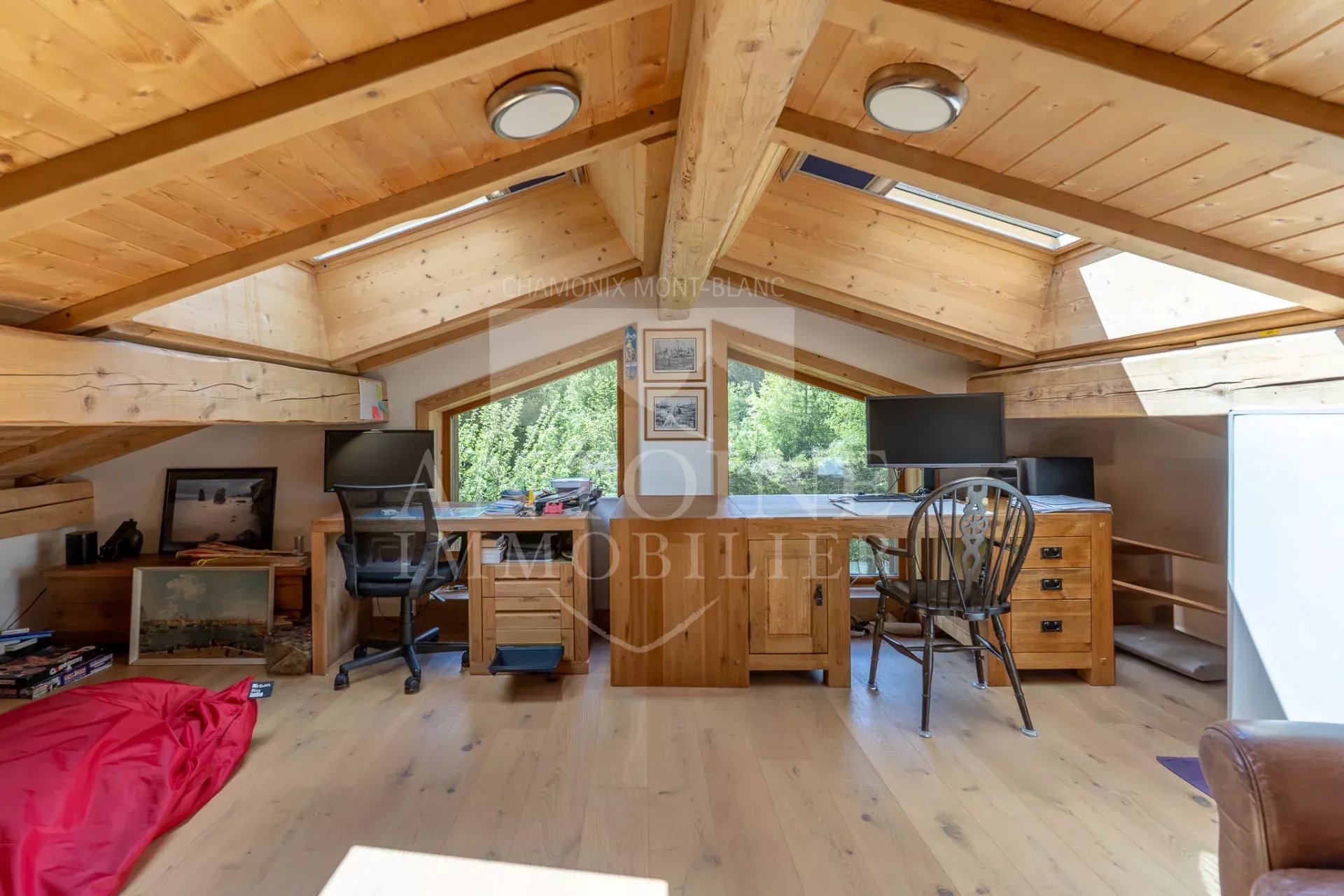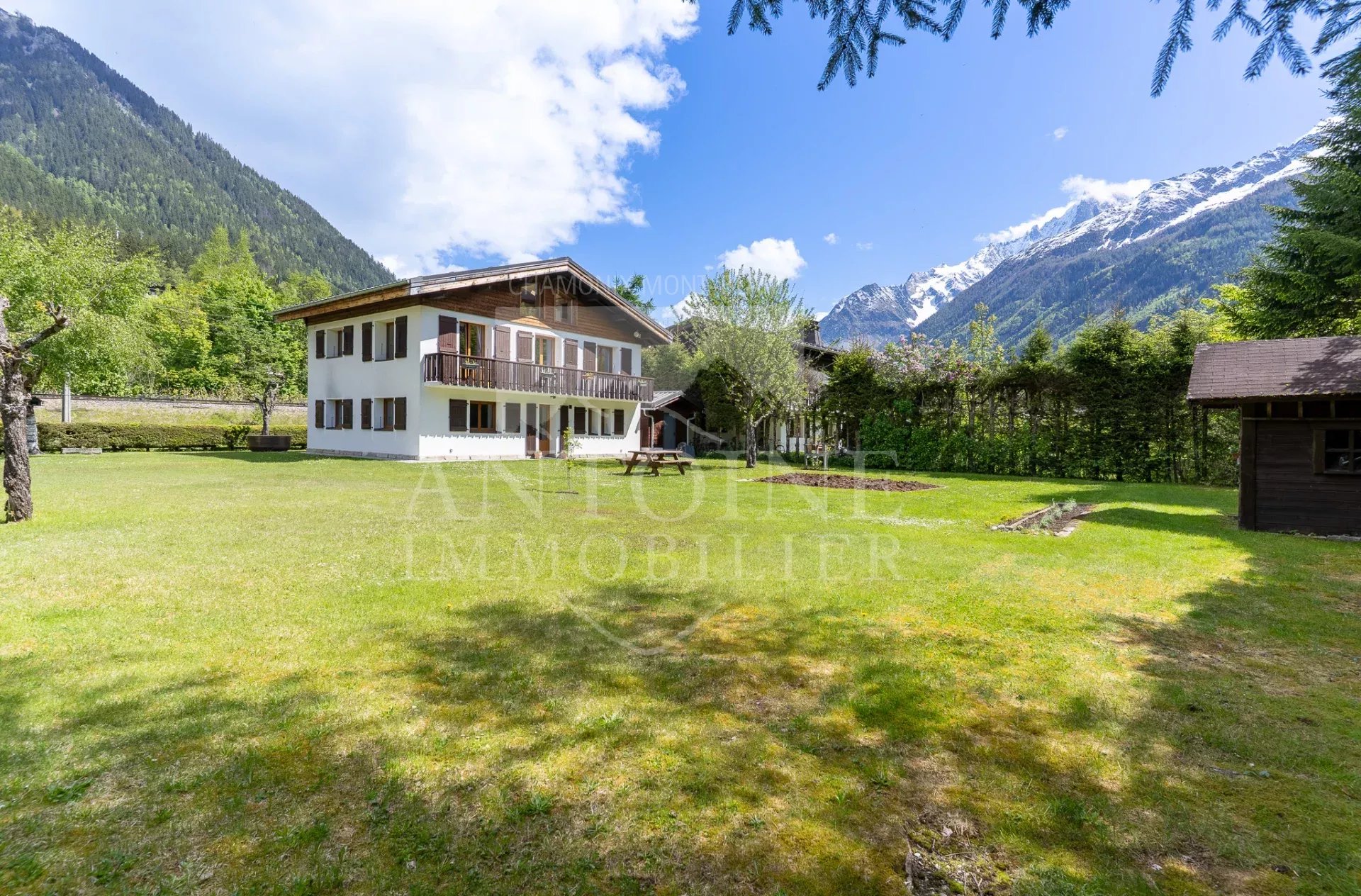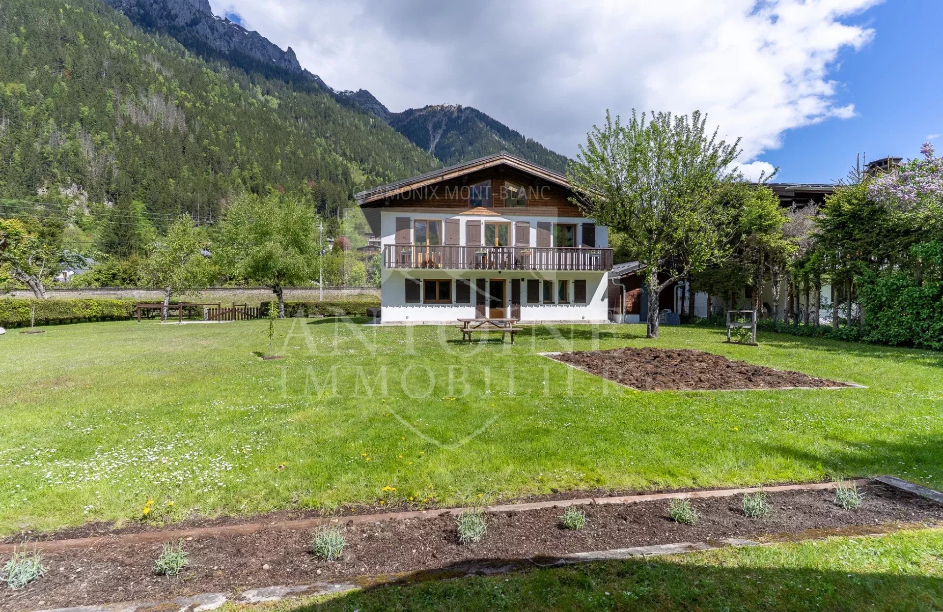 Rare opportunité à Chamonix : nichée dans un environnement calme et verdoyant à seulement un kilomètre de Chamonix, cette belle opportunité édifiée sur un terrain de 1 430 m2 accueille un chalet familial, un garage indépendant et un mazot. Entièrement clôturé, le terrain s'ouvre sur un portail élégant et un parvis en pierres de Luzerne menant au chalet édifié sur trois niveaux et parfaitement entretenu. Le rez de jardin abrite un appartement indépendant avec accès privatif de 40 m2 composé d'une entrée, d'un agréable séjour avec cuisine ouverte, une chambre double, d'un bureau, d'une salle d'eau et de WC. Cet espace de vie ouvre directement sur le jardin. Une salle de sport ainsi qu'une chaufferie/buanderie complètent ce niveau. A l'étage, la résidence principale offre un espace chaleureux et lumineux. On y découvre séjour avec une cuisine américaine moderne et entièrement équipée, trois chambres, une salle de bains, une salle d'eau. Ce niveau dispose d'un grand balcon orienté plein sud, offrant une vue imprenable sur la majestueuse chaine du Mont Blanc. Le dernier niveau sous combles forme un large volume de 48 m2 (surface partiellement en sous-pentes), baigné de lumière grâce à ses ouvertures en façade sud et à ses velux. Cet espace peut être utilisé en bureau, en chambre ou en salle de jeux selon vos besoins. Le chalet présente de très belles prestations : la toiture est neuve, les menuiseries récentes et de qualité, la VMC est à double flux. La surface totale du chalet est de 186 m2 incluant la salle de sports et la buanderie. Un garage récemment construit s'ajoute à cette propriété ainsi qu'un mazot (abri de jardin). Enfin, le jardin plat et arboré et bordé par la rivière L'Arve confère à la propriété une atmosphère bucolique et un charme rare dans ce secteur prisé de Chamonix.