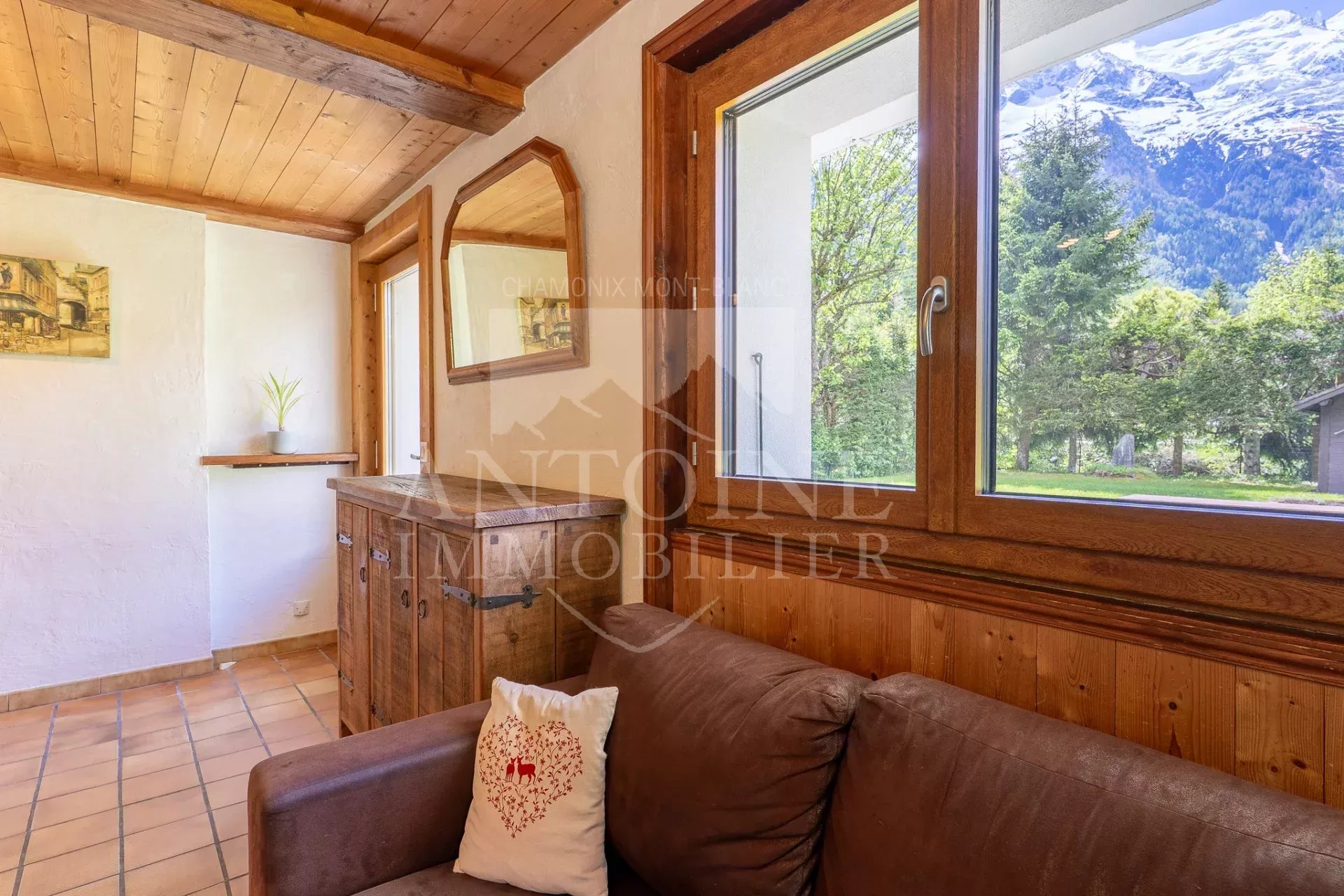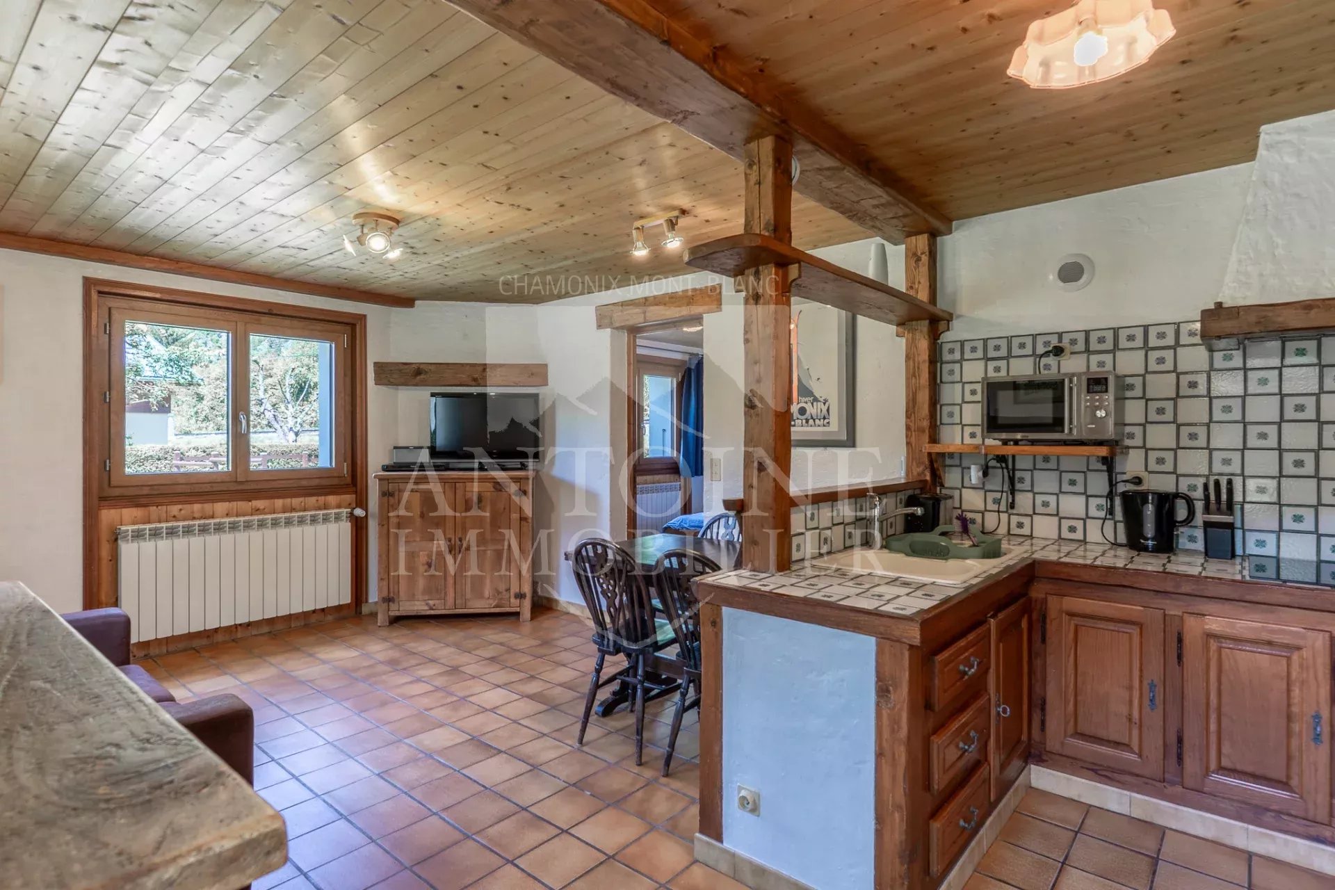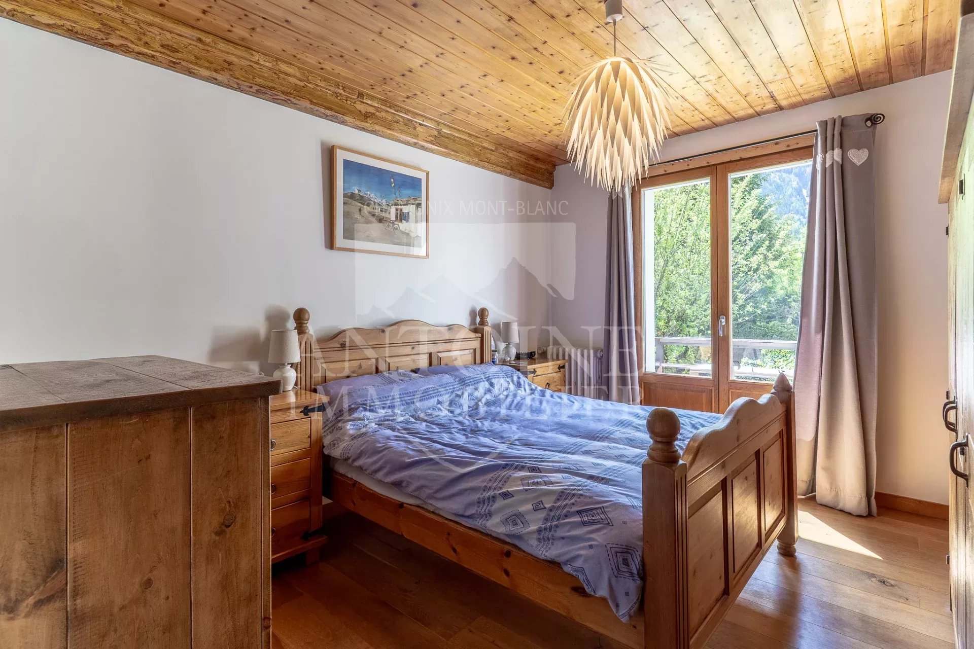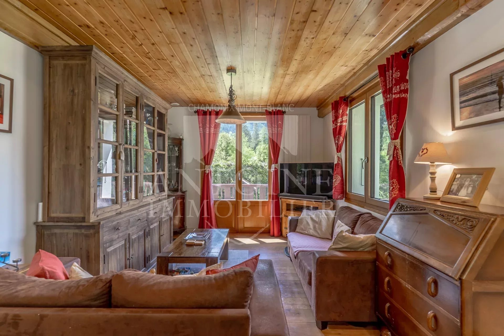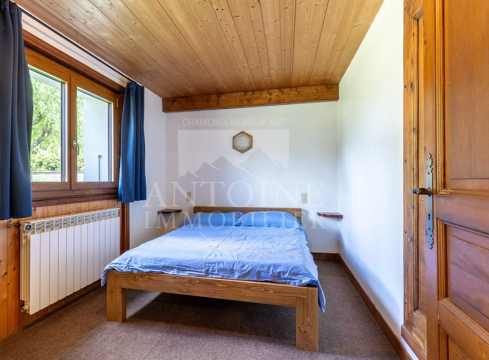 Rare opportunité à Chamonix : nichée dans un environnement calme et verdoyant à seulement un kilomètre de Chamonix, cette belle opportunité édifiée sur un terrain de 1 430 m2 accueille un chalet familial, un garage indépendant et un mazot. Entièrement clôturé, le terrain s'ouvre sur un portail élégant et un parvis en pierres de Luzerne menant au chalet édifié sur trois niveaux et parfaitement entretenu. Le rez de jardin abrite un appartement indépendant avec accès privatif de 40 m2 composé d'une entrée, d'un agréable séjour avec cuisine ouverte, une chambre double, d'un bureau, d'une salle d'eau et de WC. Cet espace de vie ouvre directement sur le jardin. Une salle de sport ainsi qu'une chaufferie/buanderie complètent ce niveau. A l'étage, la résidence principale offre un espace chaleureux et lumineux. On y découvre séjour avec une cuisine américaine moderne et entièrement équipée, trois chambres, une salle de bains, une salle d'eau. Ce niveau dispose d'un grand balcon orienté plein sud, offrant une vue imprenable sur la majestueuse chaine du Mont Blanc. Le dernier niveau sous combles forme un large volume de 48 m2 (surface partiellement en sous-pentes), baigné de lumière grâce à ses ouvertures en façade sud et à ses velux. Cet espace peut être utilisé en bureau, en chambre ou en salle de jeux selon vos besoins. Le chalet présente de très belles prestations : la toiture est neuve, les menuiseries récentes et de qualité, la VMC est à double flux. La surface totale du chalet est de 186 m2 incluant la salle de sports et la buanderie. Un garage récemment construit s'ajoute à cette propriété ainsi qu'un mazot (abri de jardin). Enfin, le jardin plat et arboré et bordé par la rivière L'Arve confère à la propriété une atmosphère bucolique et un charme rare dans ce secteur prisé de Chamonix.