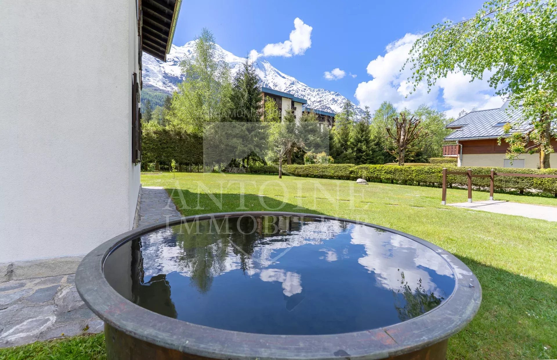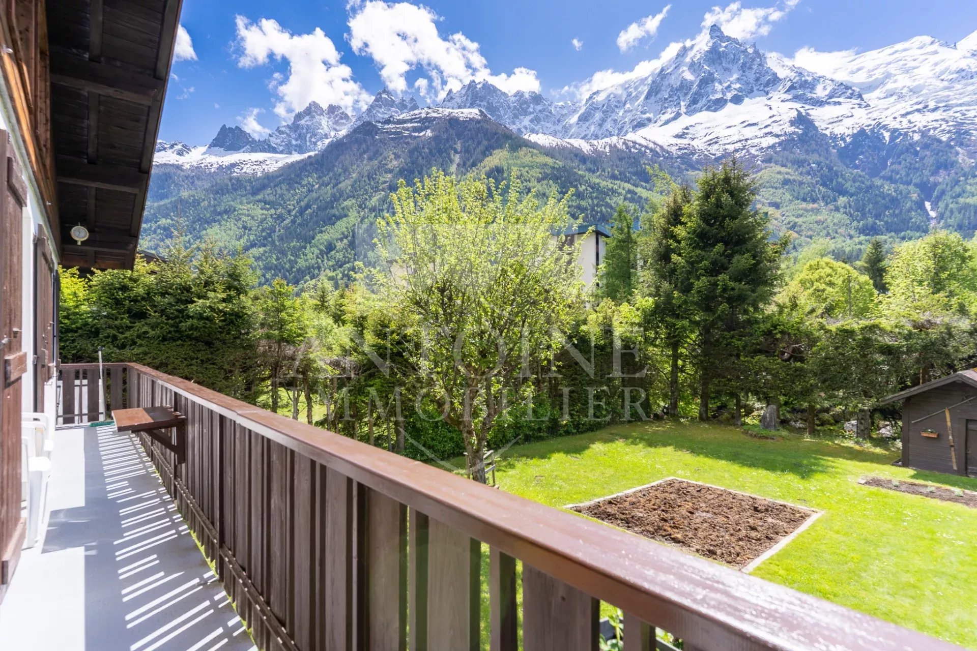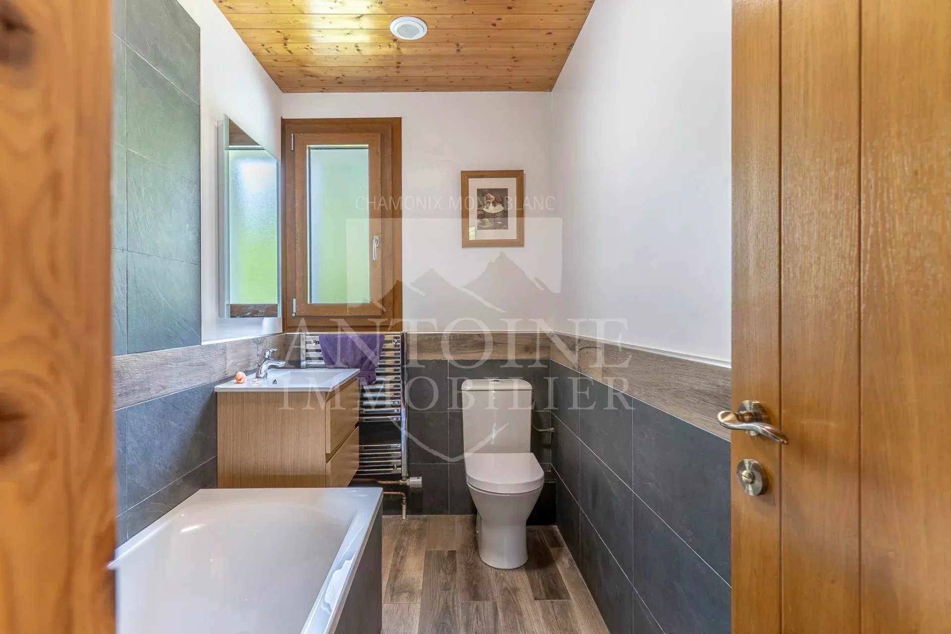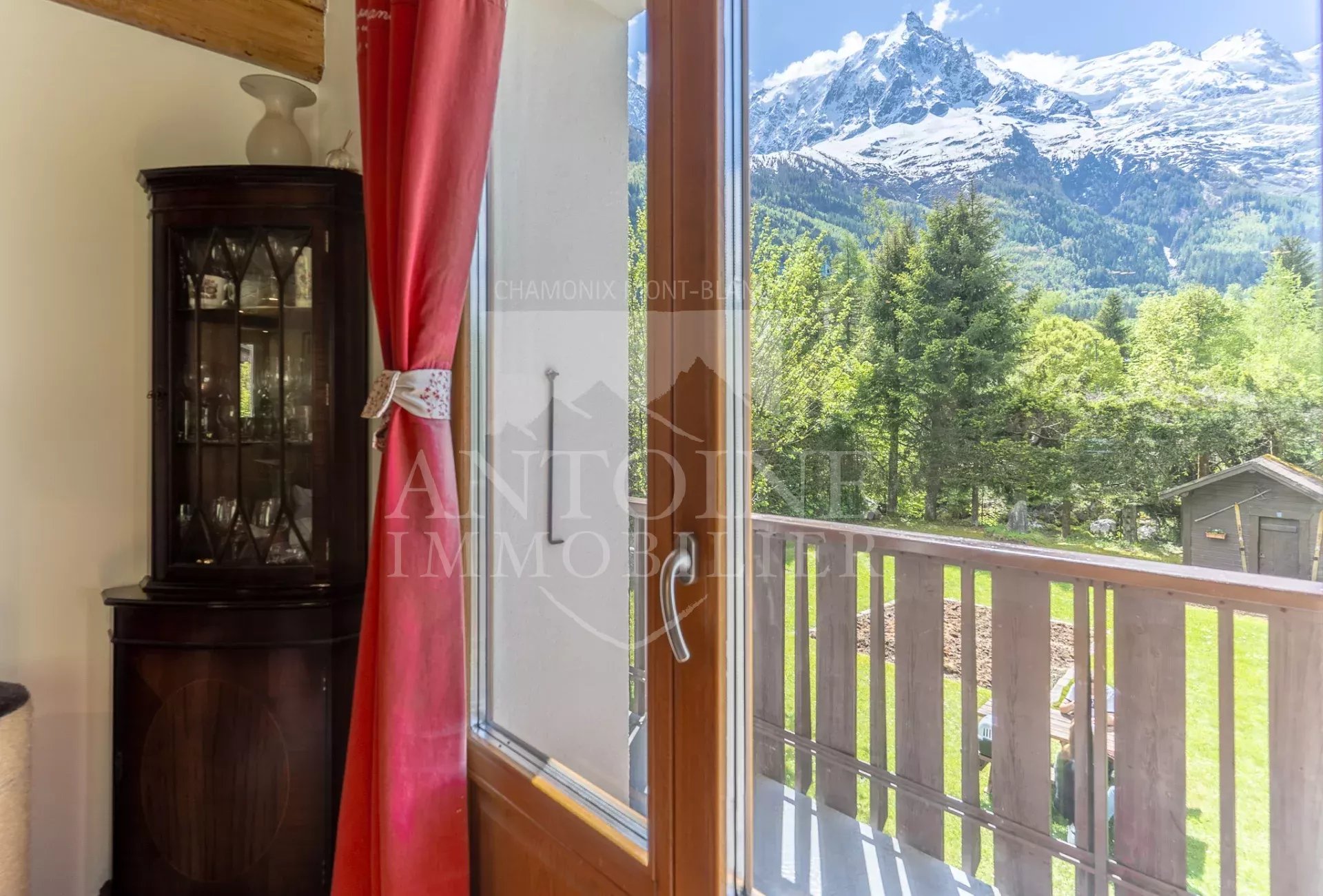 Rare opportunité à Chamonix : nichée dans un environnement calme et verdoyant à seulement un kilomètre de Chamonix, cette belle opportunité édifiée sur un terrain de 1 430 m2 accueille un chalet familial, un garage indépendant et un mazot. Entièrement clôturé, le terrain s'ouvre sur un portail élégant et un parvis en pierres de Luzerne menant au chalet édifié sur trois niveaux et parfaitement entretenu. Le rez de jardin abrite un appartement indépendant avec accès privatif de 40 m2 composé d'une entrée, d'un agréable séjour avec cuisine ouverte, une chambre double, d'un bureau, d'une salle d'eau et de WC. Cet espace de vie ouvre directement sur le jardin. Une salle de sport ainsi qu'une chaufferie/buanderie complètent ce niveau. A l'étage, la résidence principale offre un espace chaleureux et lumineux. On y découvre séjour avec une cuisine américaine moderne et entièrement équipée, trois chambres, une salle de bains, une salle d'eau. Ce niveau dispose d'un grand balcon orienté plein sud, offrant une vue imprenable sur la majestueuse chaine du Mont Blanc. Le dernier niveau sous combles forme un large volume de 48 m2 (surface partiellement en sous-pentes), baigné de lumière grâce à ses ouvertures en façade sud et à ses velux. Cet espace peut être utilisé en bureau, en chambre ou en salle de jeux selon vos besoins. Le chalet présente de très belles prestations : la toiture est neuve, les menuiseries récentes et de qualité, la VMC est à double flux. La surface totale du chalet est de 186 m2 incluant la salle de sports et la buanderie. Un garage récemment construit s'ajoute à cette propriété ainsi qu'un mazot (abri de jardin). Enfin, le jardin plat et arboré et bordé par la rivière L'Arve confère à la propriété une atmosphère bucolique et un charme rare dans ce secteur prisé de Chamonix.