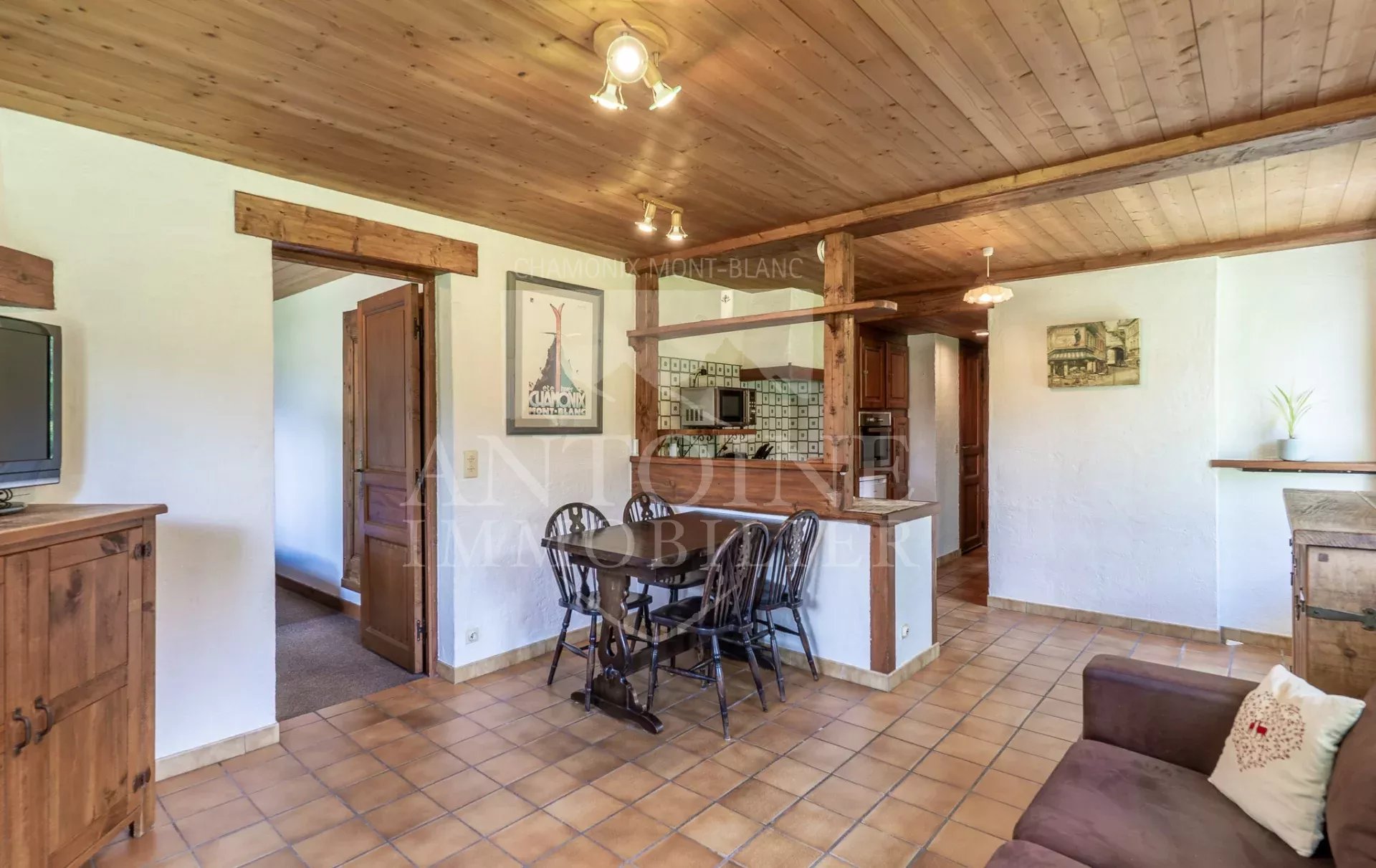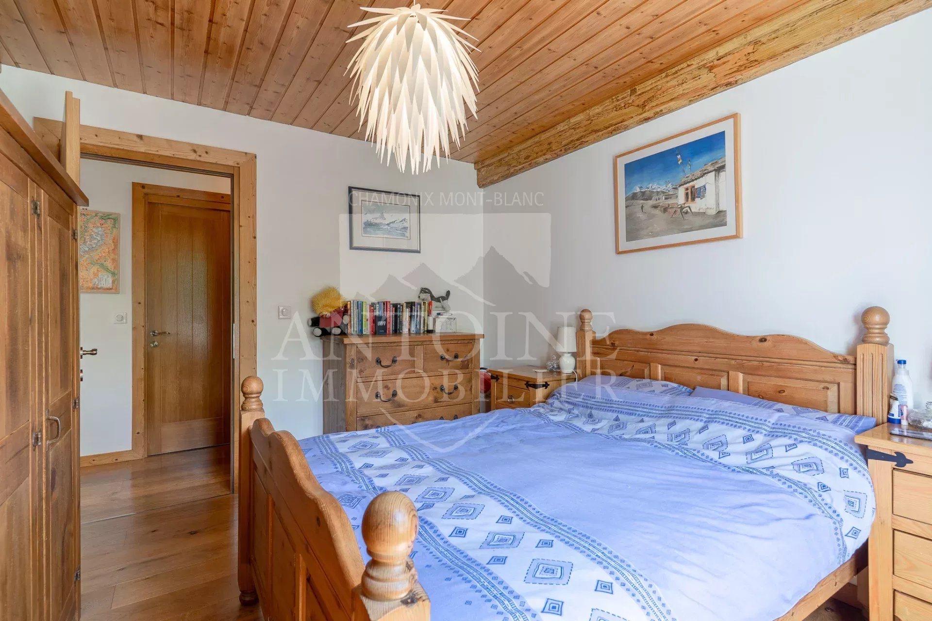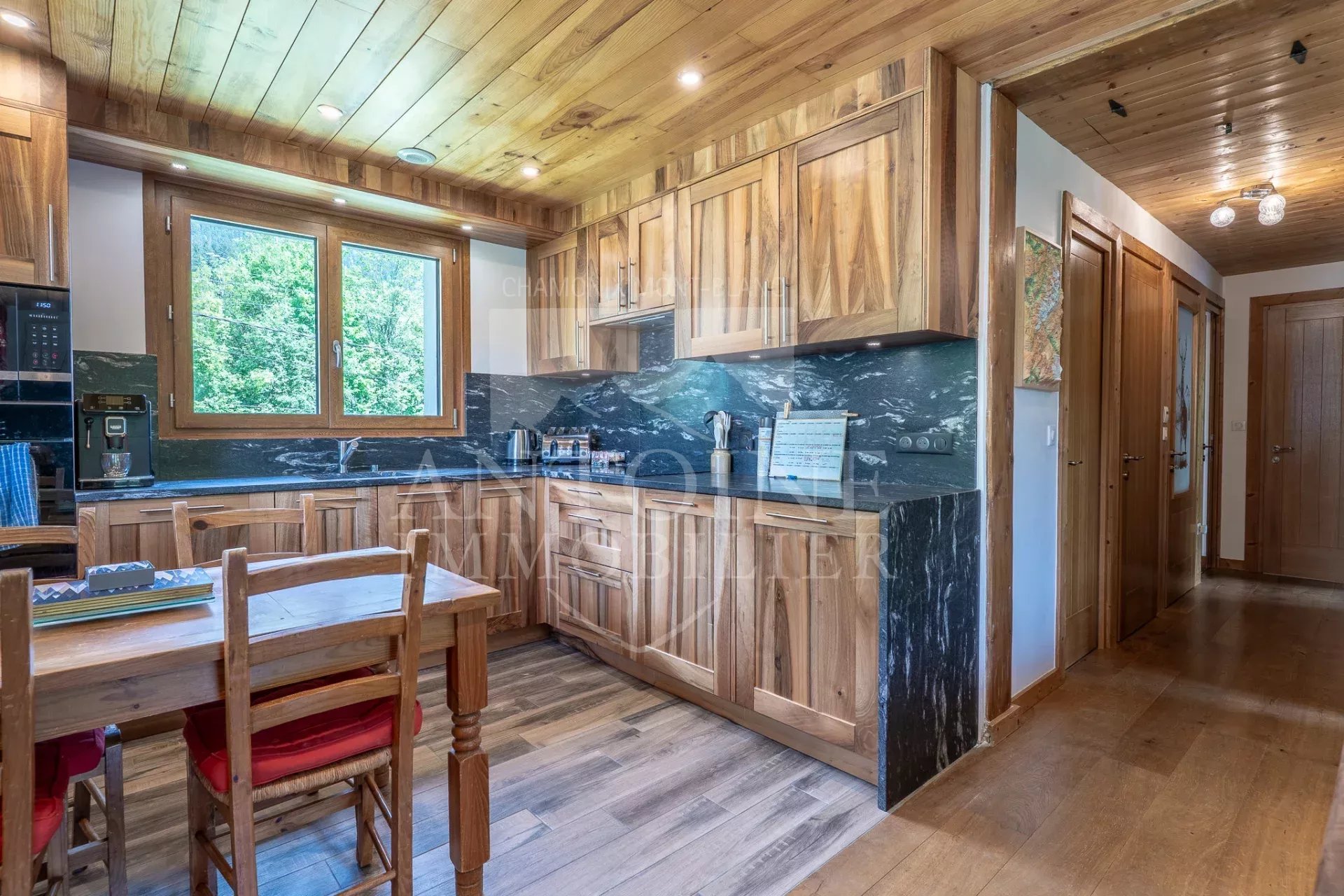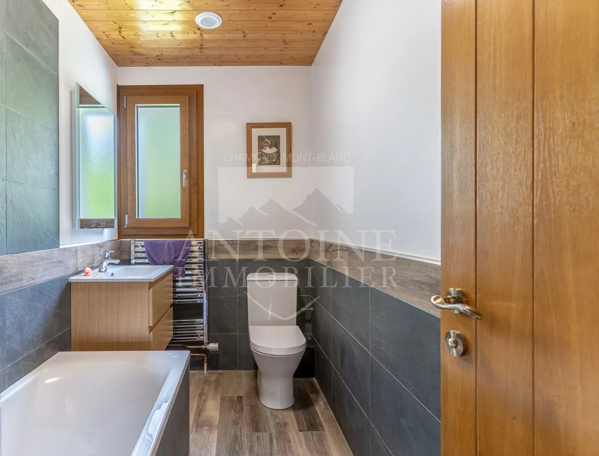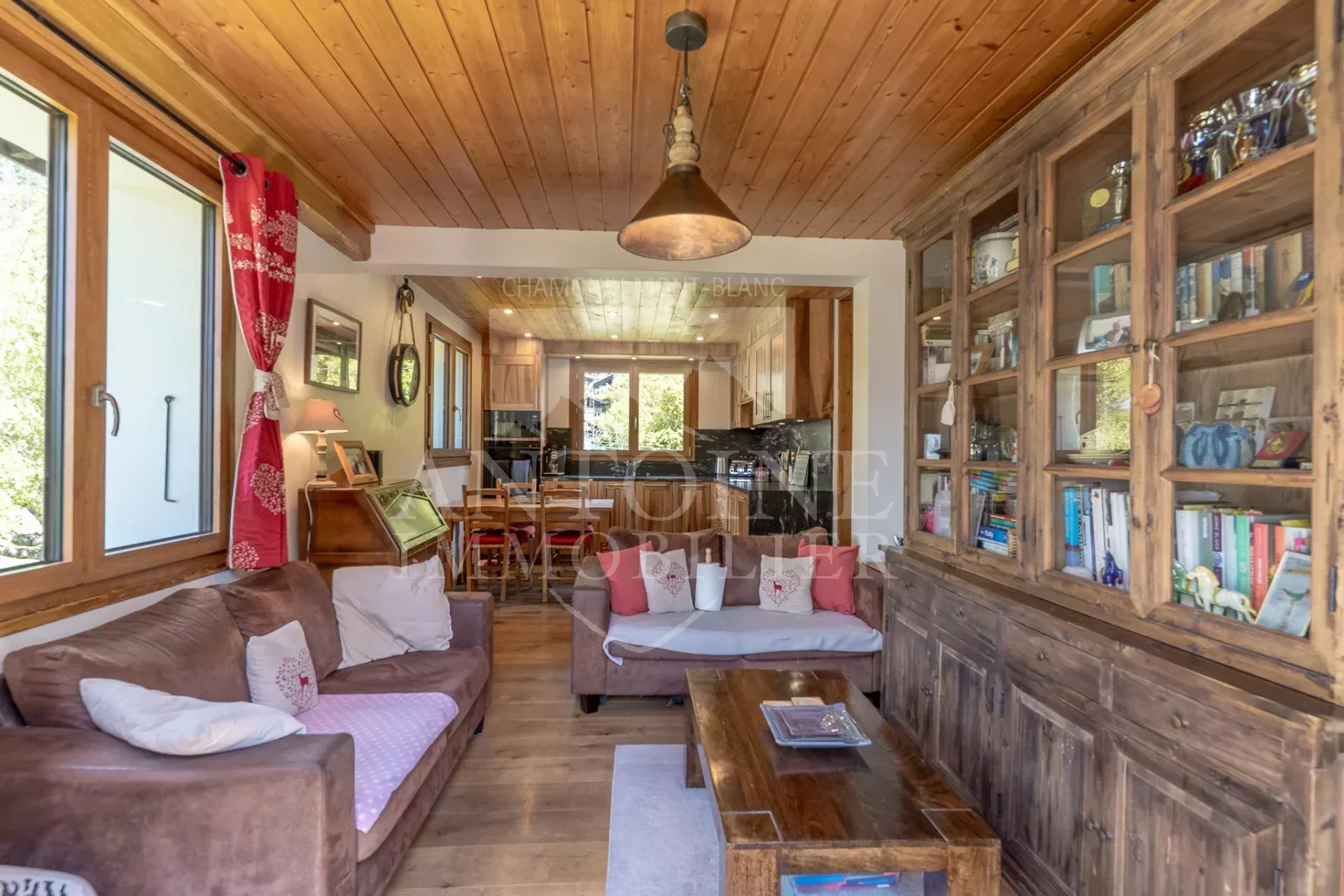 Rare opportunité à Chamonix : nichée dans un environnement calme et verdoyant à seulement un kilomètre de Chamonix, cette belle opportunité édifiée sur un terrain de 1 430 m2 accueille un chalet familial, un garage indépendant et un mazot. Entièrement clôturé, le terrain s'ouvre sur un portail élégant et un parvis en pierres de Luzerne menant au chalet édifié sur trois niveaux et parfaitement entretenu. Le rez de jardin abrite un appartement indépendant avec accès privatif de 40 m2 composé d'une entrée, d'un agréable séjour avec cuisine ouverte, une chambre double, d'un bureau, d'une salle d'eau et de WC. Cet espace de vie ouvre directement sur le jardin. Une salle de sport ainsi qu'une chaufferie/buanderie complètent ce niveau. A l'étage, la résidence principale offre un espace chaleureux et lumineux. On y découvre séjour avec une cuisine américaine moderne et entièrement équipée, trois chambres, une salle de bains, une salle d'eau. Ce niveau dispose d'un grand balcon orienté plein sud, offrant une vue imprenable sur la majestueuse chaine du Mont Blanc. Le dernier niveau sous combles forme un large volume de 48 m2 (surface partiellement en sous-pentes), baigné de lumière grâce à ses ouvertures en façade sud et à ses velux. Cet espace peut être utilisé en bureau, en chambre ou en salle de jeux selon vos besoins. Le chalet présente de très belles prestations : la toiture est neuve, les menuiseries récentes et de qualité, la VMC est à double flux. La surface totale du chalet est de 186 m2 incluant la salle de sports et la buanderie. Un garage récemment construit s'ajoute à cette propriété ainsi qu'un mazot (abri de jardin). Enfin, le jardin plat et arboré et bordé par la rivière L'Arve confère à la propriété une atmosphère bucolique et un charme rare dans ce secteur prisé de Chamonix.