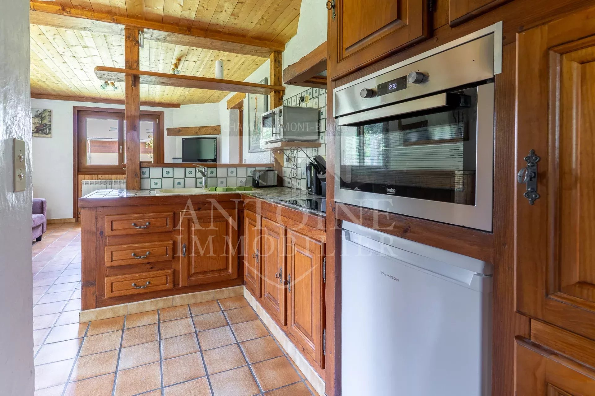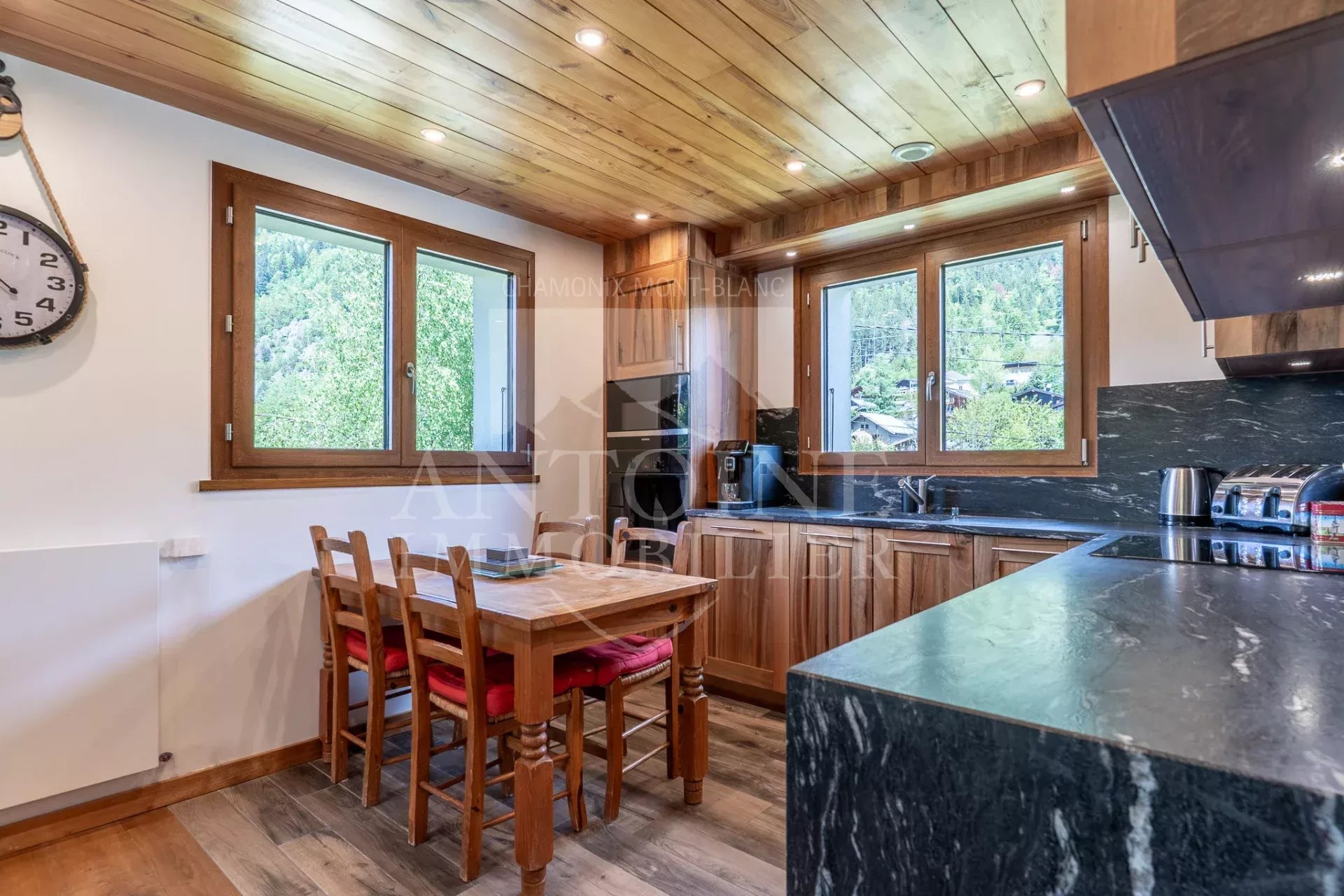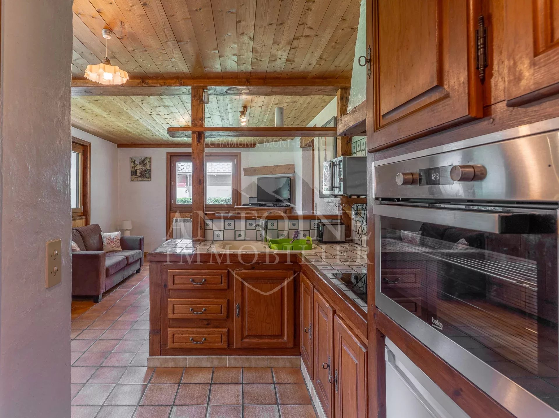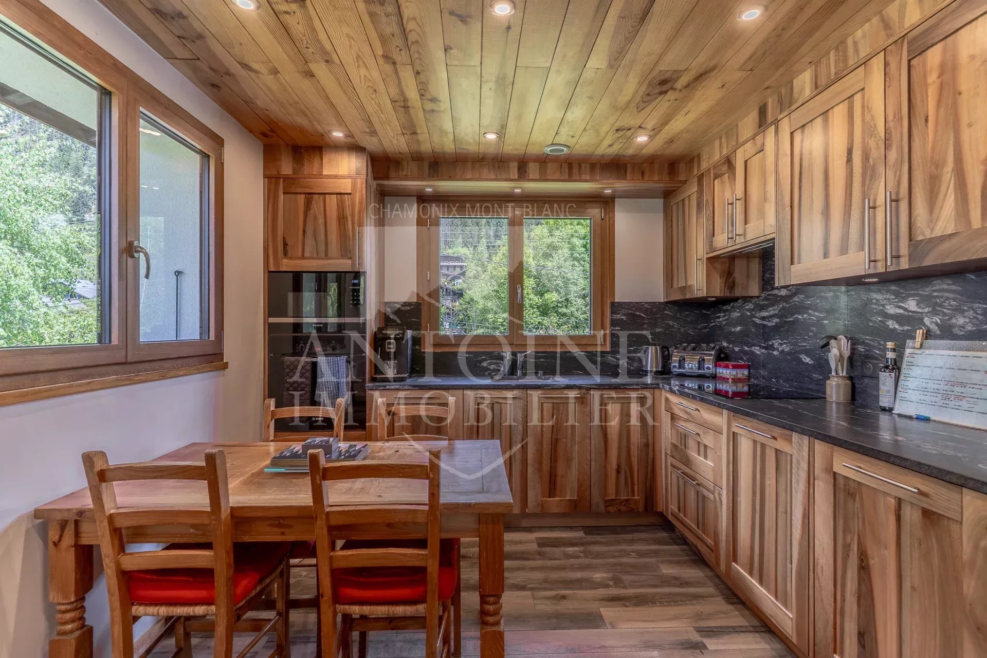 Rare opportunité à Chamonix : nichée dans un environnement calme et verdoyant à seulement un kilomètre de Chamonix, cette belle opportunité édifiée sur un terrain de 1 430 m2 accueille un chalet familial, un garage indépendant et un mazot. Entièrement clôturé, le terrain s'ouvre sur un portail élégant et un parvis en pierres de Luzerne menant au chalet édifié sur trois niveaux et parfaitement entretenu. Le rez de jardin abrite un appartement indépendant avec accès privatif de 40 m2 composé d'une entrée, d'un agréable séjour avec cuisine ouverte, une chambre double, d'un bureau, d'une salle d'eau et de WC. Cet espace de vie ouvre directement sur le jardin. Une salle de sport ainsi qu'une chaufferie/buanderie complètent ce niveau. A l'étage, la résidence principale offre un espace chaleureux et lumineux. On y découvre séjour avec une cuisine américaine moderne et entièrement équipée, trois chambres, une salle de bains, une salle d'eau. Ce niveau dispose d'un grand balcon orienté plein sud, offrant une vue imprenable sur la majestueuse chaine du Mont Blanc. Le dernier niveau sous combles forme un large volume de 48 m2 (surface partiellement en sous-pentes), baigné de lumière grâce à ses ouvertures en façade sud et à ses velux. Cet espace peut être utilisé en bureau, en chambre ou en salle de jeux selon vos besoins. Le chalet présente de très belles prestations : la toiture est neuve, les menuiseries récentes et de qualité, la VMC est à double flux. La surface totale du chalet est de 186 m2 incluant la salle de sports et la buanderie. Un garage récemment construit s'ajoute à cette propriété ainsi qu'un mazot (abri de jardin). Enfin, le jardin plat et arboré et bordé par la rivière L'Arve confère à la propriété une atmosphère bucolique et un charme rare dans ce secteur prisé de Chamonix.