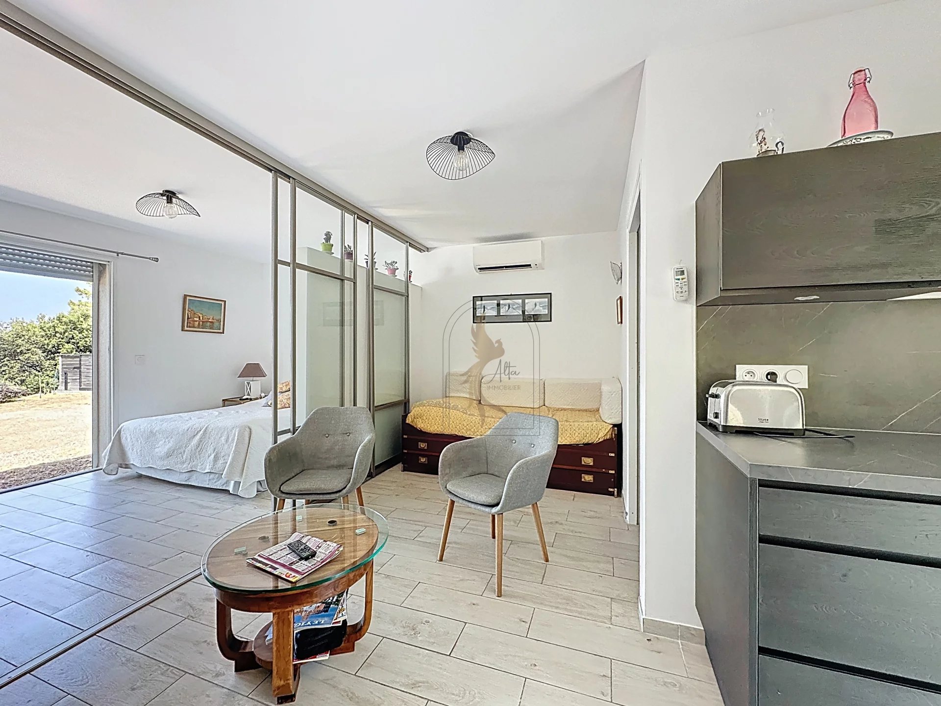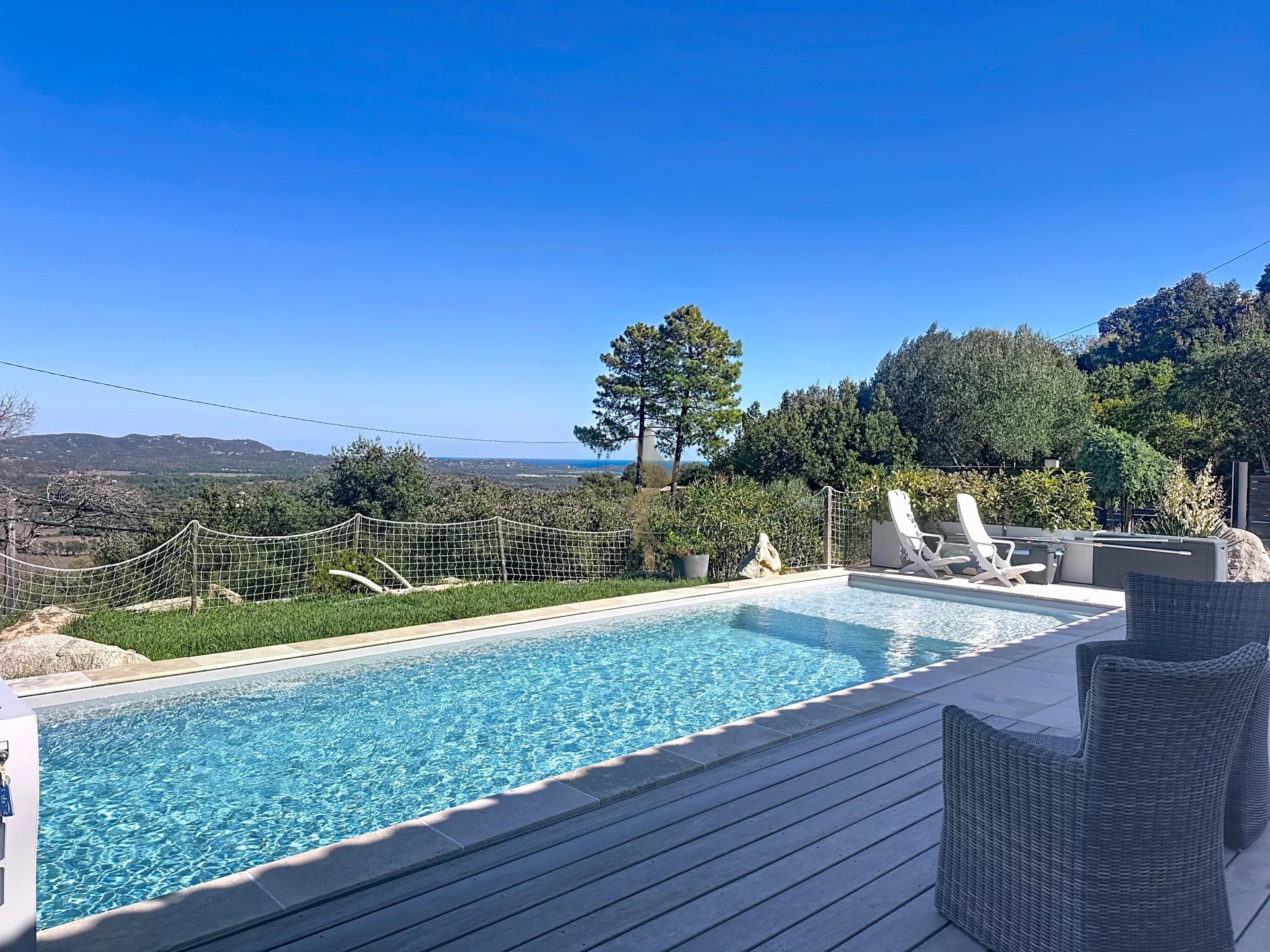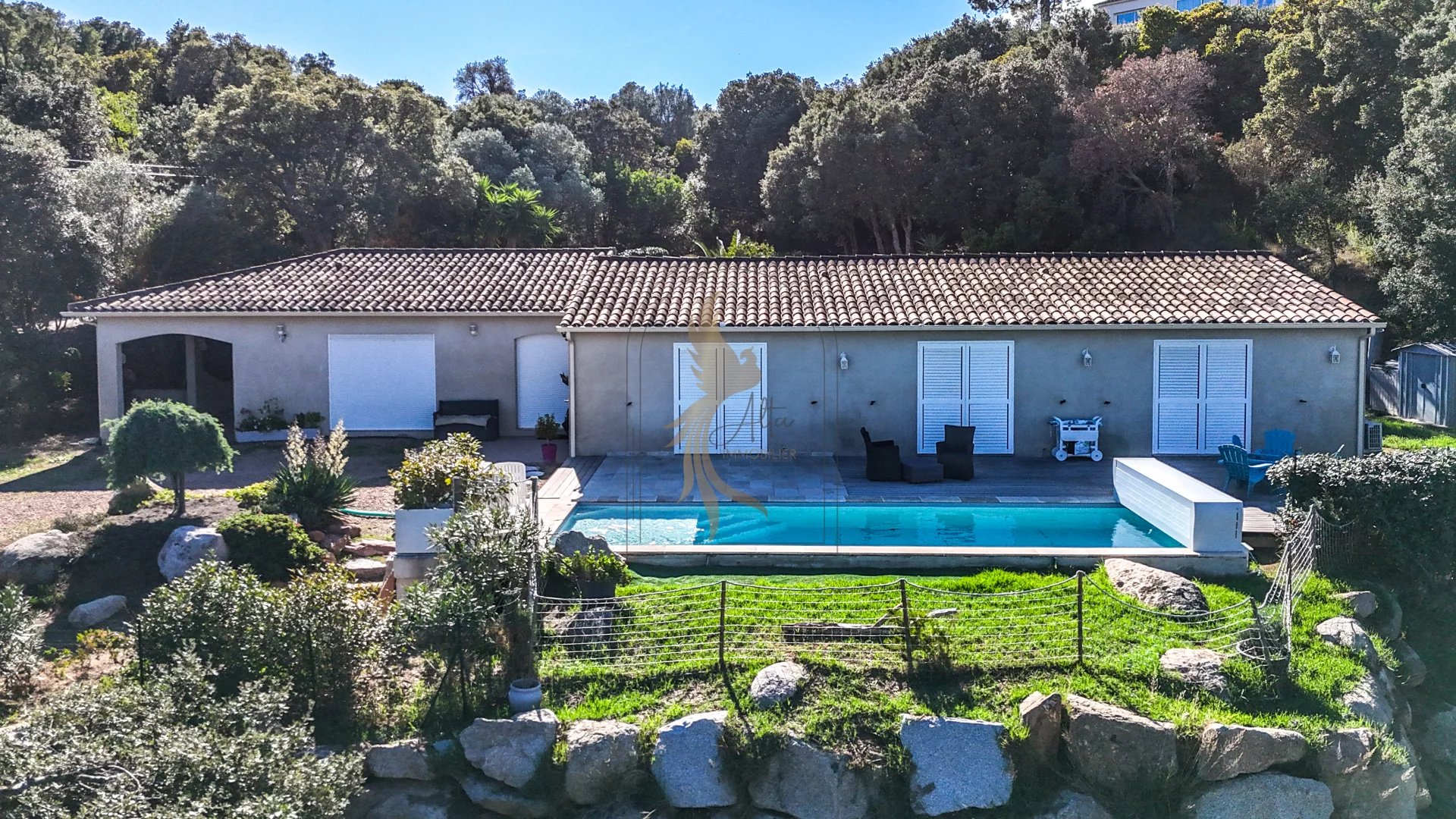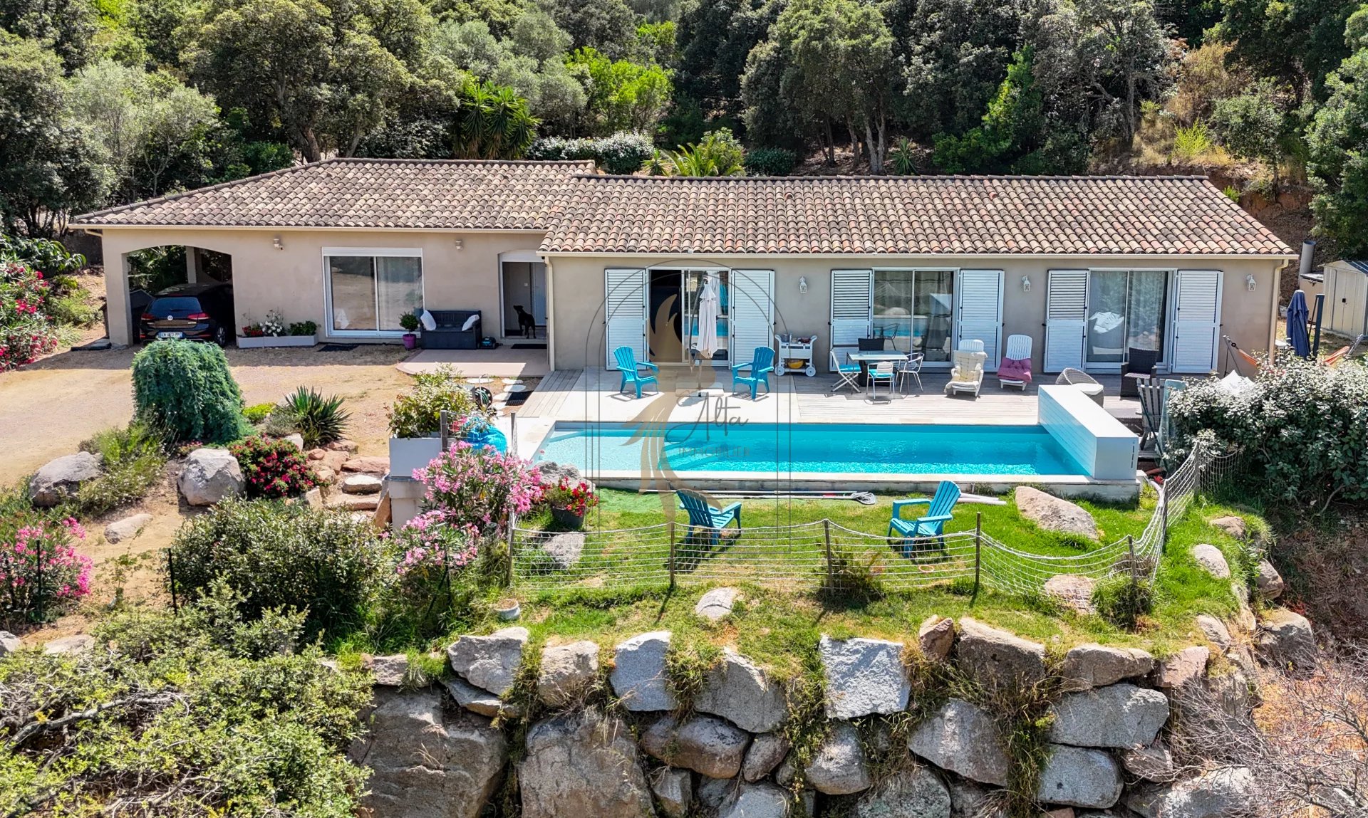 Nichée sur les hauteurs de Porto Vecchio, cette charmante villa d’environ 160 m² offre un cadre de vie paisible, tout en restant à proximité immédiate des commerces, des écoles et des principaux axes de circulation. Implantée sur un beau terrain de 1 796 m², elle séduit par sa vue panoramique sur les montagnes corses et son aperçu mer à l’horizon. L’espace extérieur est agrémenté d’une piscine au sel de 9 x 3 m, idéale pour se détendre. La propriété se compose aujourd’hui de deux espaces de vie distincts, reliés par un sas intérieur, pouvant facilement être réunis pour créer une seule et grande habitation selon les besoins. La partie principale, d’environ 107 m², dispose d’un vaste séjour lumineux avec salon et cuisine ouverte entièrement équipée, de trois belles chambres, d’une salle de bain et d’une salle d’eau. La seconde partie, entièrement rénovée, est un grand T1 bis de 45 m² comprenant un séjour avec cuisine ouverte, un cellier et un espace nuit en mezzanine, parfait pour accueillir famille, amis ou générer un revenu locatif complémentaire. Une annexe indépendante d’environ 16 m² vient compléter ce bien, offrant une pièce supplémentaire pour un atelier, un bureau ou un espace de stockage. Un bien rare sur le secteur, alliant confort, potentiel et emplacement stratégique, idéal pour une grande famille, un projet de location saisonnière ou une résidence principale avec logement indépendant.