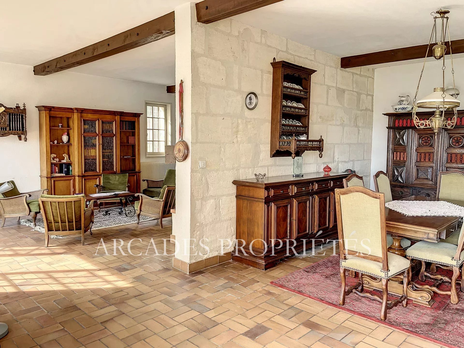 GRANDE MAISON en PIERRE sur une propriété d'un hectare dans un magnifique environnement sur la commune de Pompignac avec une vue dégagée sur les coteaux du village et au milieu des vignes. Maison principale en pierre de 264 m² sur deux niveaux avec des garages de 71 m². Vous trouverez au rez-de-chaussée une entrée - salle de billard de 32 m², un salon de 39 m² avec une grande cheminée, une salle à manger de 31 m², un bureau, une cuisine avec un cellier-buanderie de 18 m², un toilette invité et une salle d'eau. Puis à l'étage, trois chambres dont une parentale avec sa salle d'eau et son salon, une salle de bain et des toilettes. Accolé à cette maison principale, un logement T3 indépendant de 63 m² avec un espace de vie de 20 m², deux chambres, une salle de bain et toilettes. De nombreuses dépendances, granges et abris complètent ce bien sur une surface de 200 m² environ. Possibilité de créer des gites. Cette propriété est située au milieu des vergers, vignes et prés. Bien rare sur le secteur. ARCADE PROPRIETES.