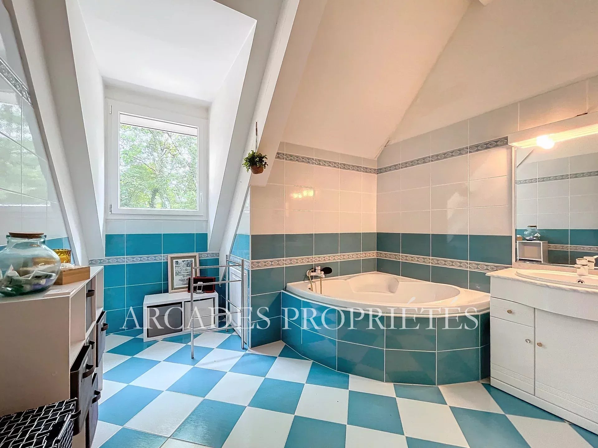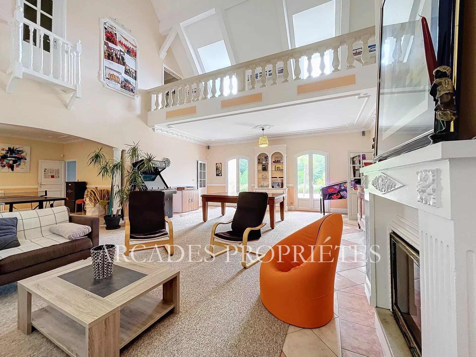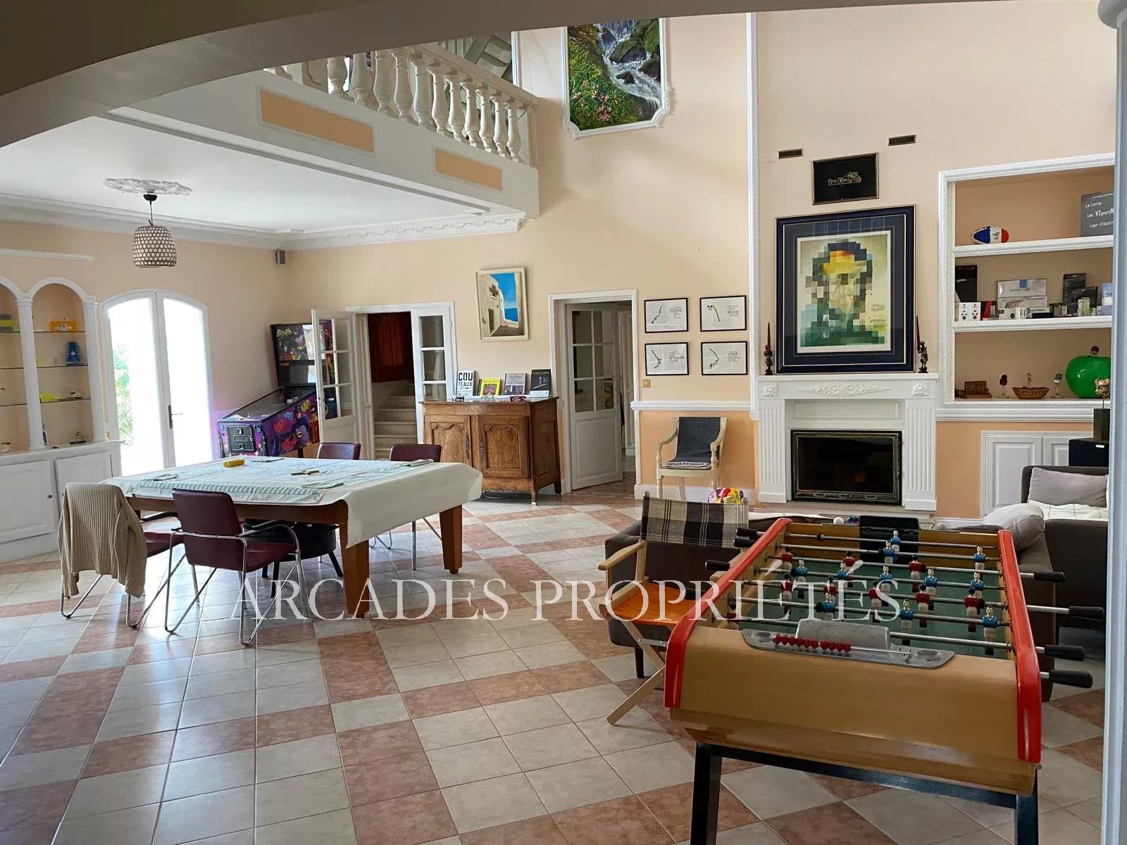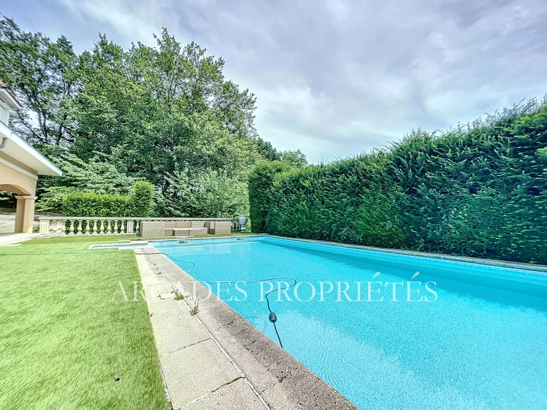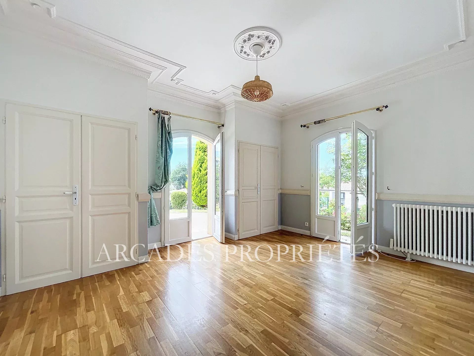TRES GRANDE MAISON FAMILIALE sur un terrain paysagé et arboré de près de 5000 m². Au rez de chaussée, plusieurs espaces de vie et de détente, salons, salle à manger avec cheminée, vestibule, cuisine et arrière cuisine aménagées et équipées, puis un espace nuit avec deux chambres, salle de bains. Au premier étage, quatre chambres avec des points d'eau pour certaines, deux salle de bains, un espace détente, une belle mezzanine. Puis au 2ème étage, un agréable bureau pouvant être aménagé en salle de sport ou bibliothèque. Un sous sol sur l'intégralité de la maison, aménagé avec isolation et climatisation, où peuvent être garer de nombreux véhicules mais aussi aménageable pour une activité professionnelle, un local piscine, une cave. A l'extérieur, carport pour 4 véhicules, piscine de 50 m², terrain de pétanque sur un magnifique terrain, secteur très calme. Cette belle propriété est proche de toutes commodités et se situe à 20/25 minutes de Bordeaux et de Libourne secteur Pompignac. AGENCE DES ARCADES.