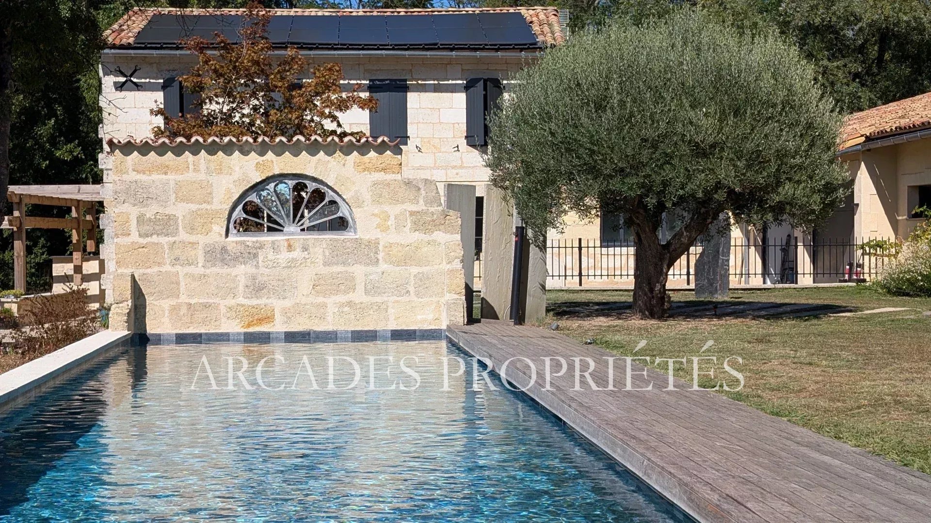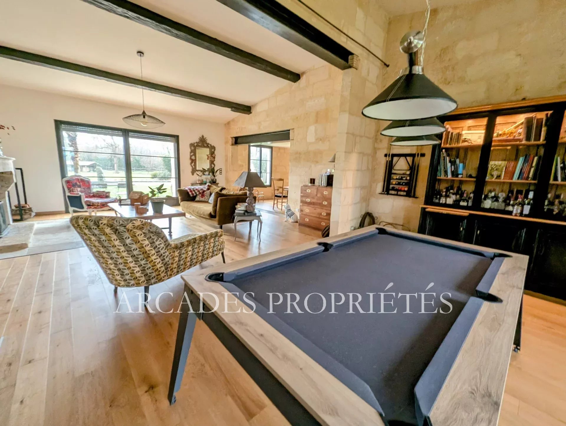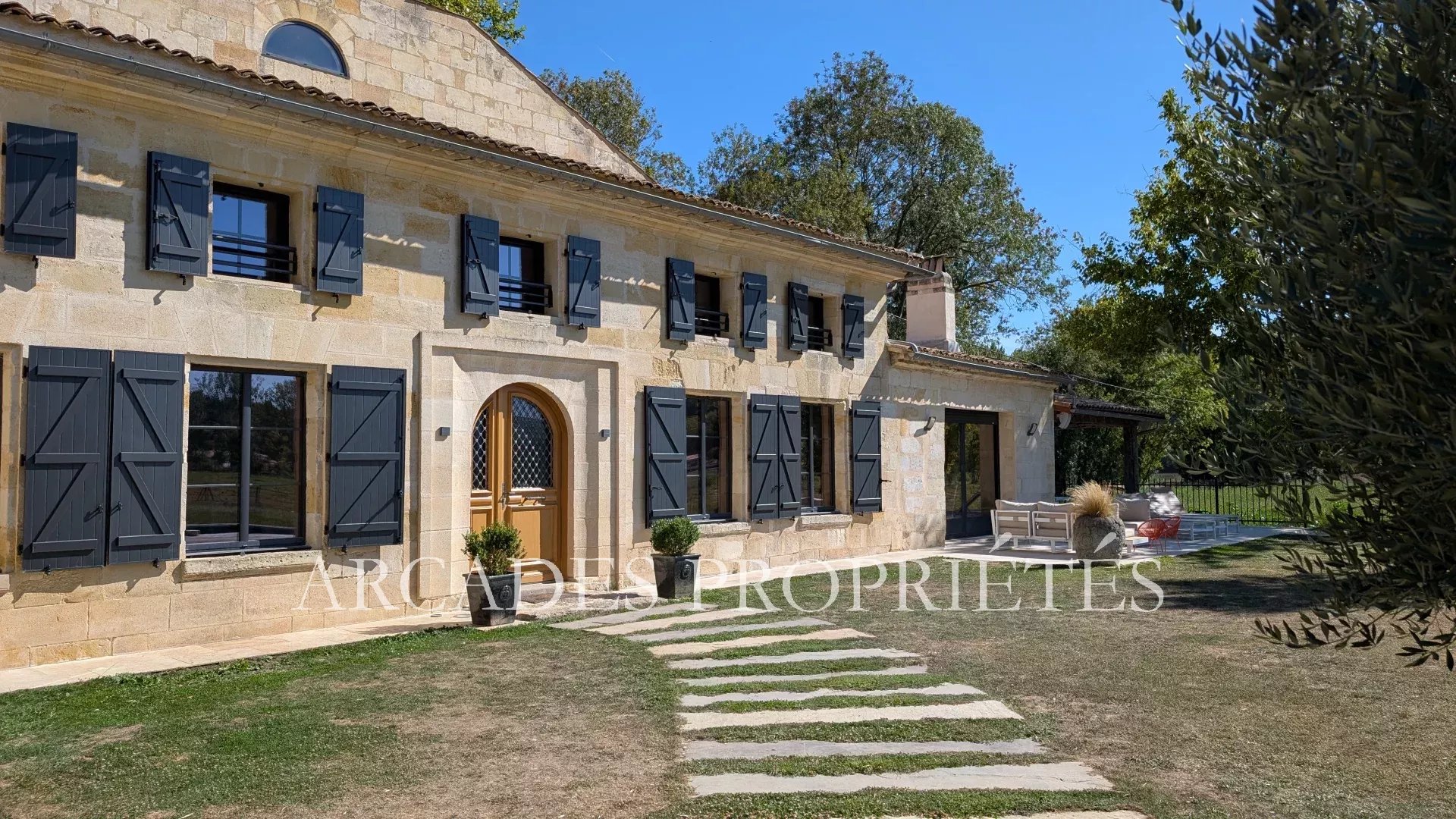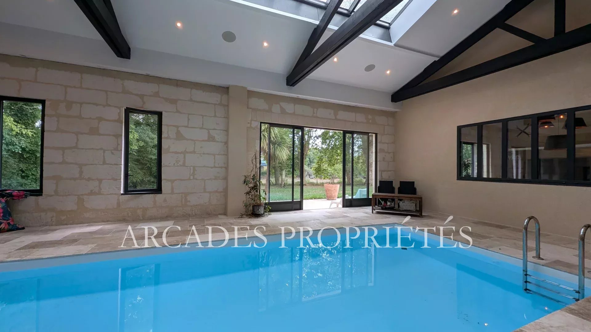 PROPRIETE D'EXCEPTION en Gironde située à 30min de Bordeaux, sur la commune de Fronsac, aux portes de Libourne. LA PROPRIETE comprend une demeure de en pierre, Maison de Maitre du 19eme siècle, entièrement restaurée avec gout et emploi de matériaux nobles ,des dépendances, un vaste garage et une seconde maison d'habitation pouvant faire office de gîte. Ce très bel ensemble immobilier implanté sur une parcelle de plus de 7ha. La Maison de Maitre aux volumes très généreux ( près de 500m² hab) et bénéficiant d'une grande luminosité comprend une très belle entrée décloisonnée distribuant d'une part un espace séjour, salon de 90m², une cuisine spacieuse et très bien équipée, un second salon de 50m², 4 chambres avec leurs salles d'eau privatives, une suite parentale de 60m² avec salle de bains et dressing, salle de cinéma, salle de jeux, espace de détente avec piscine intérieure, salle de sport et garage de de plus de 100m². Le gîte de 95m² comprend un séjour-salon, un bureau , 2 chambres avec 2 salles d'eau privative. L'entrée à la propriété se fait par un beau portail avec grille en fer forgé et débouche sur un parc paysagé et arboré avec piscine extérieure de 16x4m , parking couvert automobiles et terrasse couverte. Agence ARCADES PROPRIETES