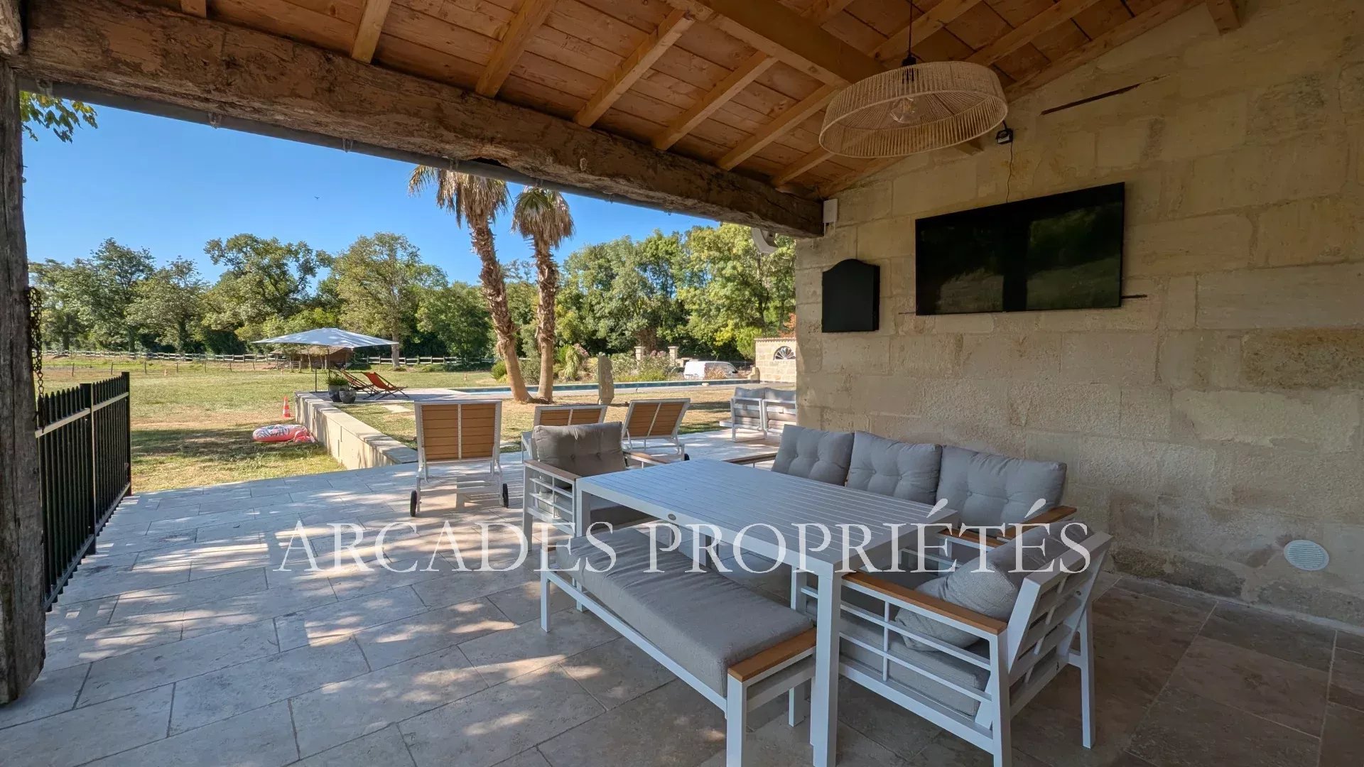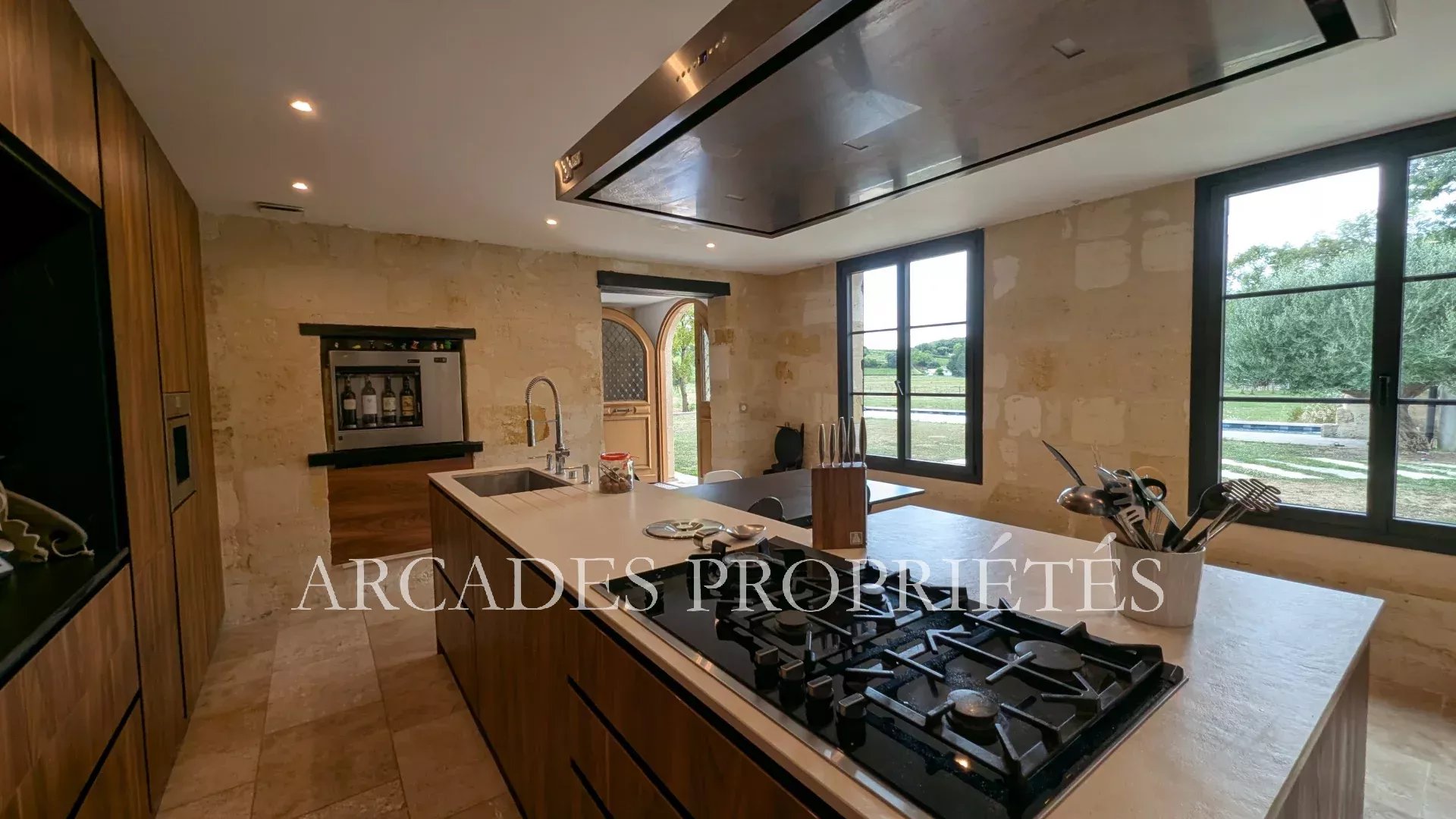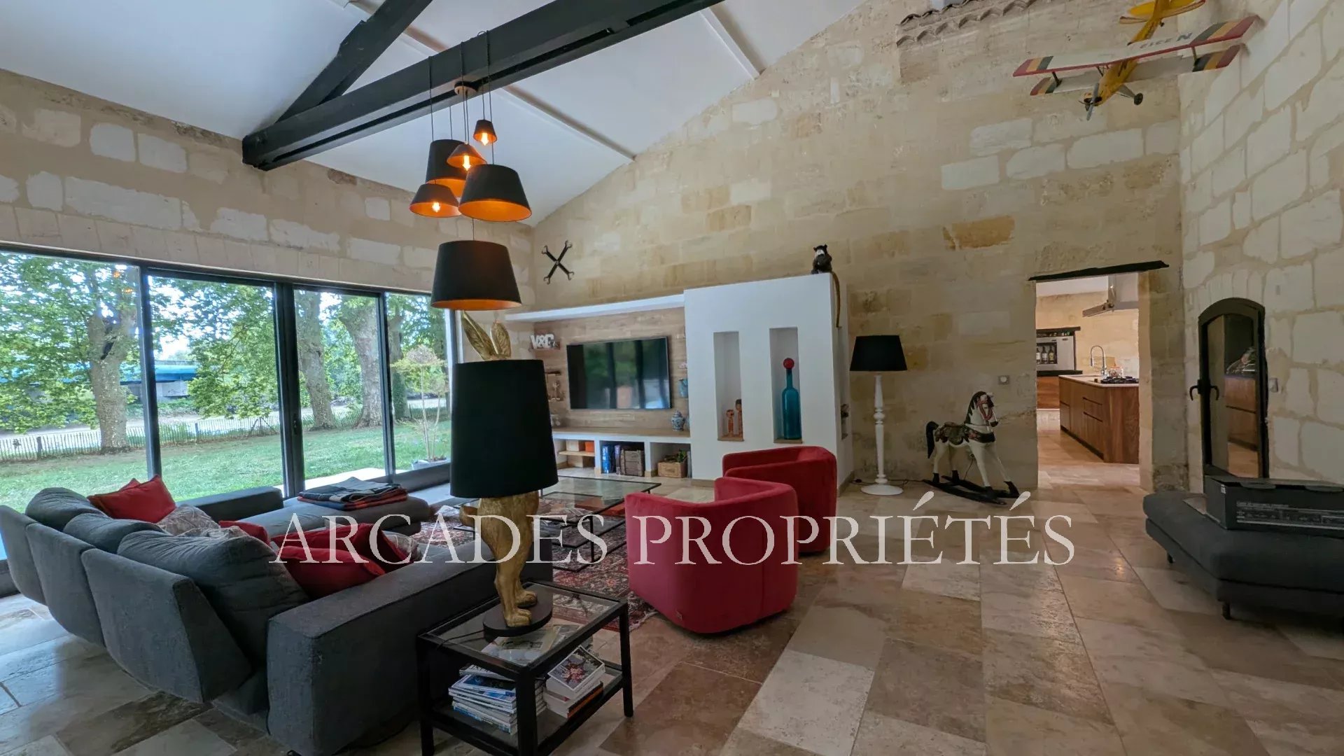 PROPRIETE D'EXCEPTION en Gironde située à 30min de Bordeaux, sur la commune de Fronsac, aux portes de Libourne. LA PROPRIETE comprend une demeure de en pierre, Maison de Maitre du 19eme siècle, entièrement restaurée avec gout et emploi de matériaux nobles ,des dépendances, un vaste garage et une seconde maison d'habitation pouvant faire office de gîte. Ce très bel ensemble immobilier implanté sur une parcelle de plus de 7ha. La Maison de Maitre aux volumes très généreux ( près de 500m² hab) et bénéficiant d'une grande luminosité comprend une très belle entrée décloisonnée distribuant d'une part un espace séjour, salon de 90m², une cuisine spacieuse et très bien équipée, un second salon de 50m², 4 chambres avec leurs salles d'eau privatives, une suite parentale de 60m² avec salle de bains et dressing, salle de cinéma, salle de jeux, espace de détente avec piscine intérieure, salle de sport et garage de de plus de 100m². Le gîte de 95m² comprend un séjour-salon, un bureau , 2 chambres avec 2 salles d'eau privative. L'entrée à la propriété se fait par un beau portail avec grille en fer forgé et débouche sur un parc paysagé et arboré avec piscine extérieure de 16x4m , parking couvert automobiles et terrasse couverte. Agence ARCADES PROPRIETES
