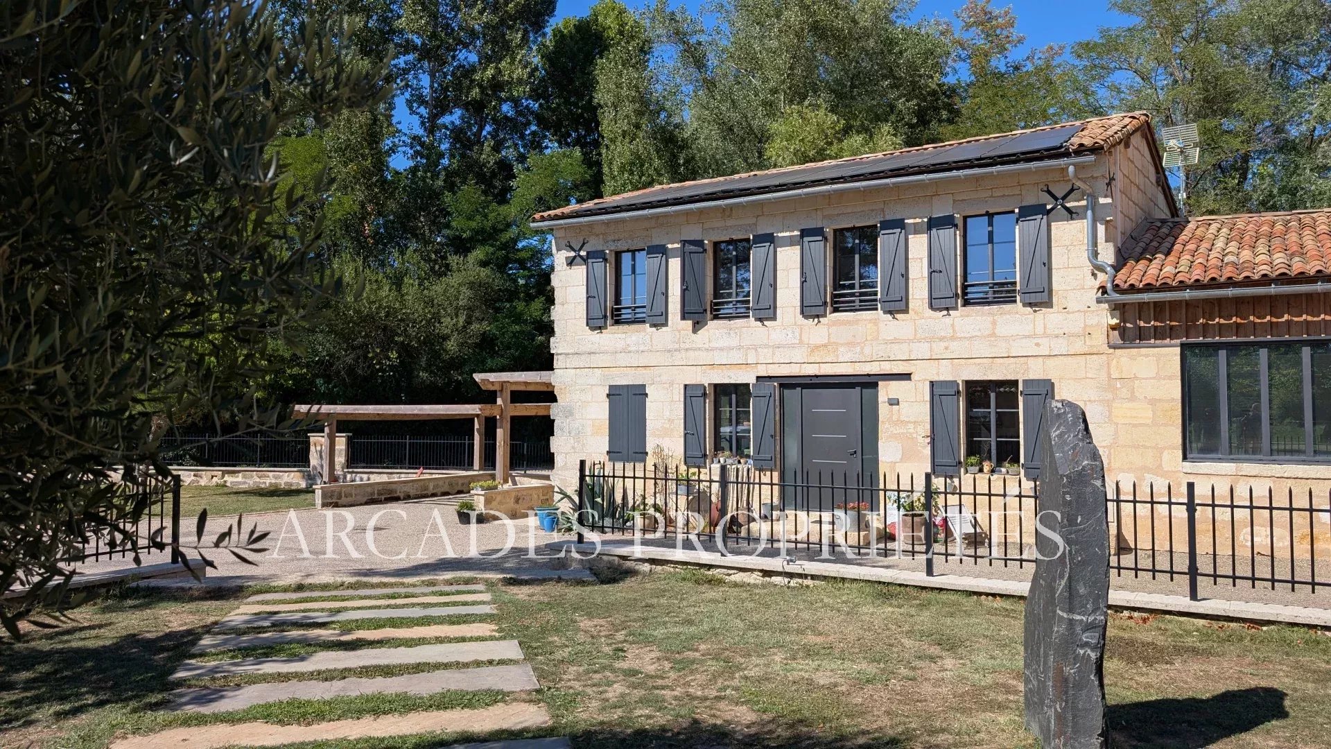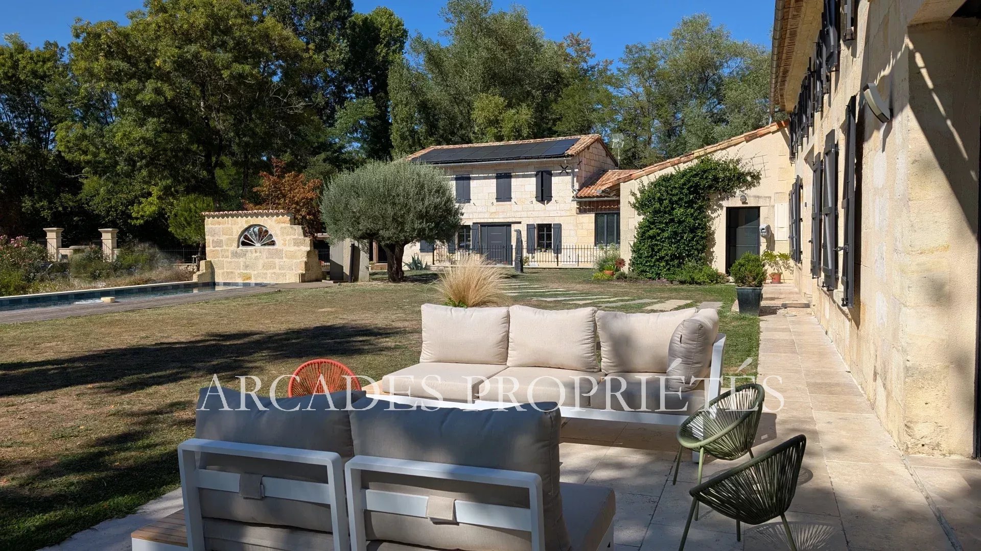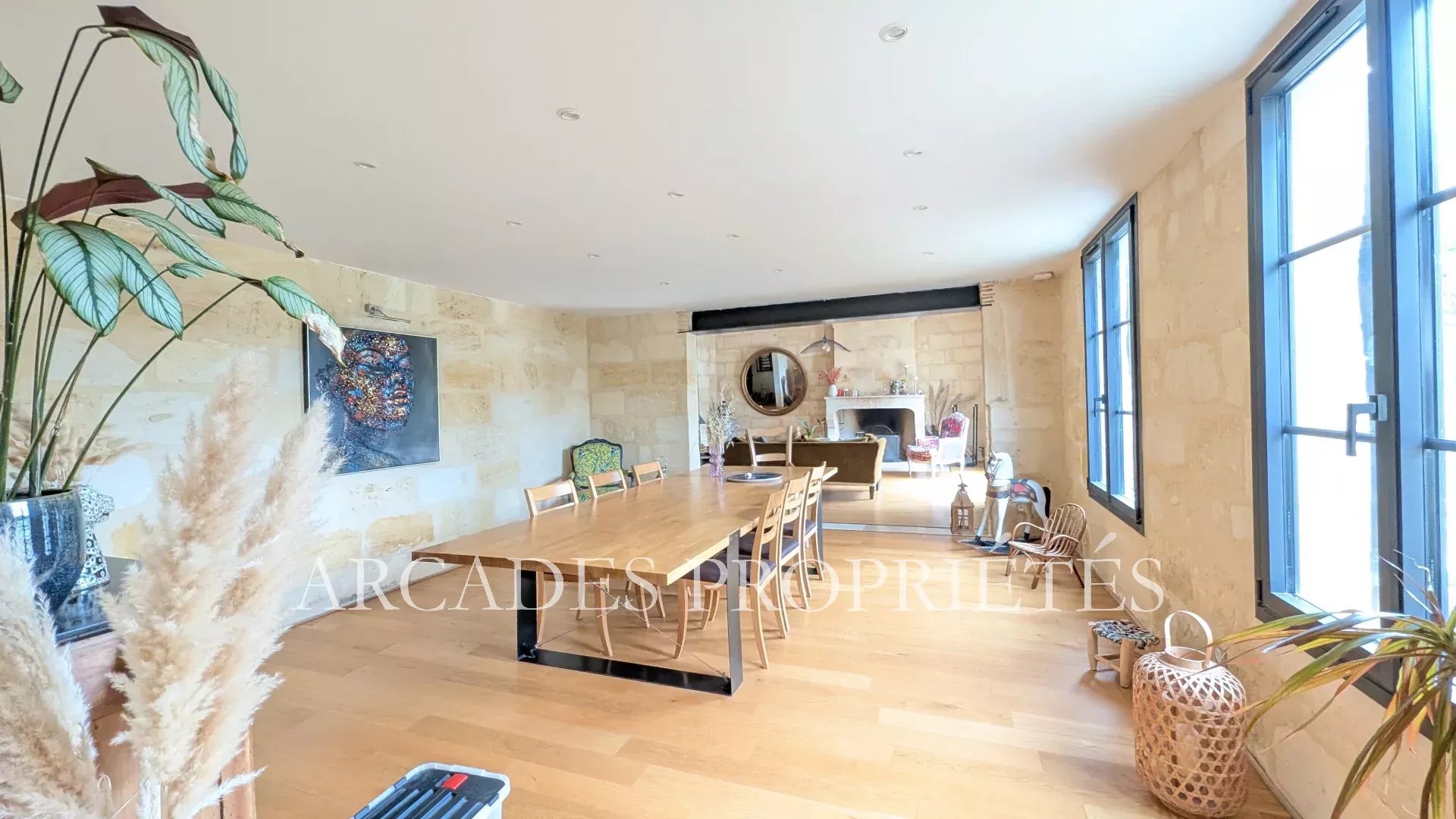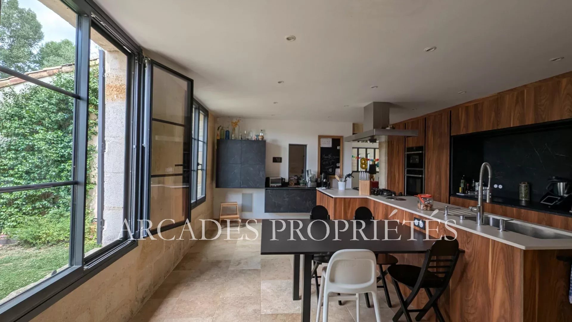 PROPRIETE D'EXCEPTION en Gironde située à 30min de Bordeaux, sur la commune de Fronsac, aux portes de Libourne. LA PROPRIETE comprend une demeure de en pierre, Maison de Maitre du 19eme siècle, entièrement restaurée avec gout et emploi de matériaux nobles ,des dépendances, un vaste garage et une seconde maison d'habitation pouvant faire office de gîte. Ce très bel ensemble immobilier implanté sur une parcelle de plus de 7ha. La Maison de Maitre aux volumes très généreux ( près de 500m² hab) et bénéficiant d'une grande luminosité comprend une très belle entrée décloisonnée distribuant d'une part un espace séjour, salon de 90m², une cuisine spacieuse et très bien équipée, un second salon de 50m², 4 chambres avec leurs salles d'eau privatives, une suite parentale de 60m² avec salle de bains et dressing, salle de cinéma, salle de jeux, espace de détente avec piscine intérieure, salle de sport et garage de de plus de 100m². Le gîte de 95m² comprend un séjour-salon, un bureau , 2 chambres avec 2 salles d'eau privative. L'entrée à la propriété se fait par un beau portail avec grille en fer forgé et débouche sur un parc paysagé et arboré avec piscine extérieure de 16x4m , parking couvert automobiles et terrasse couverte. Agence ARCADES PROPRIETES