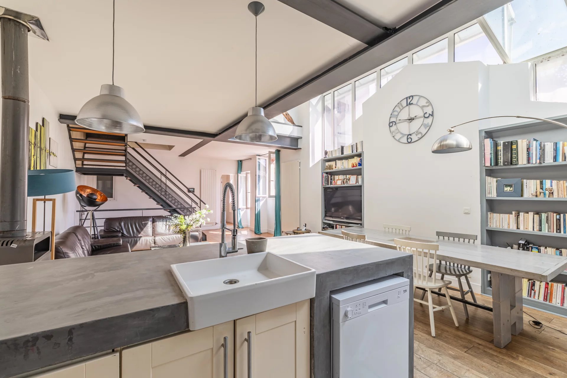Un escalier dessert, au premier étage, un vaste séjour/cuisine sous verrière de 50m2, une suite parentale (chambre, salle de douche et dressing) et un wc séparé. Au deuxième étage, 3 chambres avec chacune sa mezzanine, un espace ouvert sur le séjour donnant accès à une terrasse privative, une salle de bain et un wc séparé.
