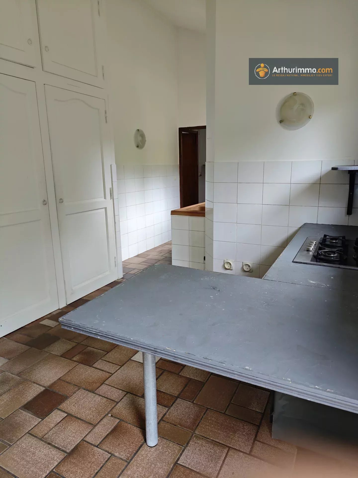 Une pièce cuisine, avec accès à un cellier et à un garage.