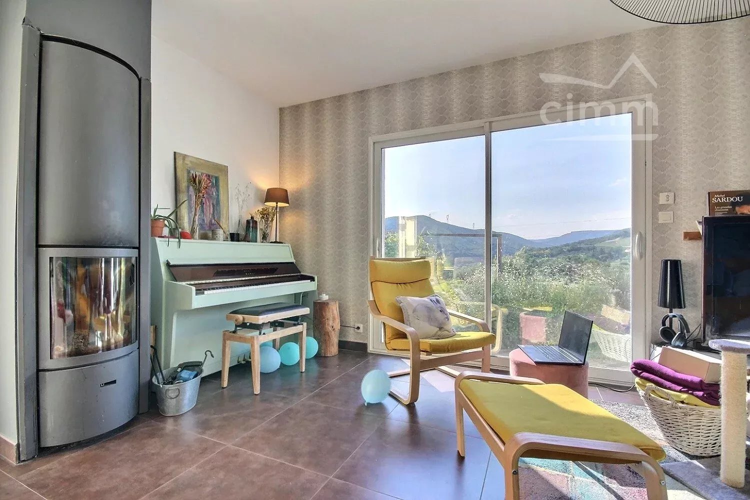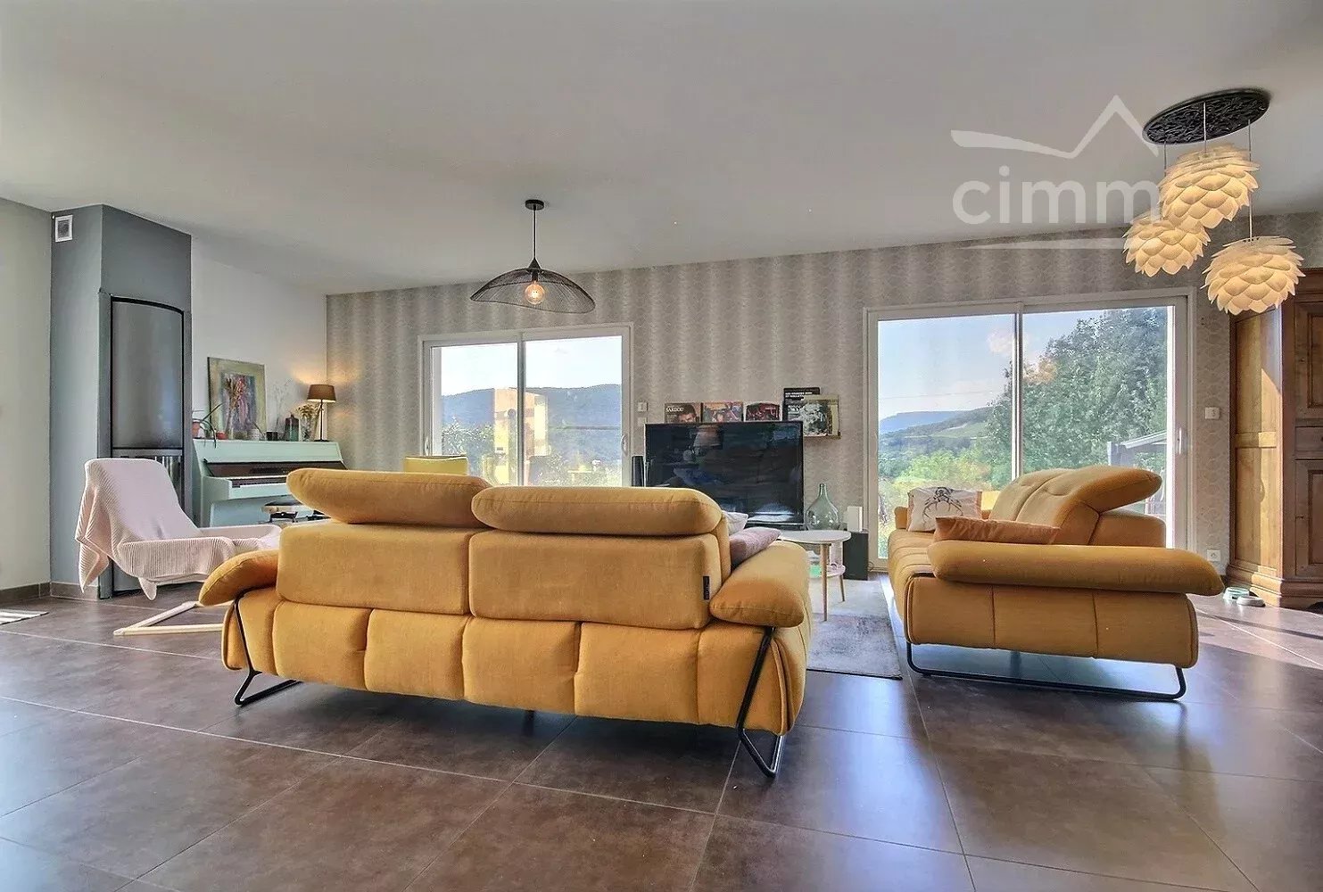 La pièce maîtresse du bien : une pièce de vie de 66 m², orientée sud-ouest, avec vue panoramique sur les collines environnantes. Cet espace, doté d’une cuisine équipée, bénéficie d’un ensoleillement généreux tout au long de la journée. Le poêle à bois apporte une atmosphère chaleureuse en période hivernale.