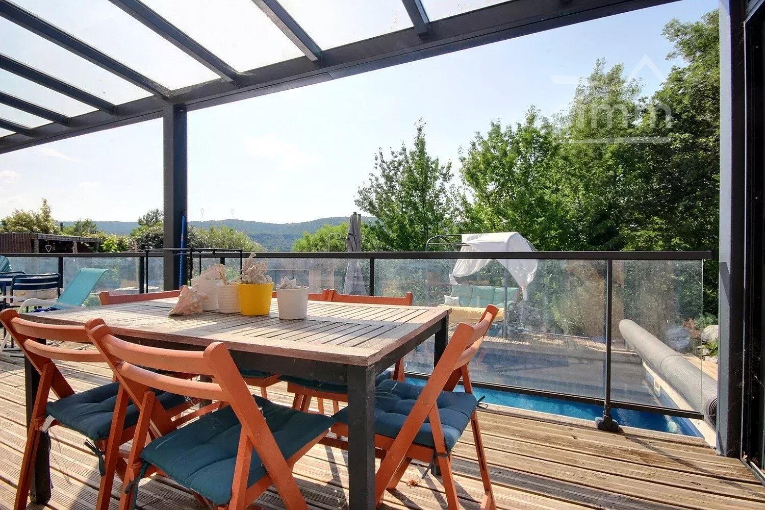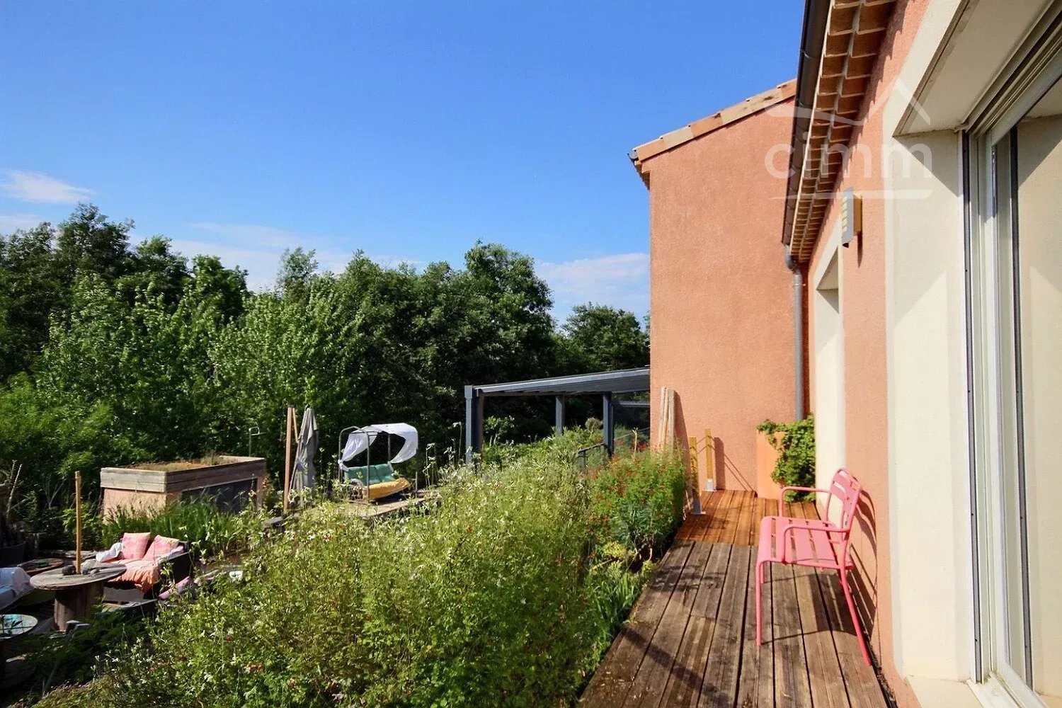À l’extérieur, vous profiterez d’une terrasse dominant la piscine et d’un garage de 17 m².