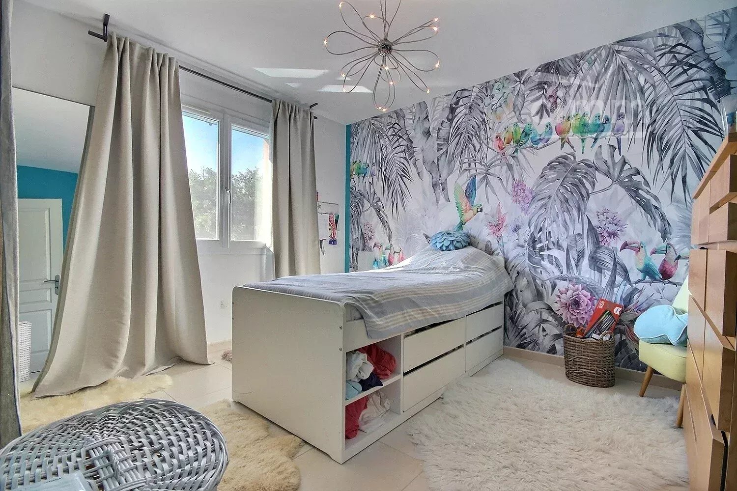 En demi-niveau inférieur, un volume indépendant accueille la buanderie, un séjour supplémentaire avec cuisine équipée, la 4ᵉ chambre, et une salle d’eau avec WC. Une configuration idéale pour recevoir, loger un adolescent, créer une cuisine d’été ou développer un revenu locatif.