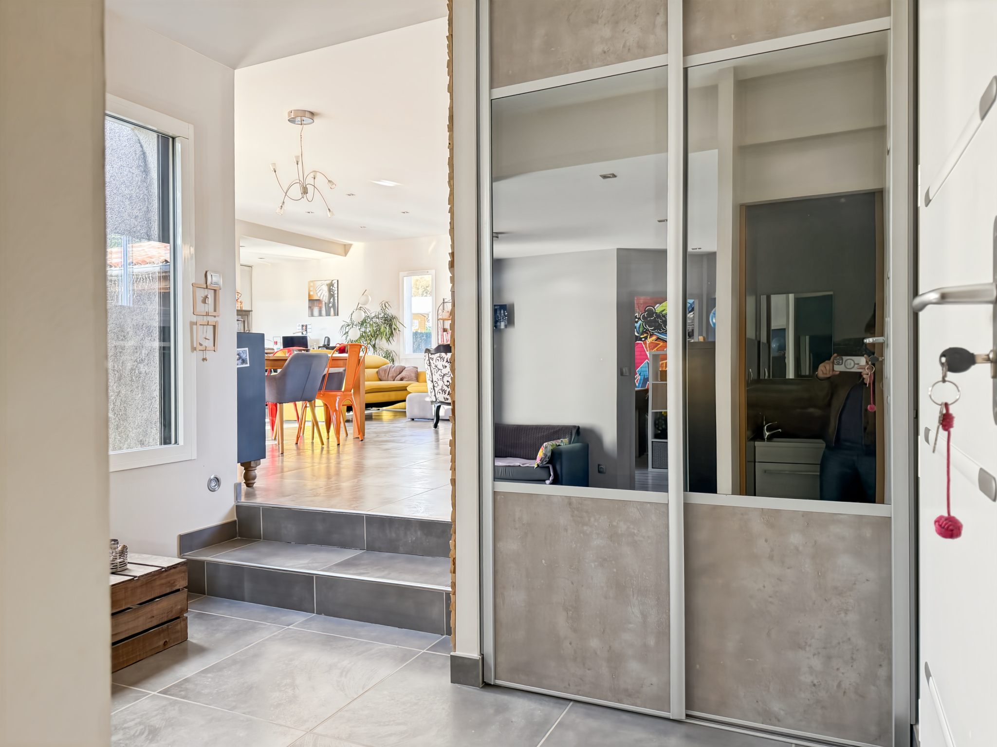 La maison propose 136 m2 env. de surface habitable en demi-plain-pied avec Accès direct à une jolie Terrasse couverte par une Pergola Bioclimatique donnant sur le Jardin et la Piscine en contrebas... Elle est composée d'un grand Hall d'entrée avec Placard et WC indépendant, d'une Splendide Pièce de Vie avec sa Cuisine moderne entièrement équipée Ouverte sur l'espace Salle à Manger et le coin Salon Cosy et Chaleureux, le tout baigné de lumière avec ses grandes Baies vitrées donnant sur la Terrasse et le Jardin.