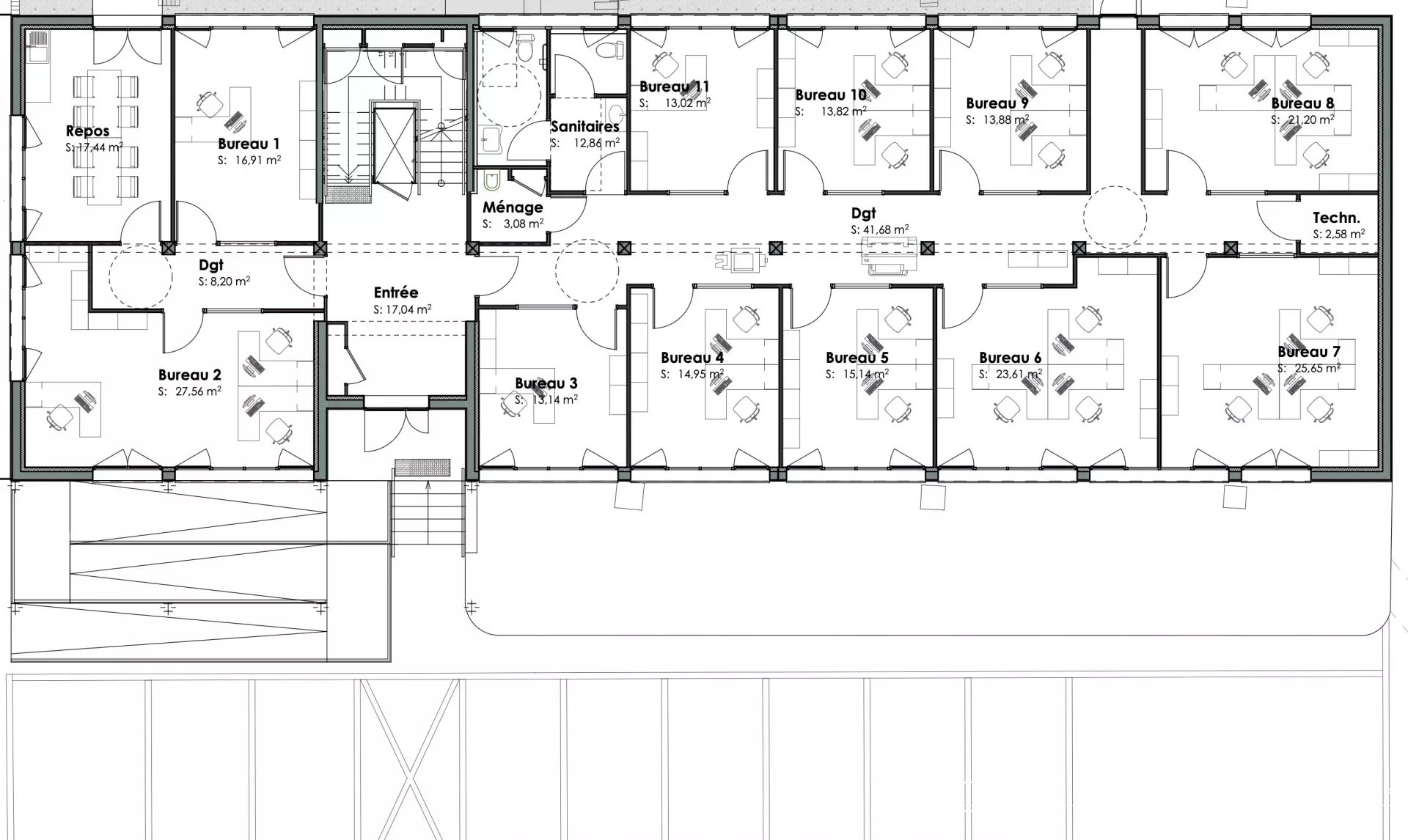 11 bureaux indépendants de tailles variées (de 13 à 28 m²), tous climatisés individuellement et très bien isolés phoniquement,