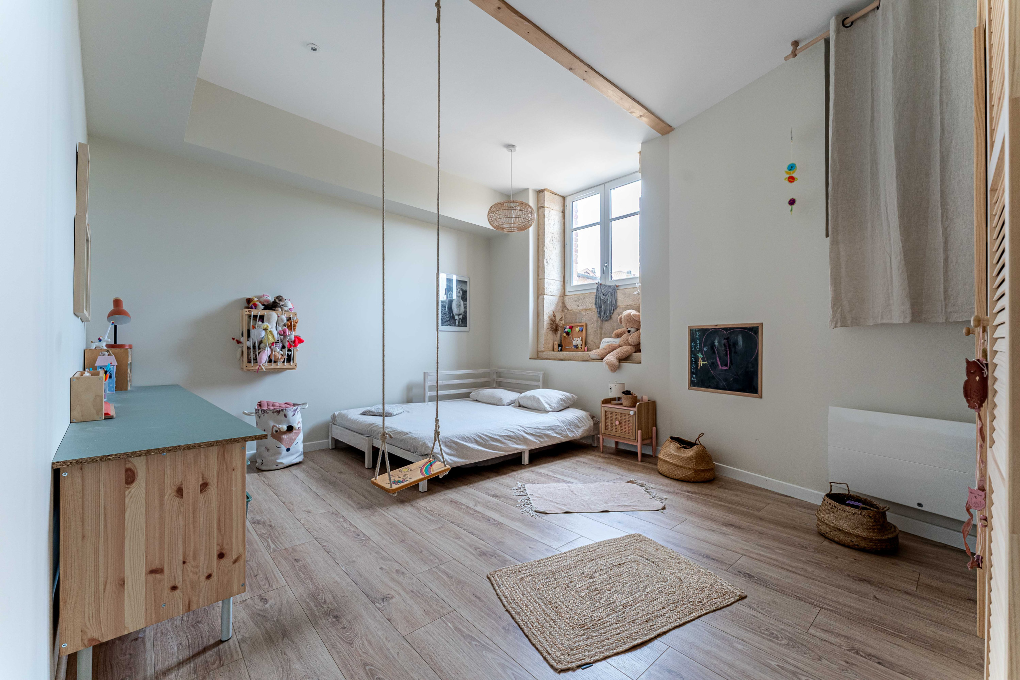 Au premier étage 3 chambres spacieuses ( 18, 14 et 11m2 ) avec une magnifique salle de bain avec douche à l'italienne, baignoire et double vasque et un coin détente atypique avec ce filet de catamaran idéal pour bouquiner ou se détendre. Un wc également complète ce niveau.