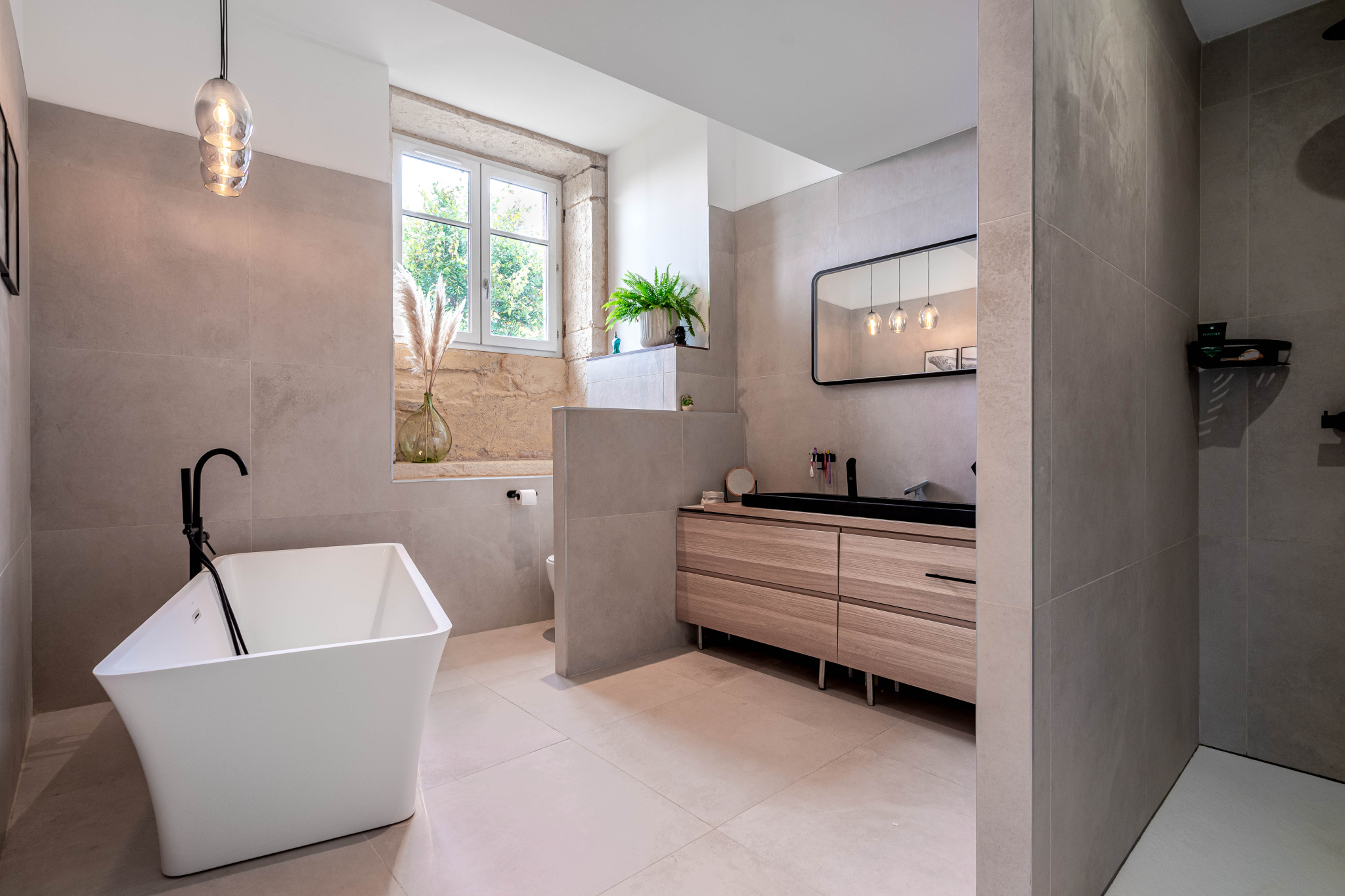 Située à une centaine de mètres du coeur du village, cette superbe maison en pierres de plus de 200m2, entièrement rénovée en 2022, allie le charme de l'ancien et le confort du contemporain.