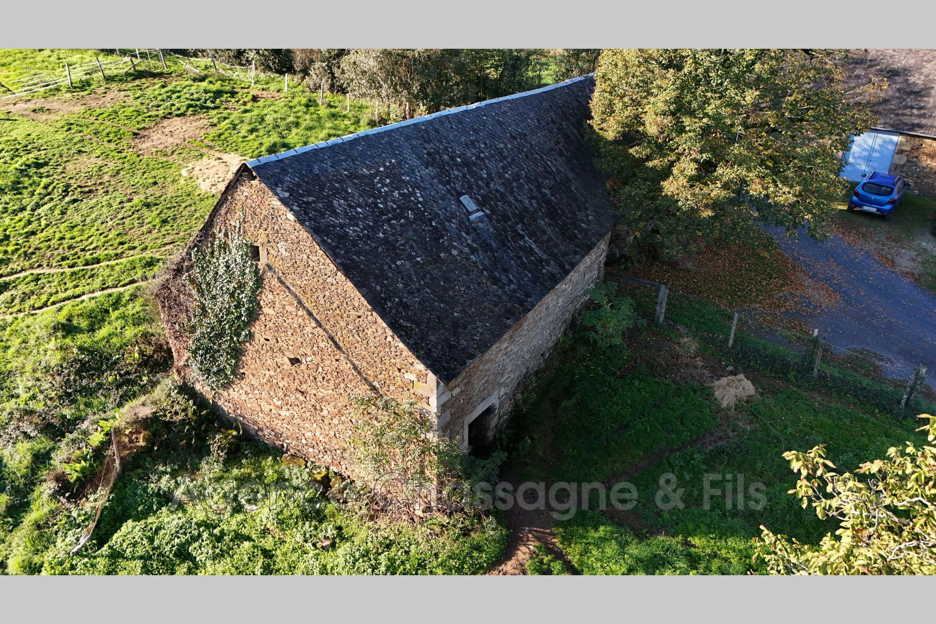 La grange dispose d'une structure saine, avec des murs en pierre, une charpente en bois en bon état et une couverture en ardoise de pays.