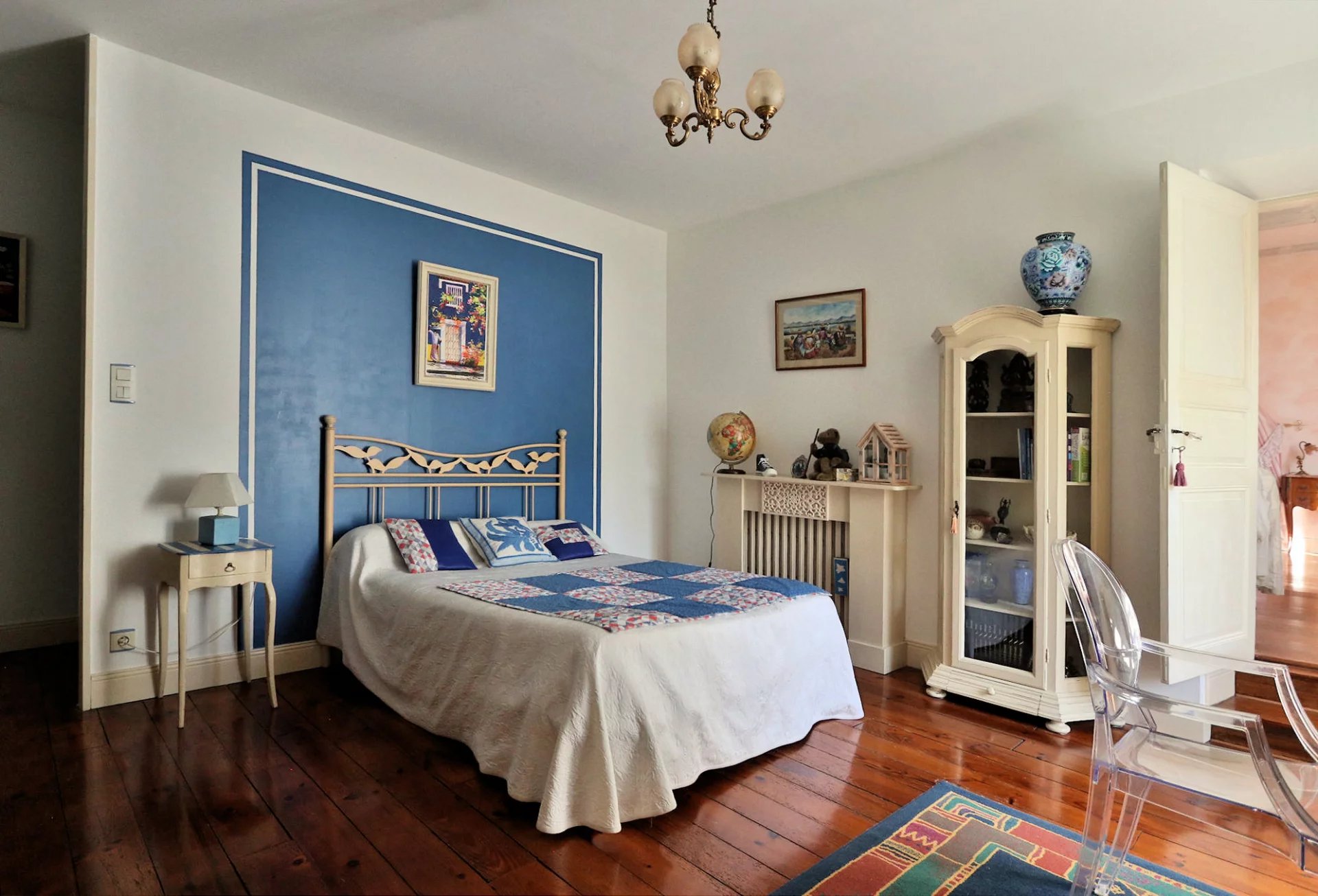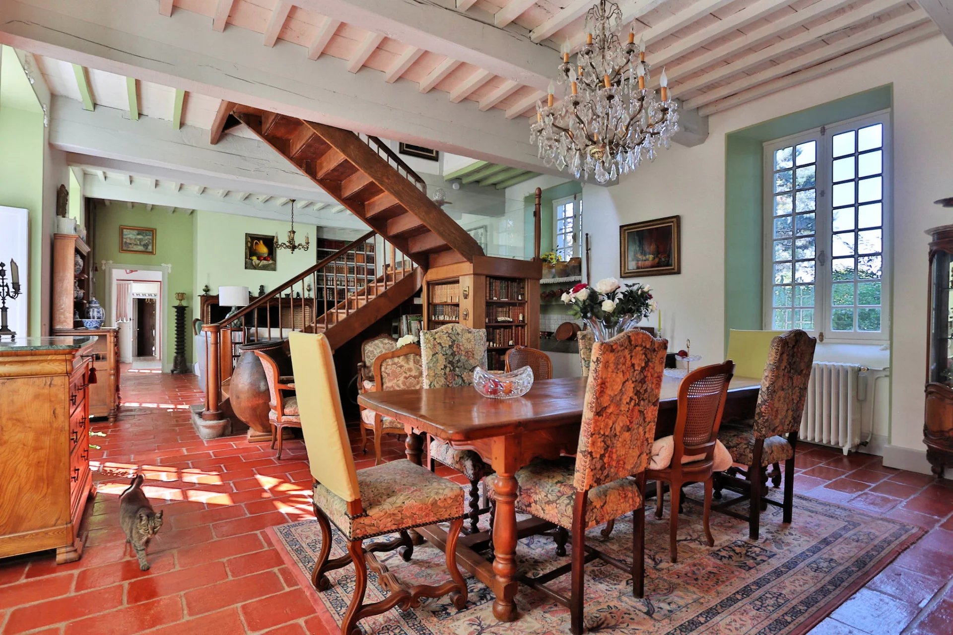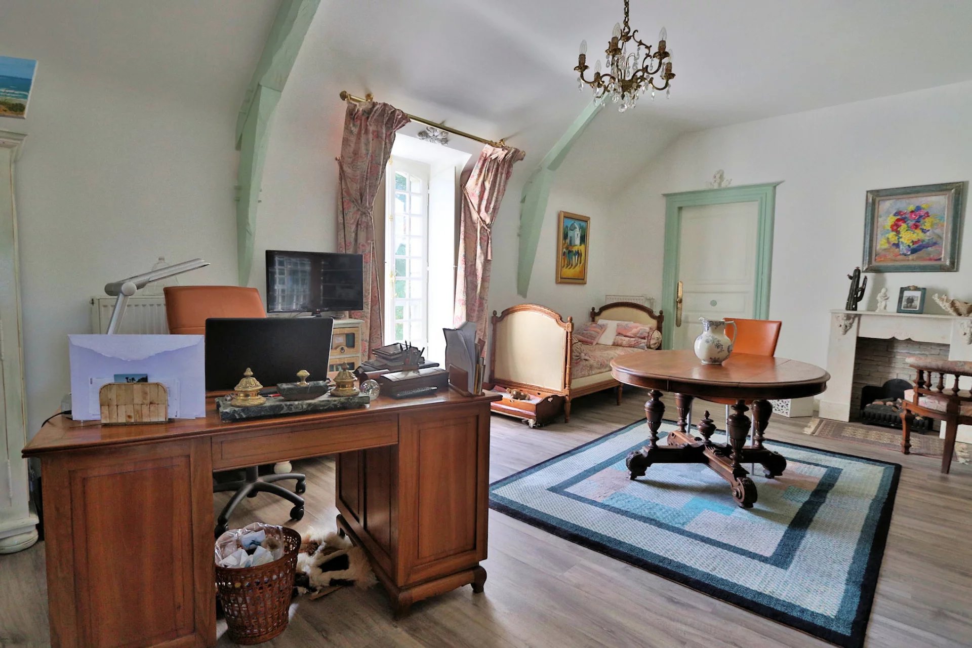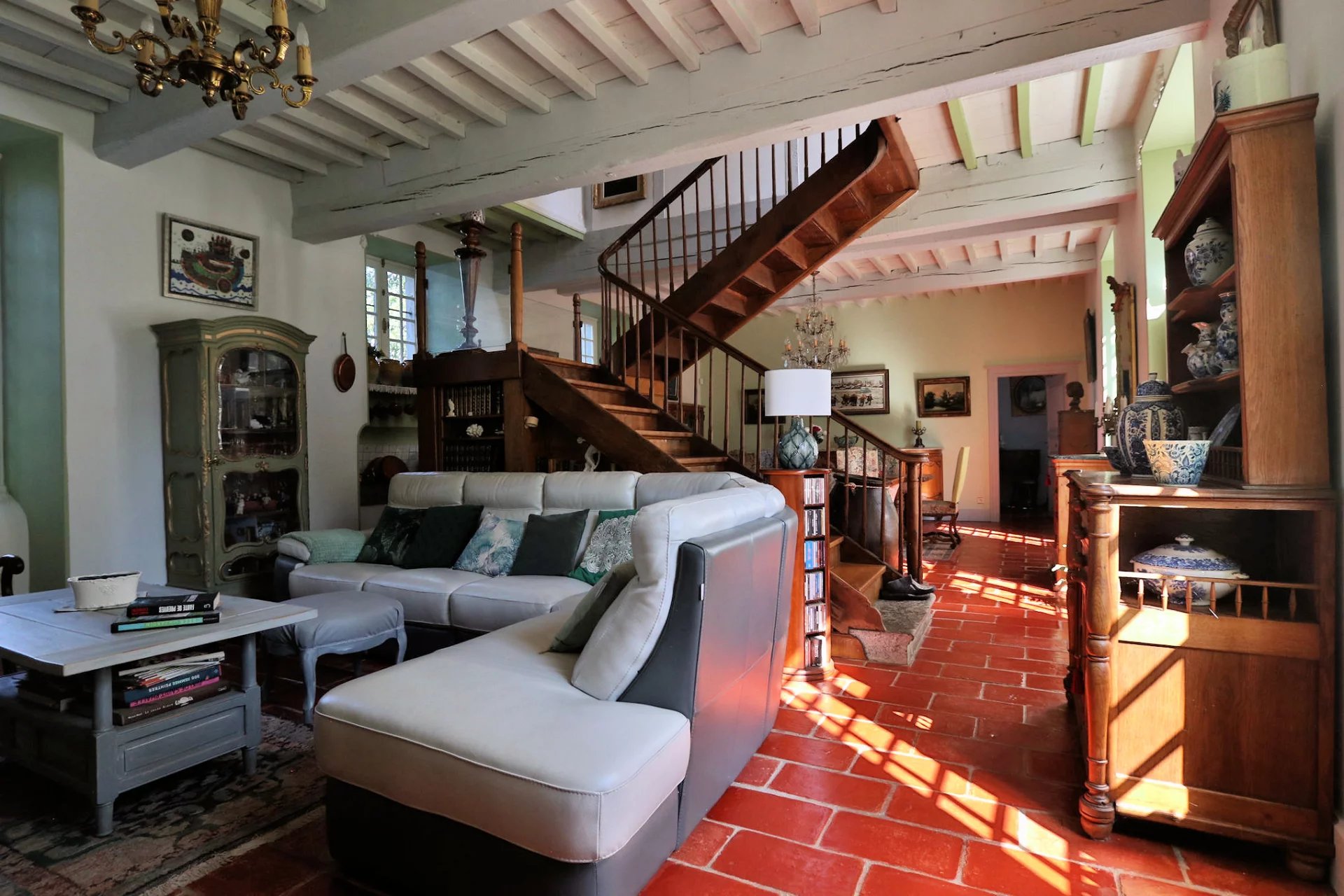 Développant plus de 400 m² habitables, la propriété offre cinq chambres spacieuses, réparties sur deux niveaux. Exposée plein sud, elle bénéficie d’une luminosité exceptionnelle et d’une vue dégagée sur le jardin et la campagne environnante.