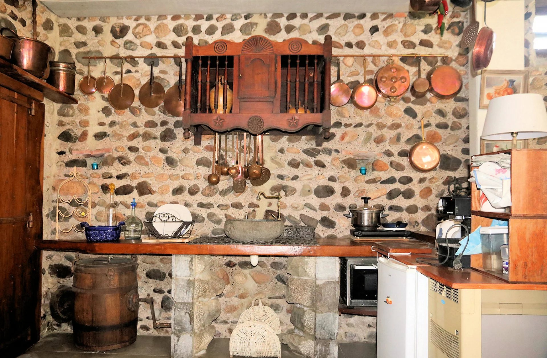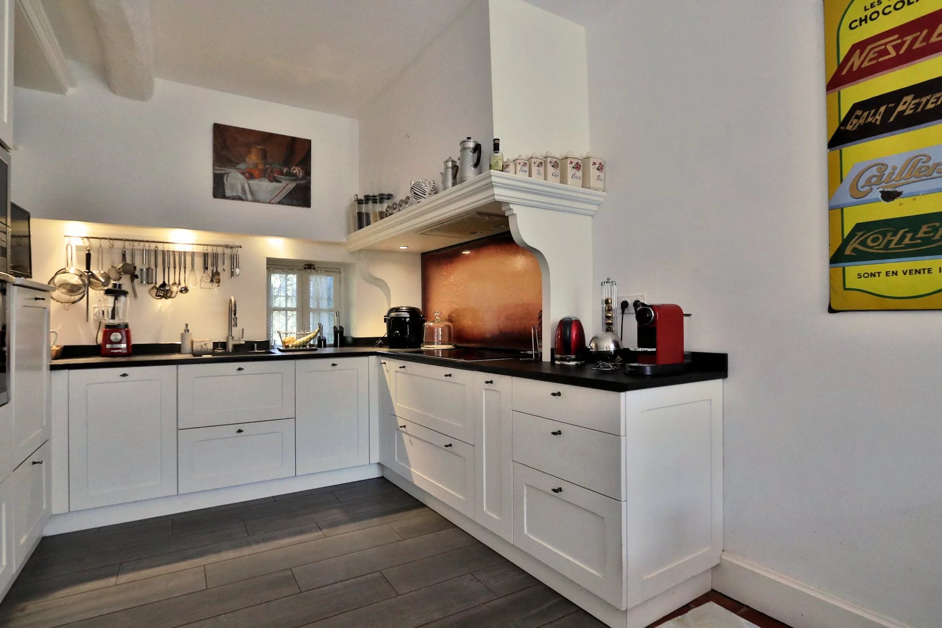 • Une cuisine professionnelle entièrement équipée, dotée d’un plan de travail en granit noir, d’un réfrigérateur américain intégré et de fours encastrés.