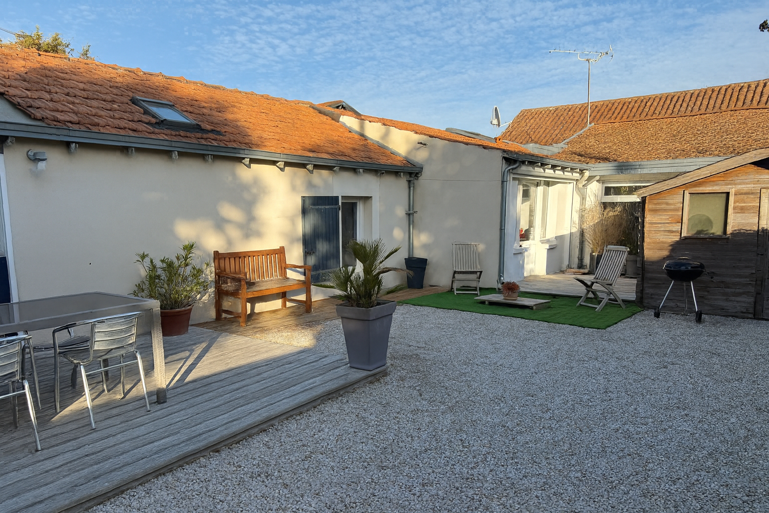 Idéalement située à proximité immédiate du centre et de la plage, cette charmante maison de plain-pied de 92 m² sur une parcelle de 200 m² offre un cadre de vie rare sur le littoral charentais. Elle se compose d'une entrée, d'un salon séjour lumineux exposé Sud-Ouest, d'une cuisine aménagée et équipée, de trois chambres, d'une salle d'eau avec WC ainsi qu'une salle de bains avec WC. Une buanderie vient compléter cet ensemble fonctionnel. Côté extérieur, vous profiterez d'un jardin agréable, sans vis-à-vis, avec possibilité de stationner deux véhicules sur la parcelle. Maison en bon état général, équipée de menuiseries PVC double vitrage, chauffage individuel au gaz, et bonne isolation (laine de verre). Prix du bien : 441 900 euros Prix du bien hors honoraires : 425 000 euros Honoraires TTC : 3.98 % soit 16900 euros à la charge de l'acquéreur (3.98 % honoraires TTC à la charge de l'acquéreur.)