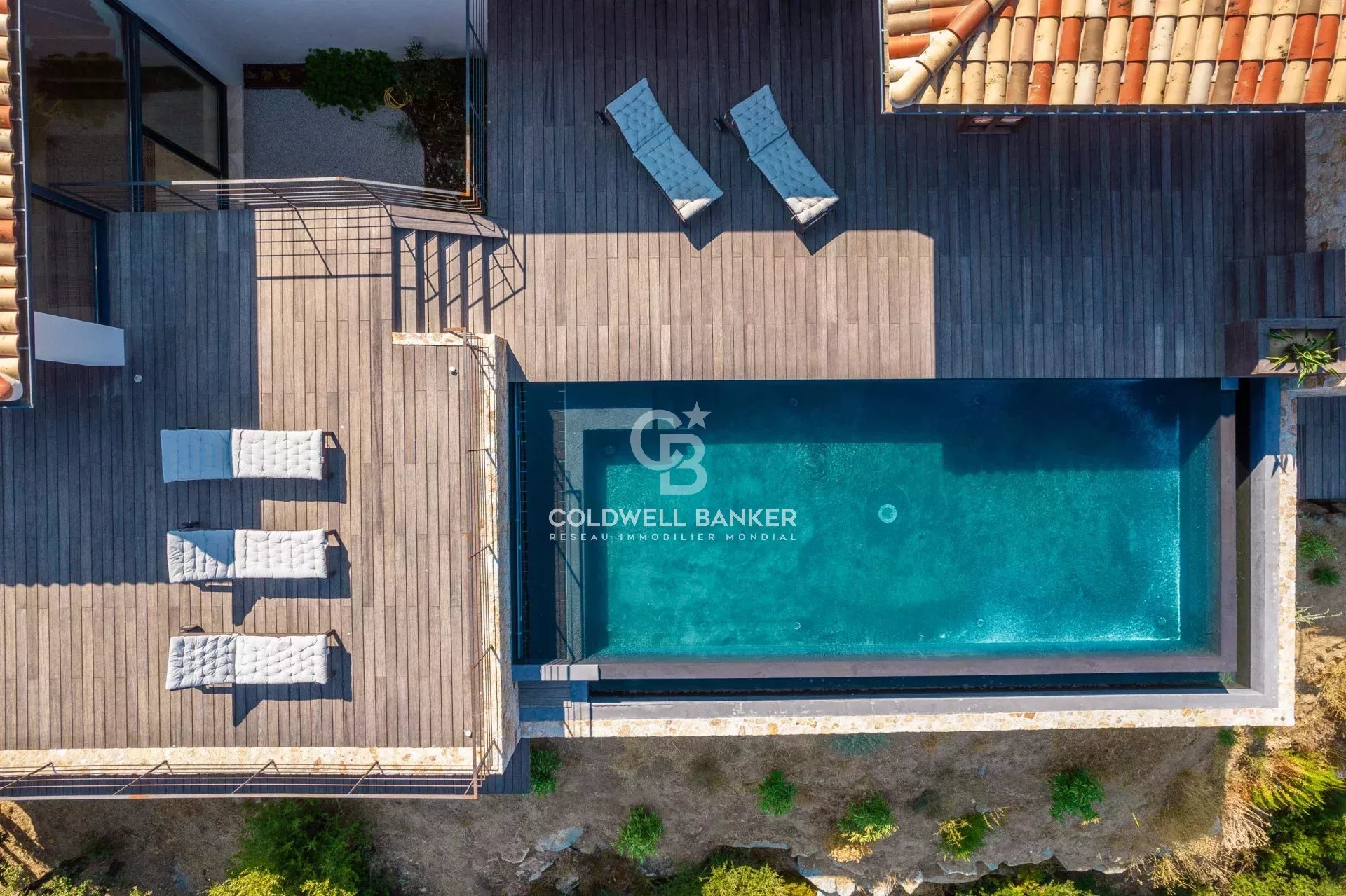 Piscine à débordement au sel, chauffée, avec plage en bois exotique et volet roulant immergé.