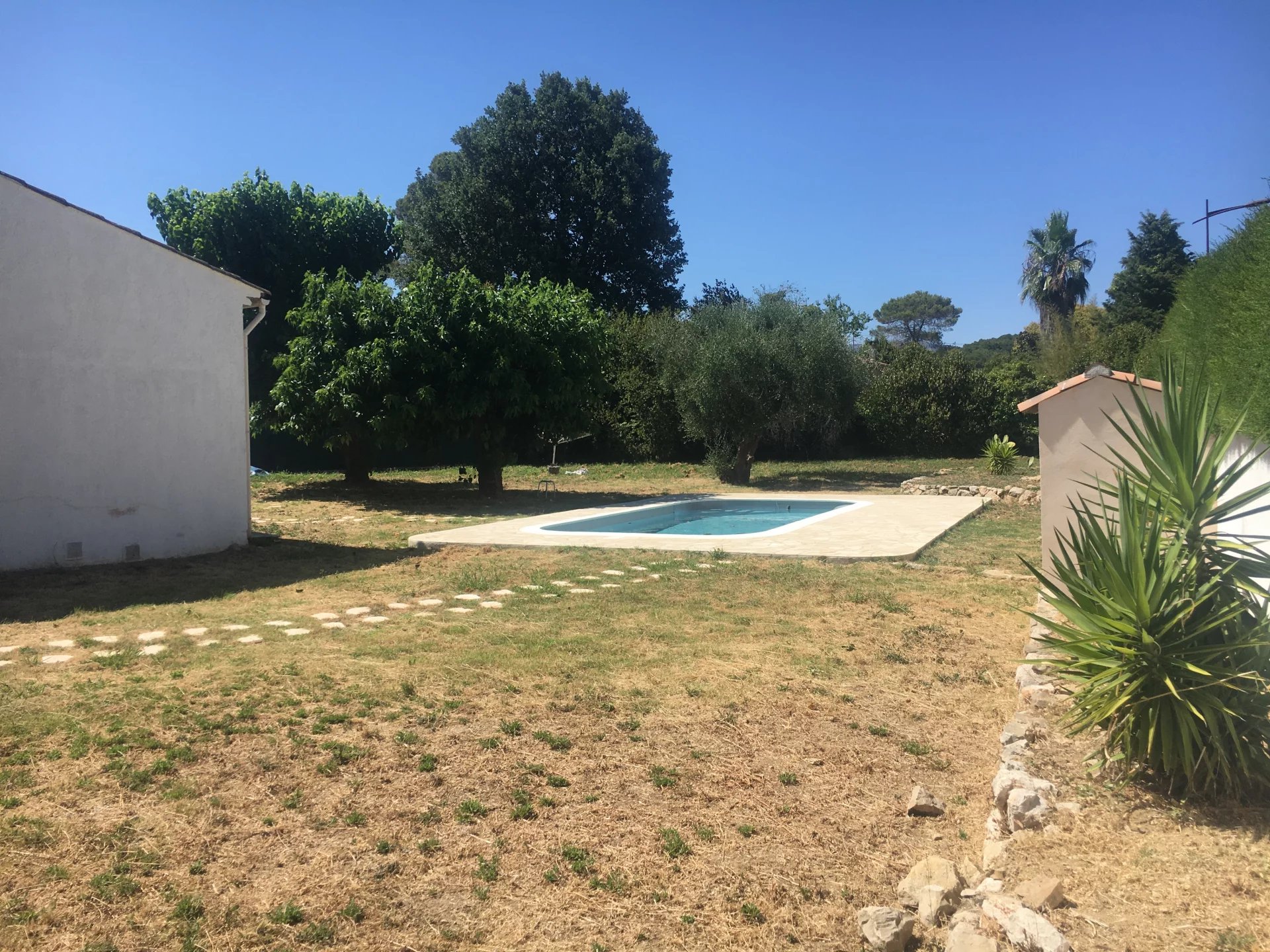 Jolie Villa de plain-pied de 155 m2 habitables (143 m2 équivalent loi Carrez) à rafraichir, sur un magnifique terrain plat d'environ 1650 m2. Située dans un quartier très recherché proche des écoles internationales, de Sophia et de Cannes. Villa semi-détachée, piscine récente, joli jardin provençal, abri voiture, possibilité d'agrandissement et de détachement pour construire.