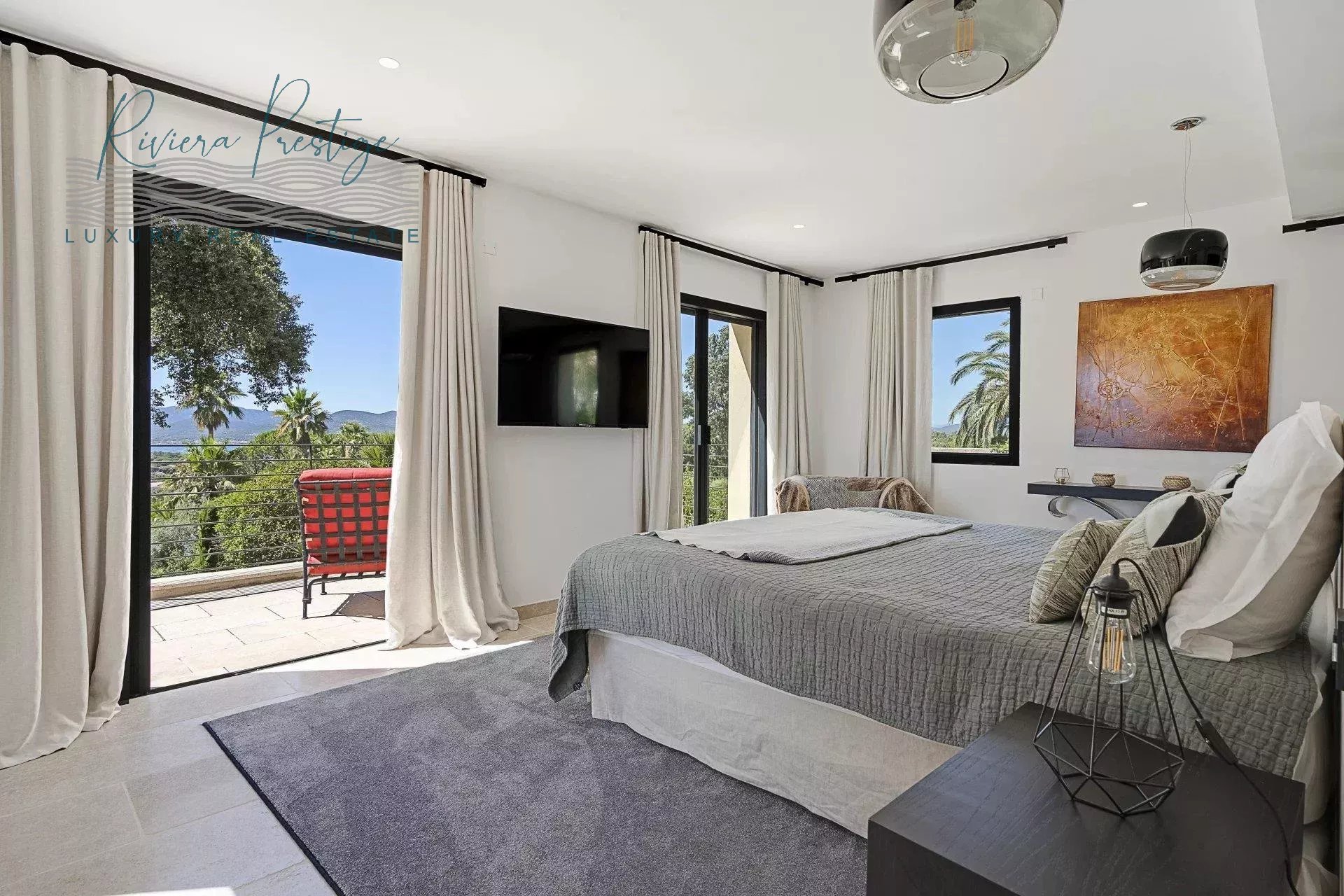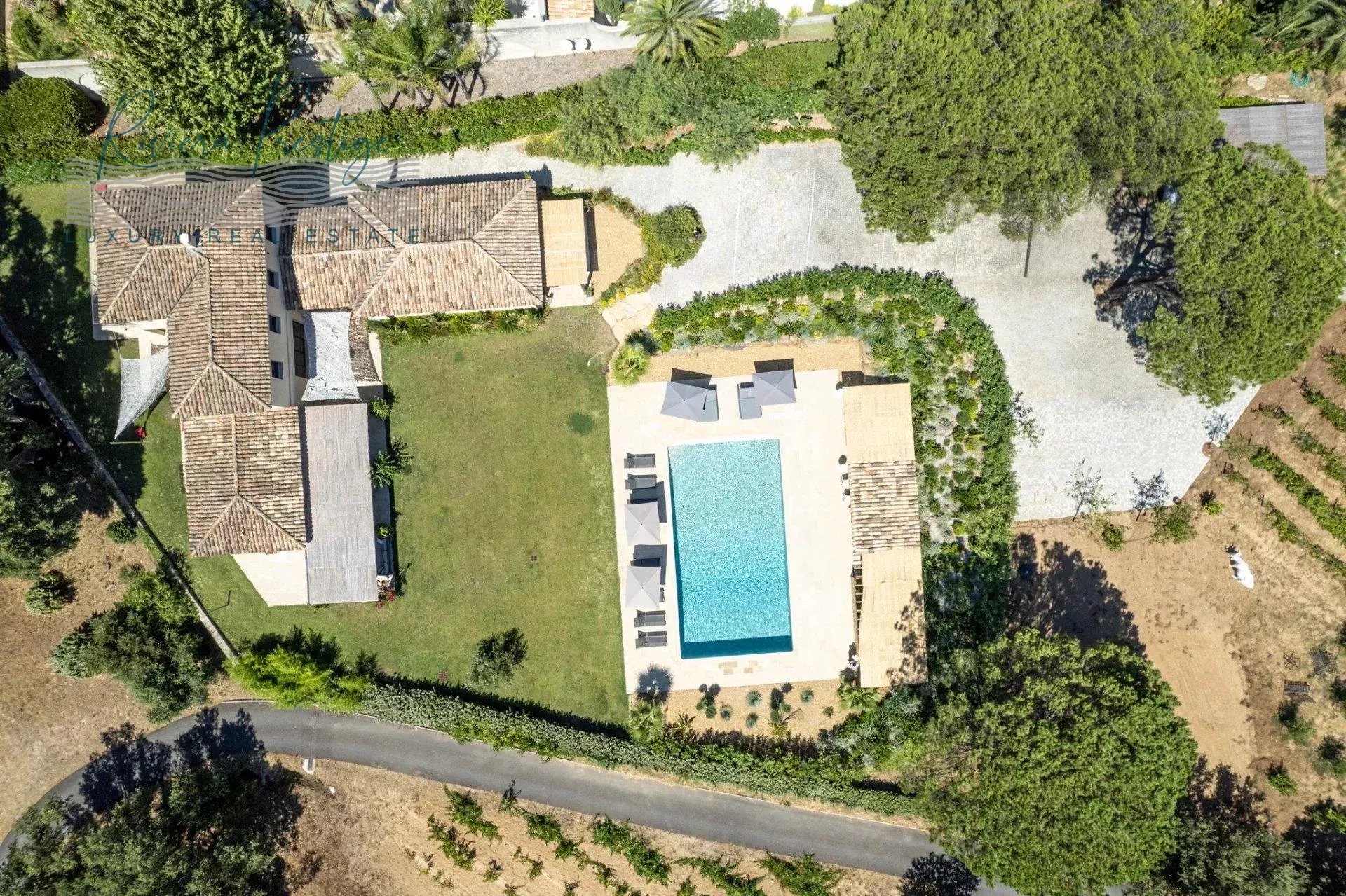 Villa d’architecture contemporaine édifiée sur un terrain paysager d’environ 5 150 m², située à proximité de la Chapelle Sainte-Anne, à environ 1,5 km du centre du village et des plages de Pampelonne et de Tahiti.