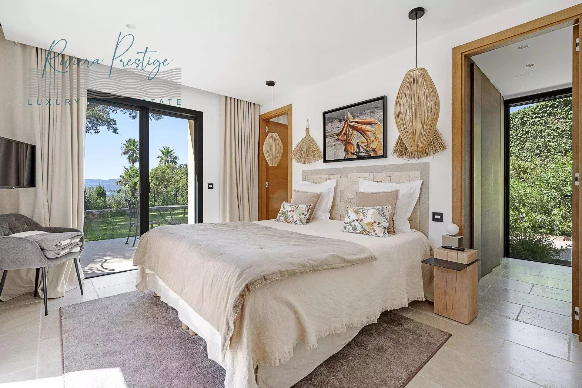 À l’étage : une chambre de maître d’environ 60 m², disposant d’un dressing, d’un bureau attenant, d’une terrasse privative et d’une vue mer.