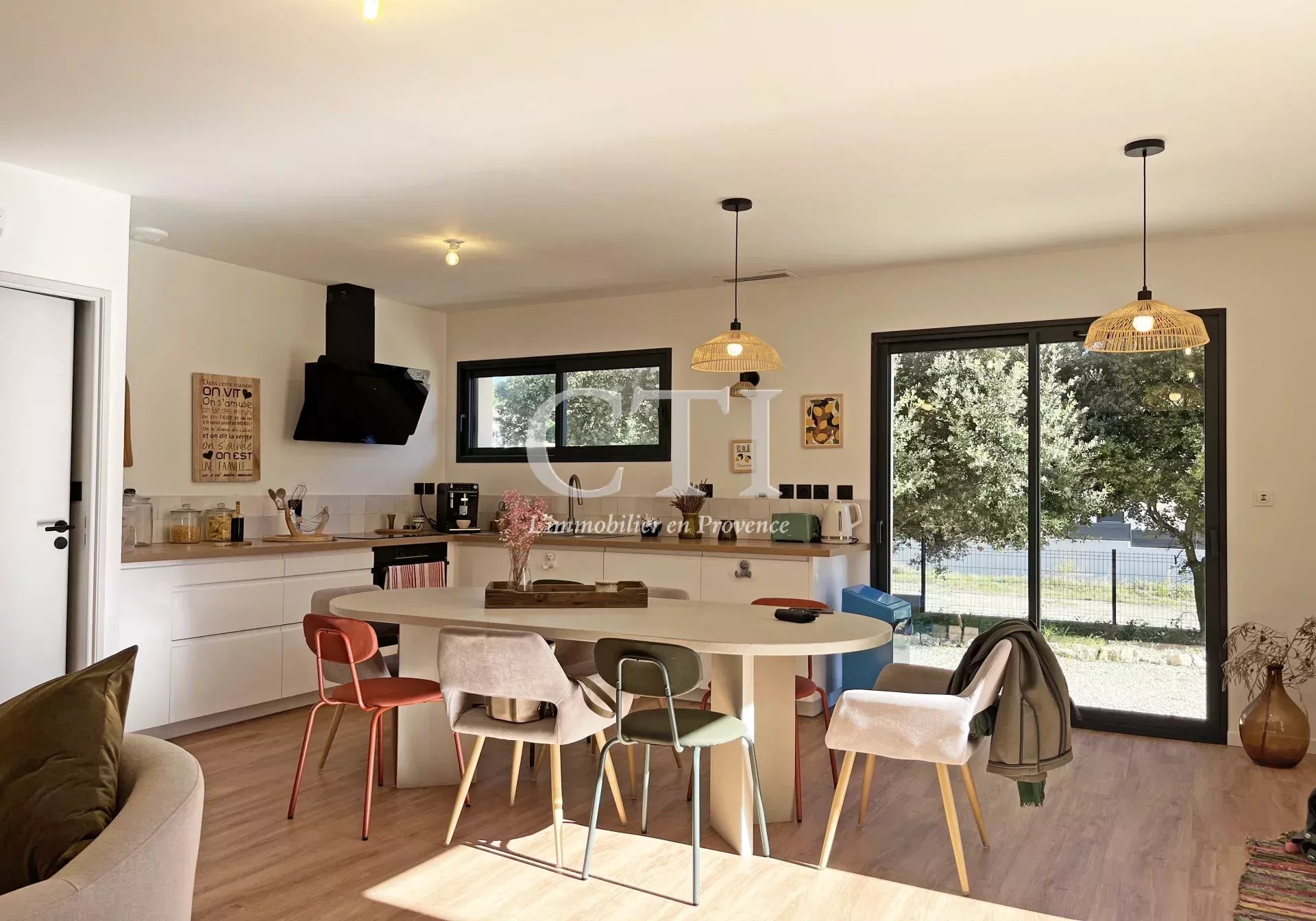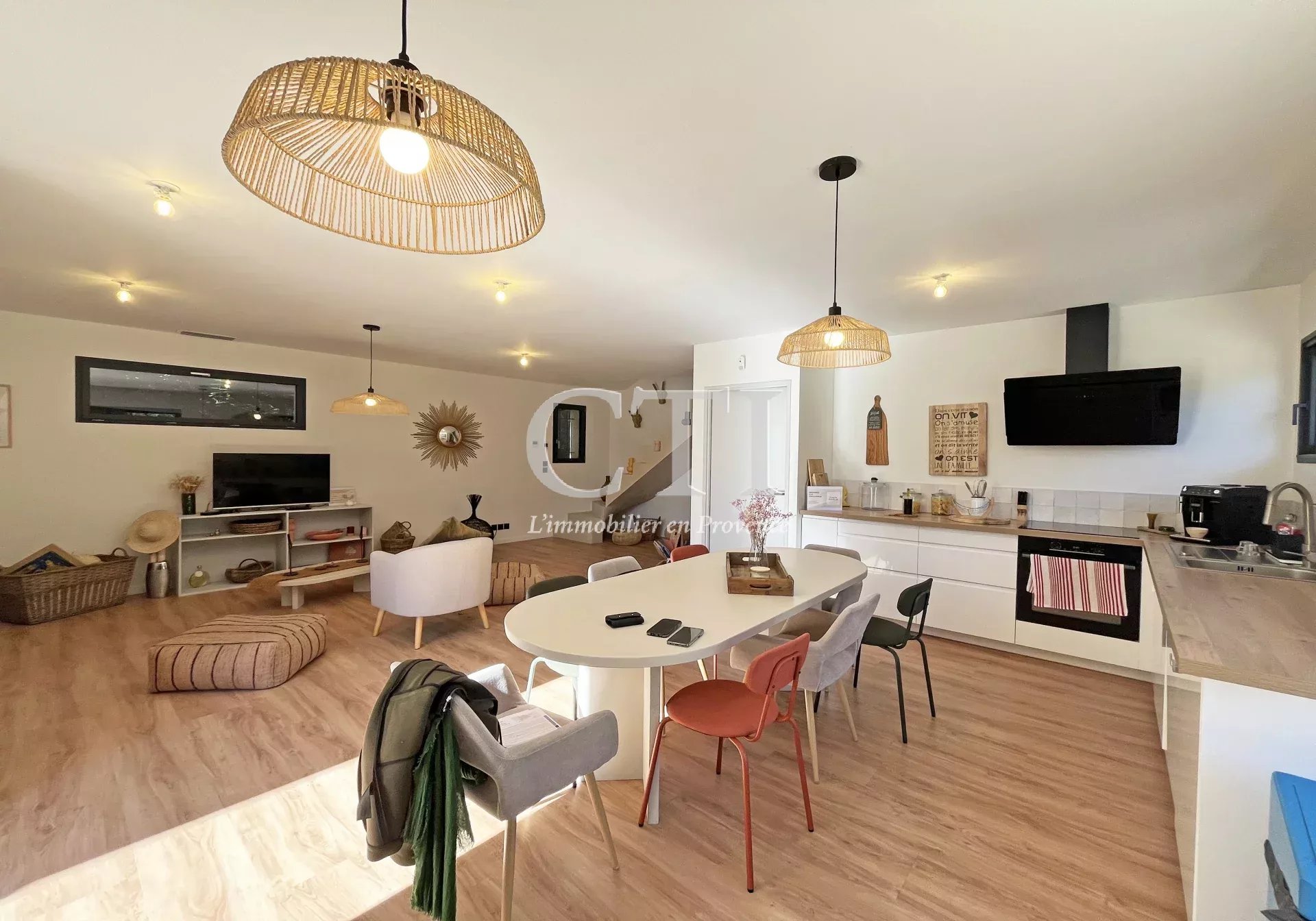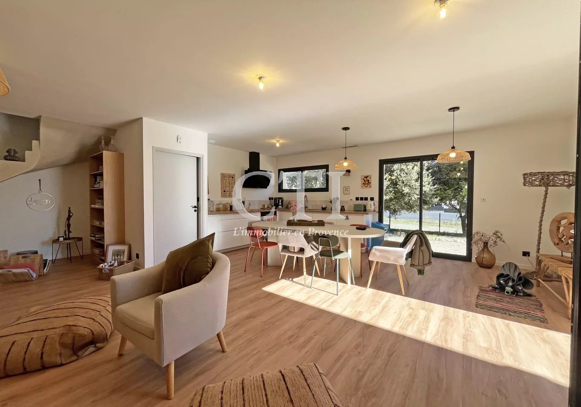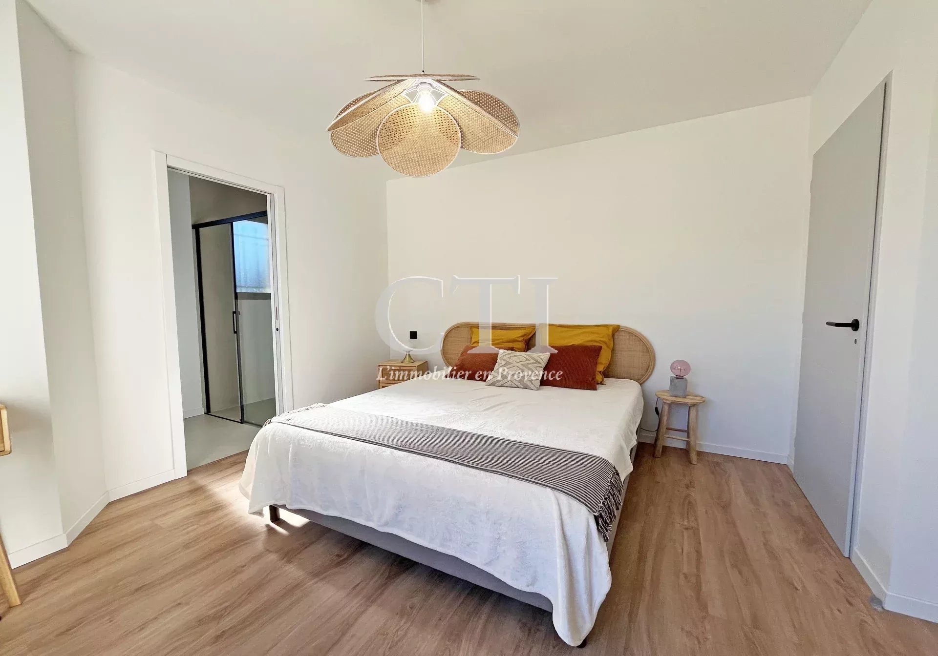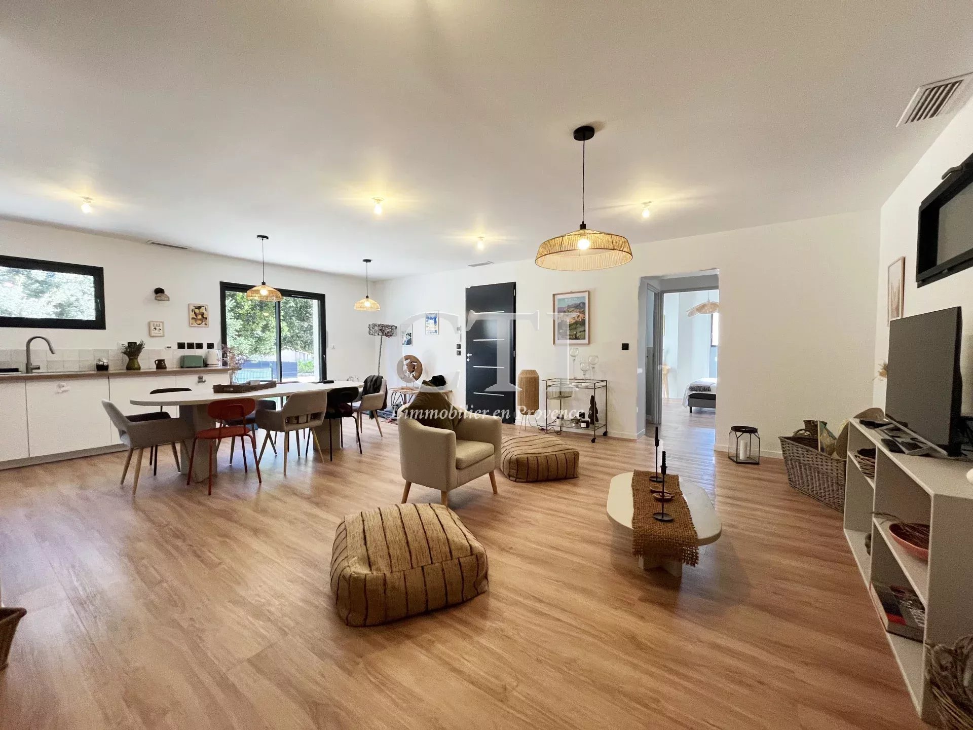 La pièce de vie de 44 m², avec sa cuisine aménagée et équipée, s’ouvre sur une agréable terrasse exposée plein sud, idéale pour profiter du climat provençal.