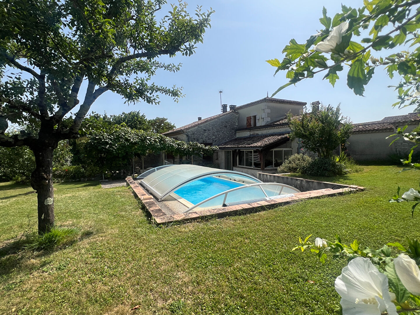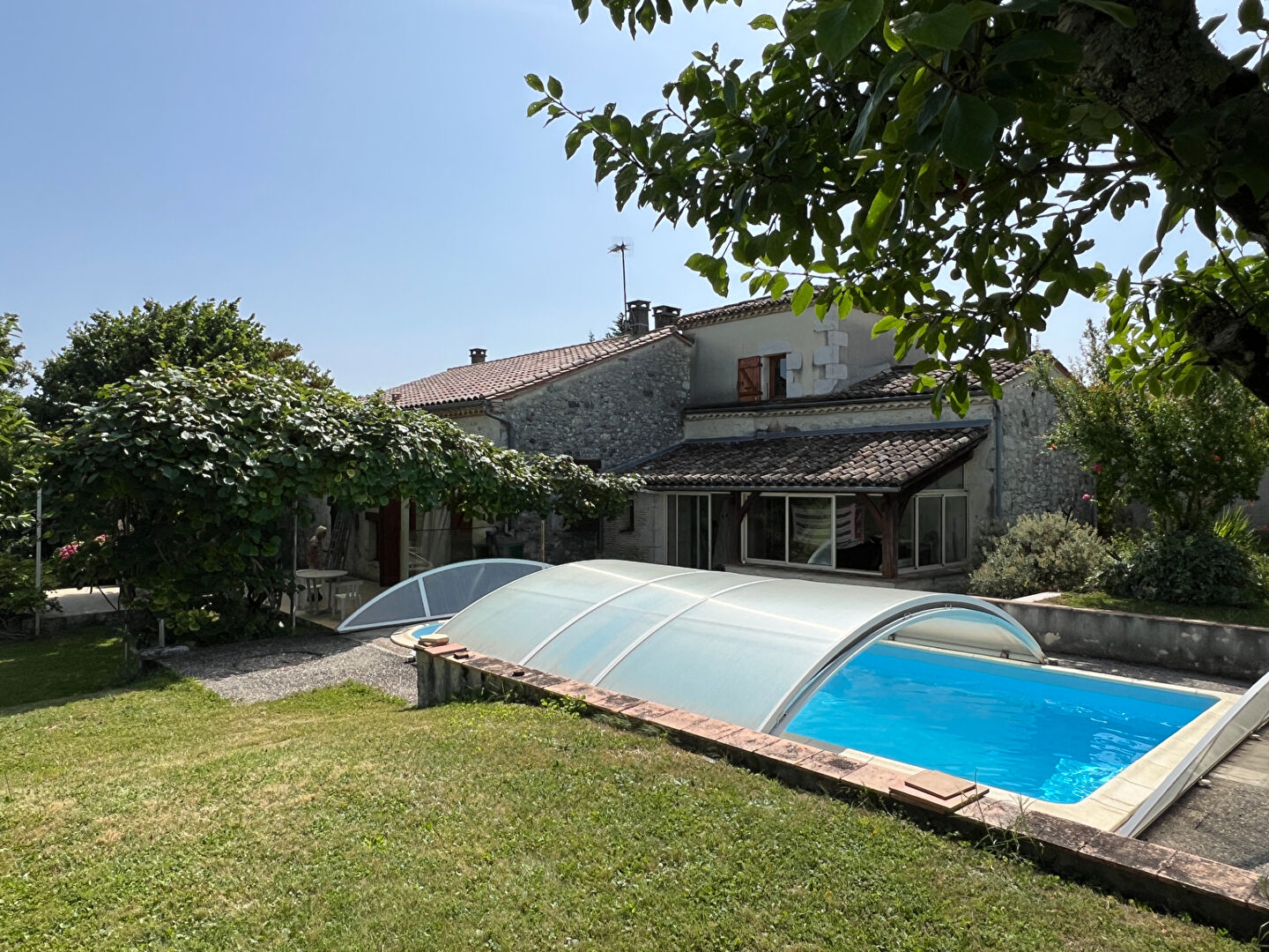 Localisation : Ancienne ferme rénovée avec beaucoup de charme, proche d'un village classé avec tous commerces ,et à 25 minutes de Bergerac, son aéroport et sa gare SNCF. Habitation : Maison de campagne d'environ 160 m² au calme mais non isolée, profitant d'une piscine et d'un terrain arboré et fleuri. L'habitation principale se compose d'une véranda, d'un salon/salle à manger traversant avec cheminée, d'une cuisine équipée et d'une chambre en rez-de-chaussée avec salle d'eau et WC. A l'étage, on trouve trois belles chambres autour d'une mezzanine servant de coin TV, ainsi qu'un WC. Le studio d'environ 60 m² comprend une pièce de vie avec poêle à bois et coin cuisine, une salle de bain avec baignoire sabot et un WC indépendant. A l'étage, il y a un espace nuit. Confort : Le chauffage est au gaz pour l'habitation principale, complété par un insert et un poêle à bois. L'assainissement est individuel. Deux garages sont présents, dont un avec une salle d'eau d'appoint. Terrain : A l'extérieur, vous trouverez un parc avec son verger, une piscine avec dôme, ainsi que deux terrasses.