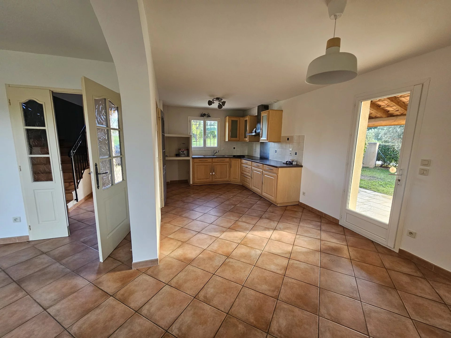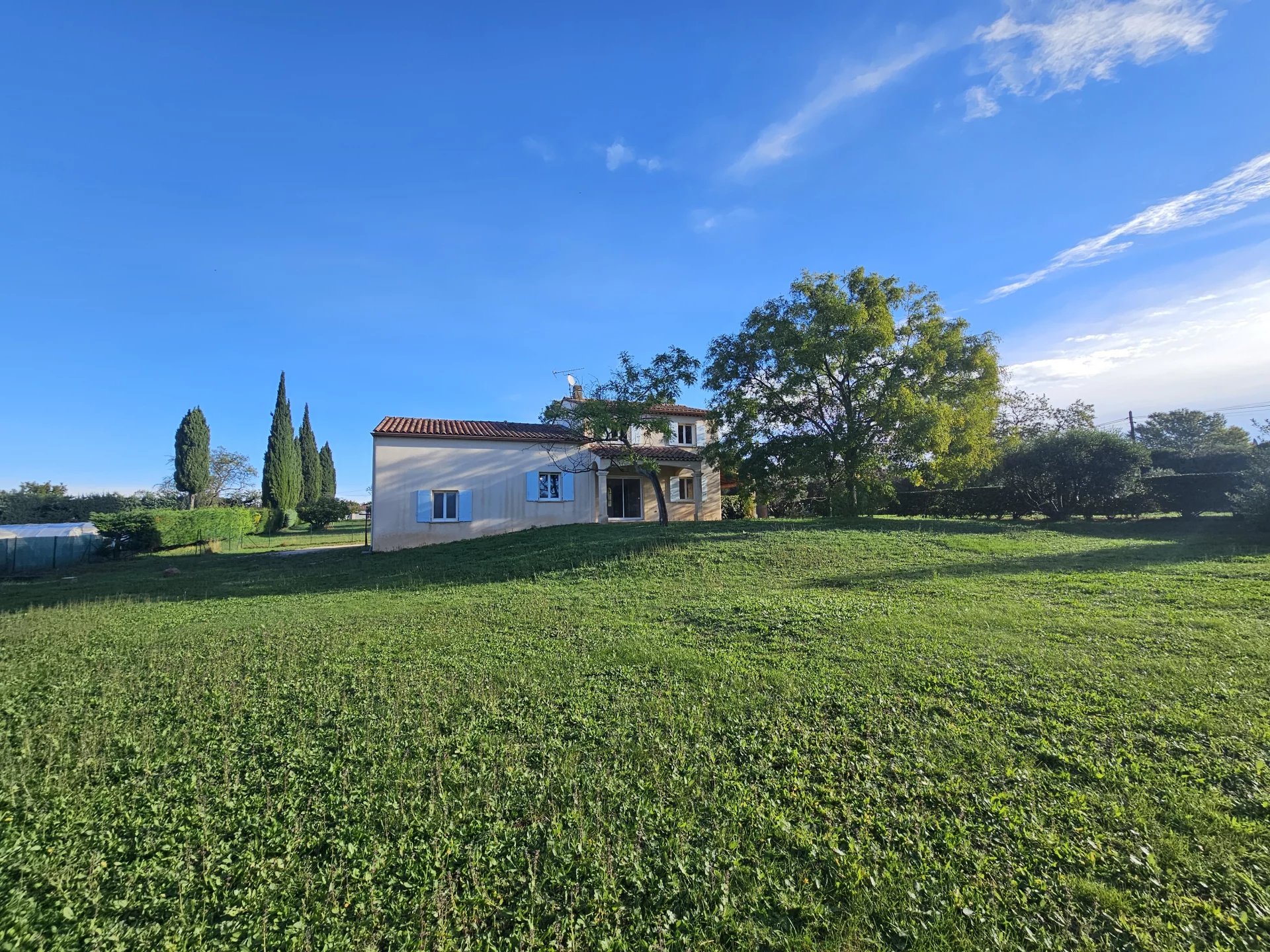 Villa disposant de 4 chambres. Un grand jardin. Aix nord en campagne et proche de l'accès autoroutier dans un environnement très calme : Chemin de l'Aubère. Sur une parcelle d'environ 3 400 m² entièrement clôturée, maison individuelle T5 de 127 m² habitables en excellent état. Elle se compose au rez de chaussée d'une pièce de vie avec cuisine ouverte entièrement meublée et équipée, une chambre disposant d' une salle de bains et d'un wc. A l'étage, 3 autres chambres, une salle de bains et un second wc. Un grand garage double attenant à la maison et un cellier. En excellement état d'entretien. Climatisation à l'étage. Portail électrique. Disponible dès à présent.