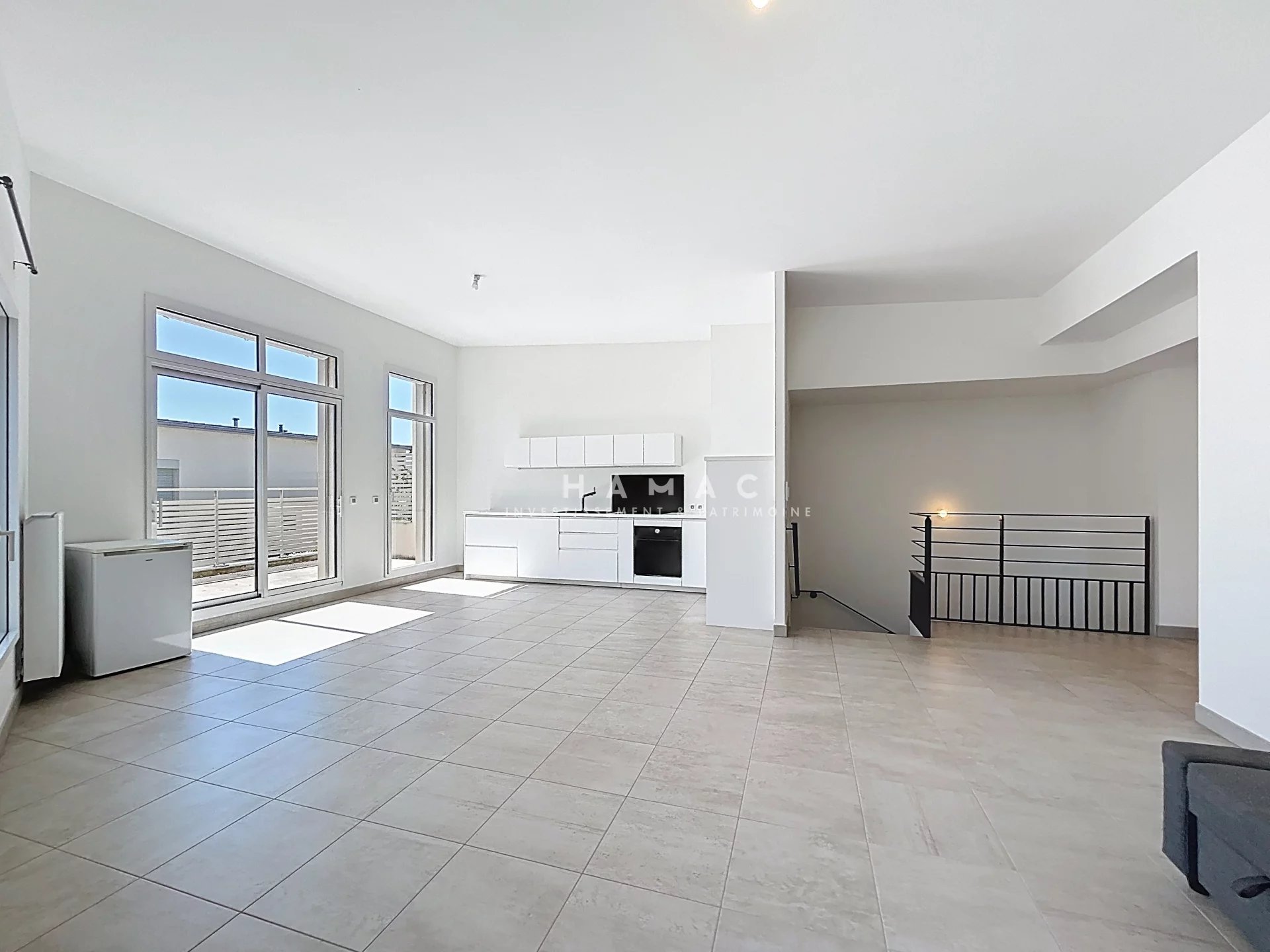 L’espace de vie, baigné de lumière, se compose d’un séjour, salle à manger, cuisine équipée de plus de 44 m², donnant accès à une agréable terrasse de plus de 7 m², idéale pour vos moments de détente.