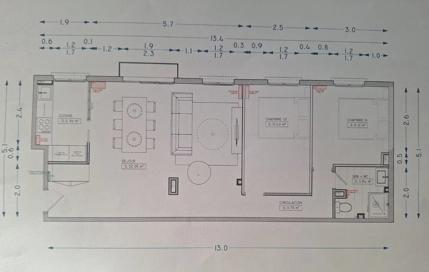 Deux chambres de 10m² (3ème chambre possible de 9,22m² en réduisant le séjour à 20m²)