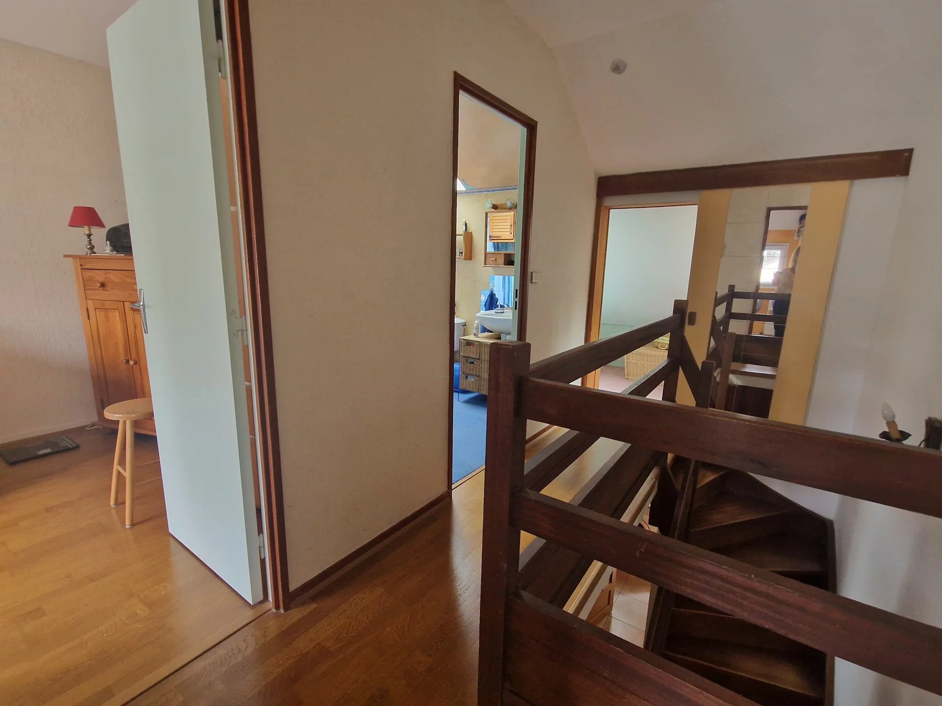 A l'étage: dégagement desservant 3 chambres avec placard, un bureau, salle d'eau et salle de bains aménagée. Garage avec grenier.