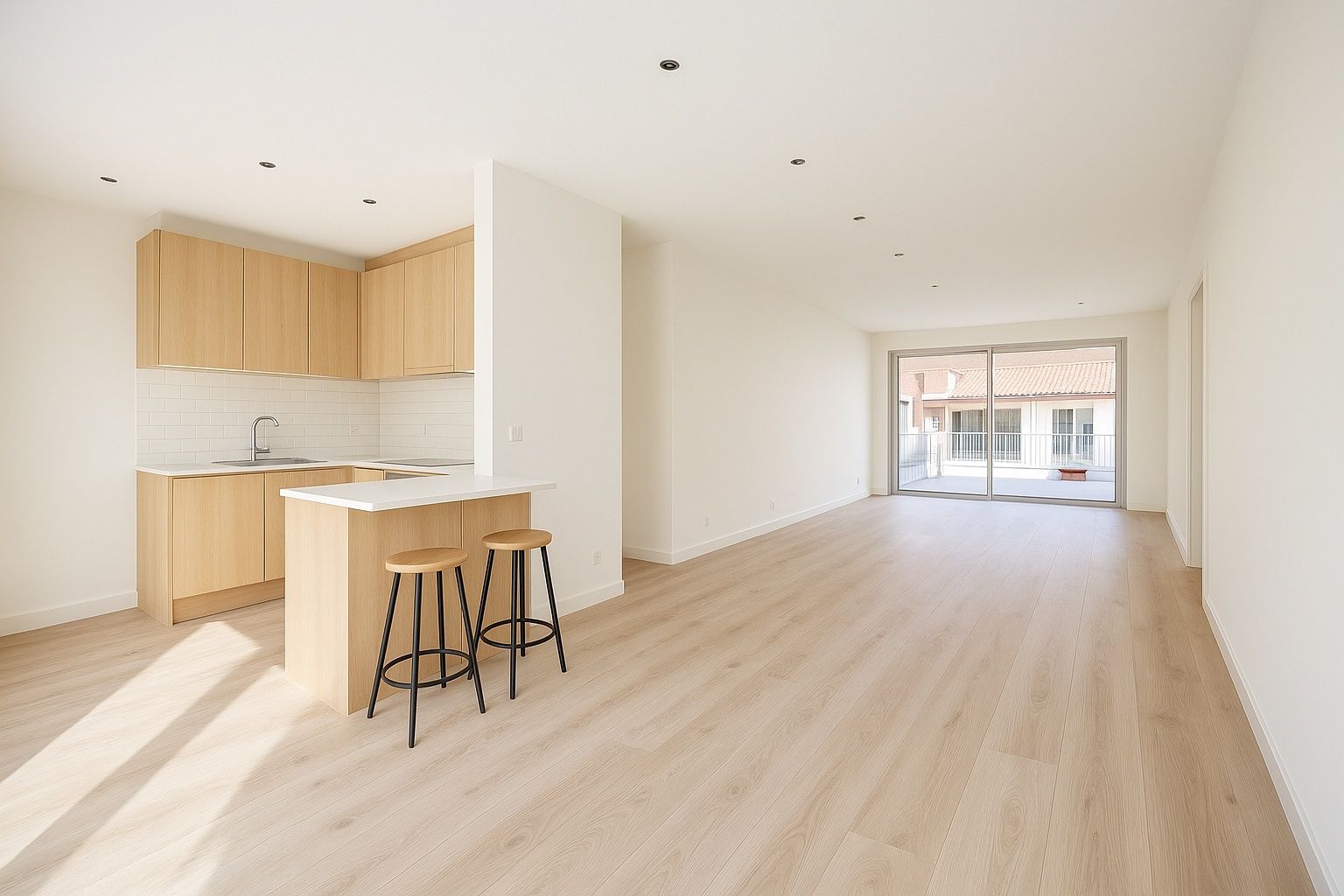 La pièce de vie traversante de 44 m² souvre sur deux terrasses de 32 m² et 20 m², offrant une agréable continuité dedans-dehors.